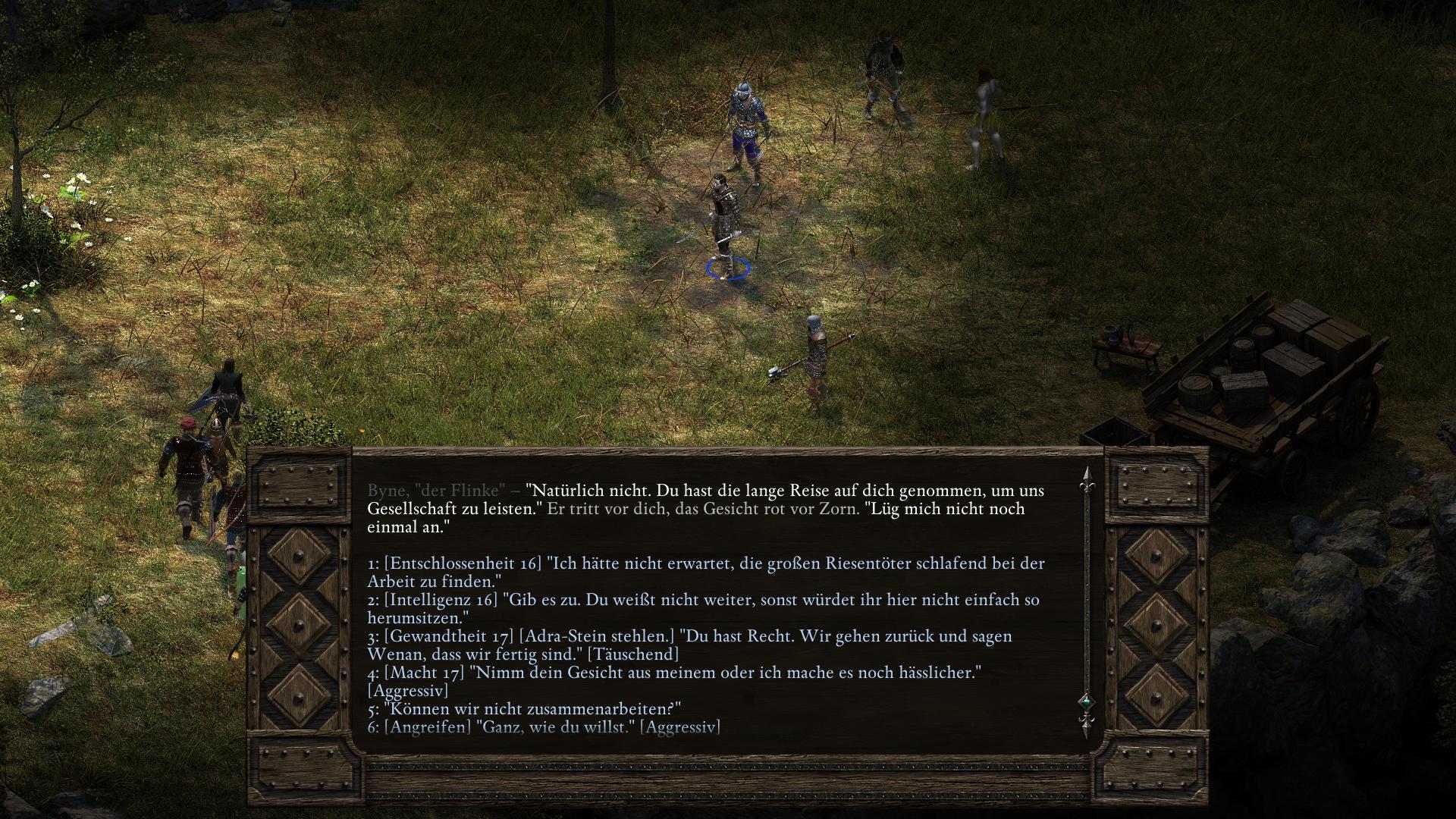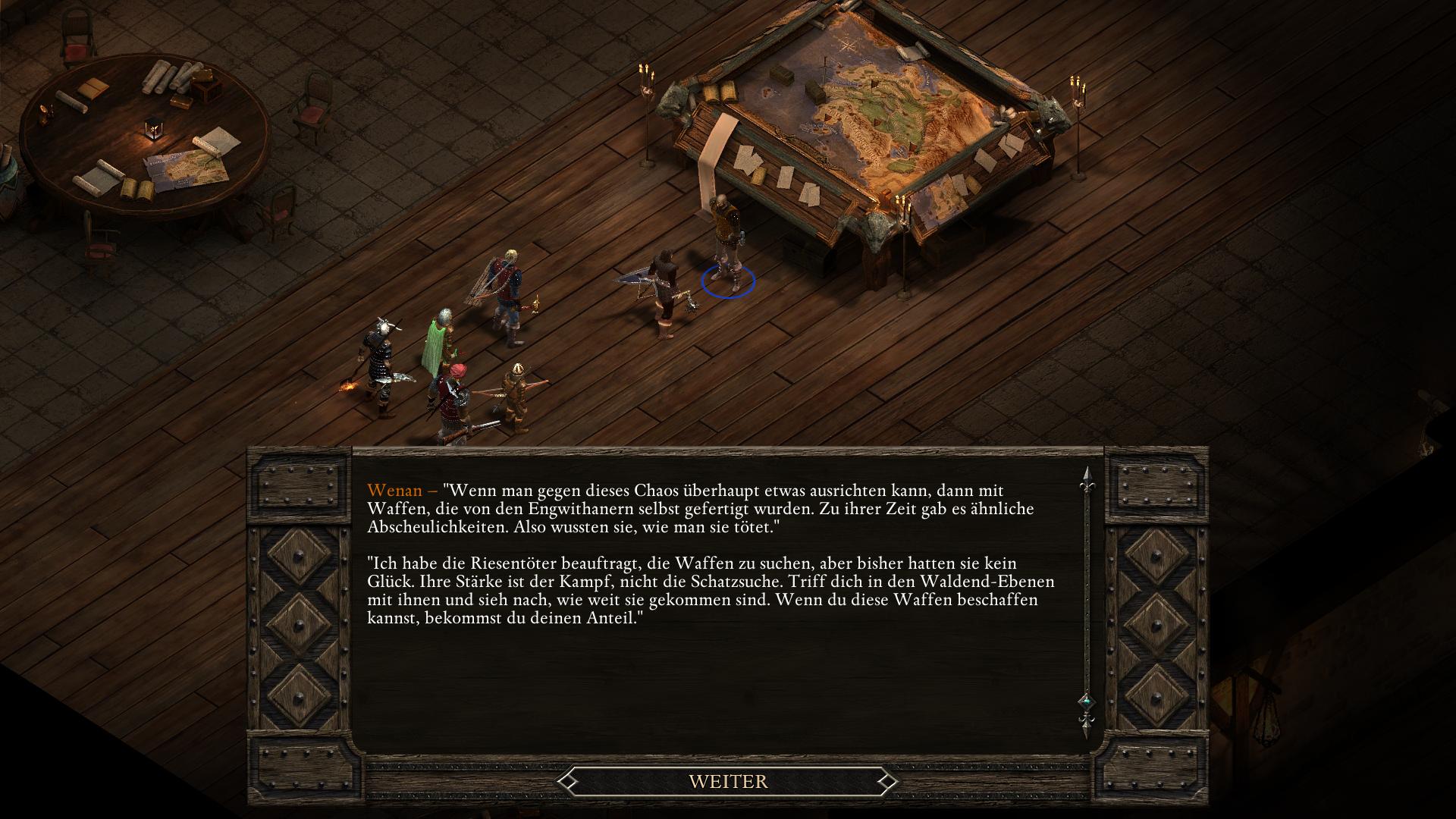 Nachdem ihr Osric seinen Ahnenharnisch (Abtrünniger Ritter Quest) wiederbeschafft habt, ist Wenan endlich gewillt euch einen Auftrag zu geben. Ihr sollt euch in den Waldend-Ebenen mit den Riesentötern treffen und anschließend die uralten engwithanischen Waffen aus Lhe a Rhemen bergen. Die Riesentöter findet ihr auf dem Plateau im Süden der Waldend-Ebenen [7]. Byne, der Flinke, will sich aber nicht ins Handwerk pfuschen lassen. Ihr könnt versuchen ihn zur Zusammenarbeit zu überreden, aber es wird euch nur mit Entschlossenheit 16, Intelligenz 16, Gewandtheit 17 oder Macht 17 gelingen. Andernfalls müsst ihr die Riesentöter bekämpfen und euch so des Adra-Steins bemächtigen. Zusammenarbeit bedeutet in dem Fall aber nur, dass sie abziehen und euch Beute durch die Lappen geht. Helfen werden sie euch auch mit den Attributen nicht.