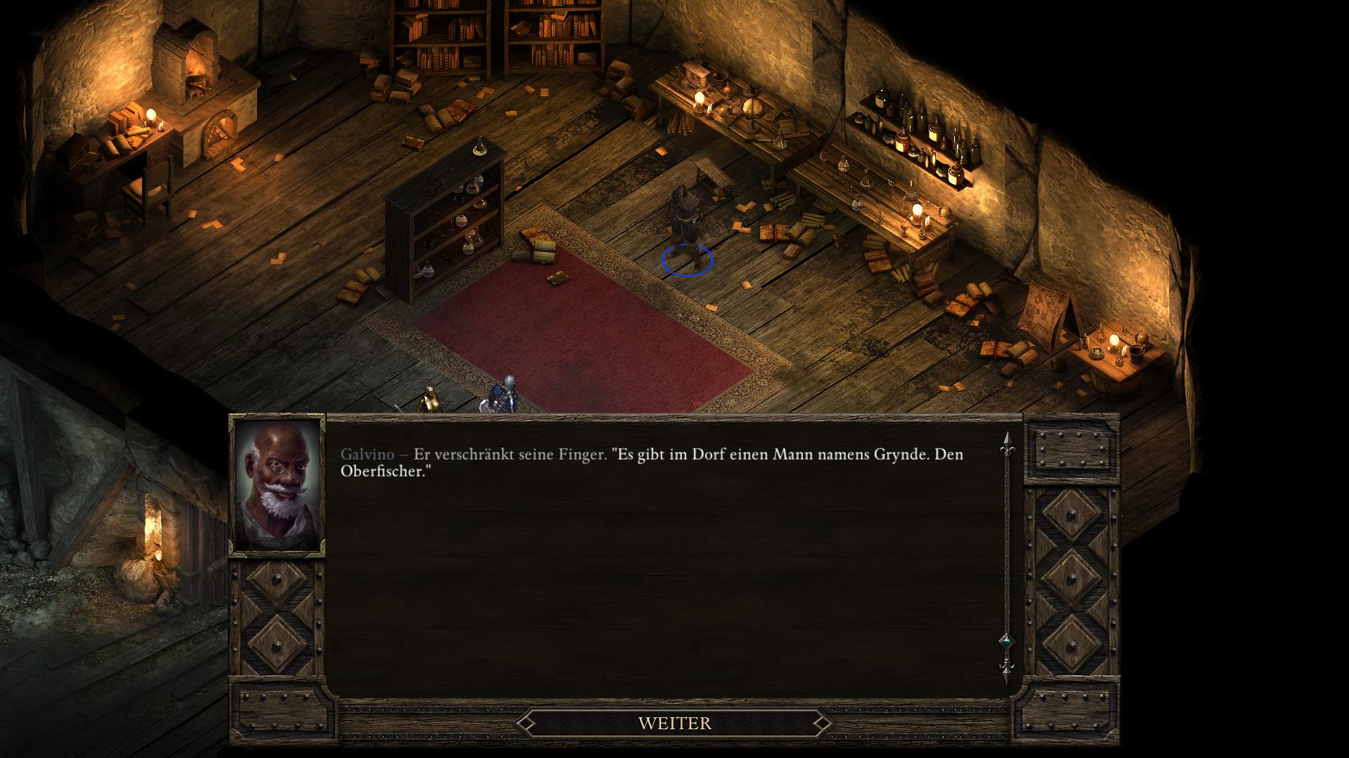 Am Ende eures Gesprächs mit Galvino in seiner Werkstatt (Galvino's Workshop) bittet er euch um einen Gefallen. Hört ihr ihn weiter an, ergibt sich die "Buße des Fischers" Aufgabe. Kehrt in Galvinos Auftrag nach Stalwart zurück und betretet wie geheißen, bei Nacht die Fischerei. In der hinteren Ecke neben dem Kaminfeuer findet ihr "Adras Armkette". Sie vermittelt euch eine Vision, über den Tod von Gryndes Schwester. An deren Ende der Mörder das Gebäude betritt und euch zur Rede stellen will. Dreht den Spieß um und lasst Grynde erklären. Er bittet darum seine Arbeit verrichten zu dürfen, um seine Schwester ehren zu können. Ihr habt an dem Punkt verschiedene Möglichkeiten die Aufgabe zu beenden.