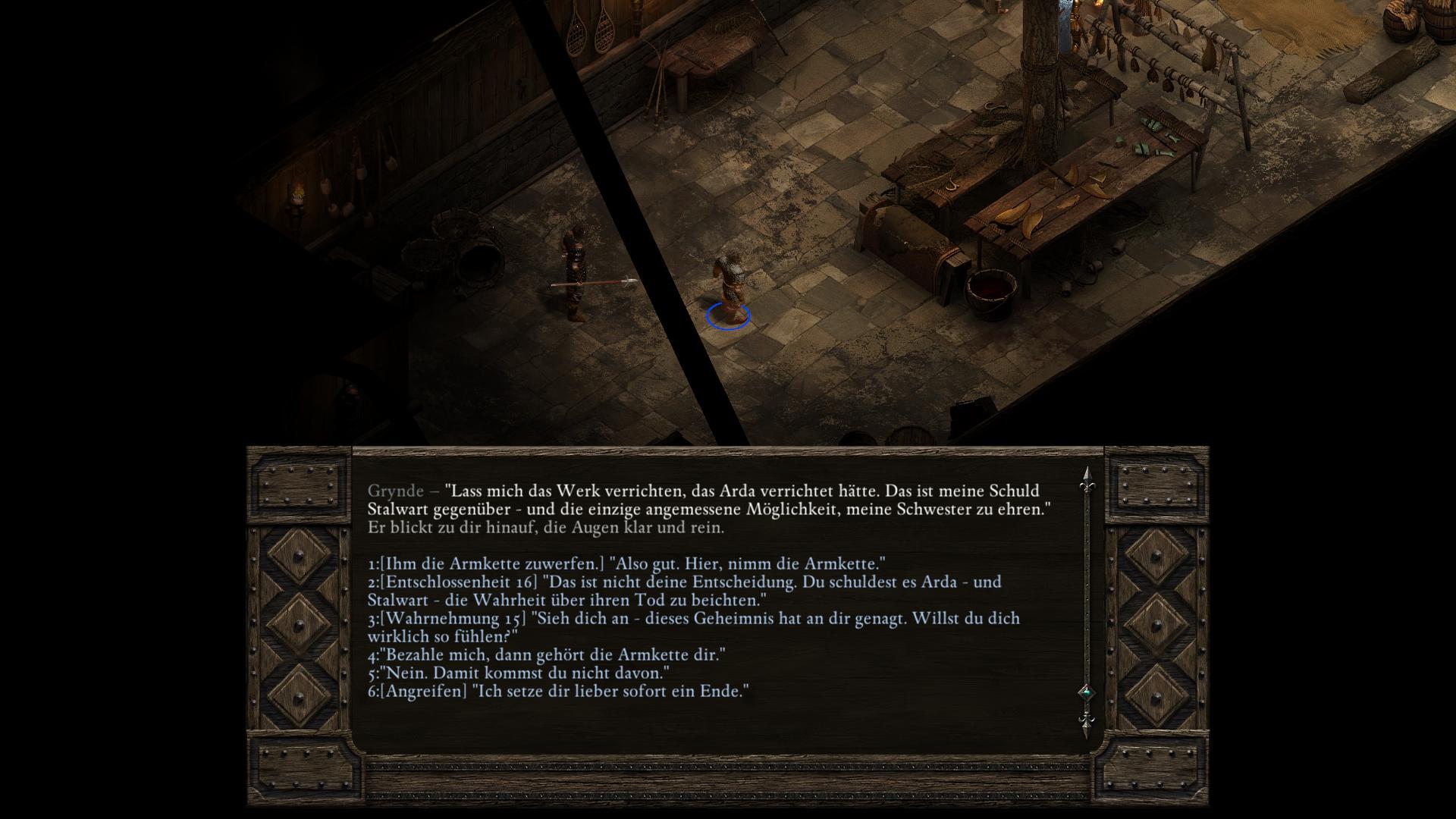 Mit "Bezahle mich, dann gehört die Armkette dir." sinkt euer Ruf in Stalwart (Gering Negativ), der in Dyrfurt steigt (Mäßig Positiv) und ihr bekommt 500 Kupfer von Grynde. - Grynde töten