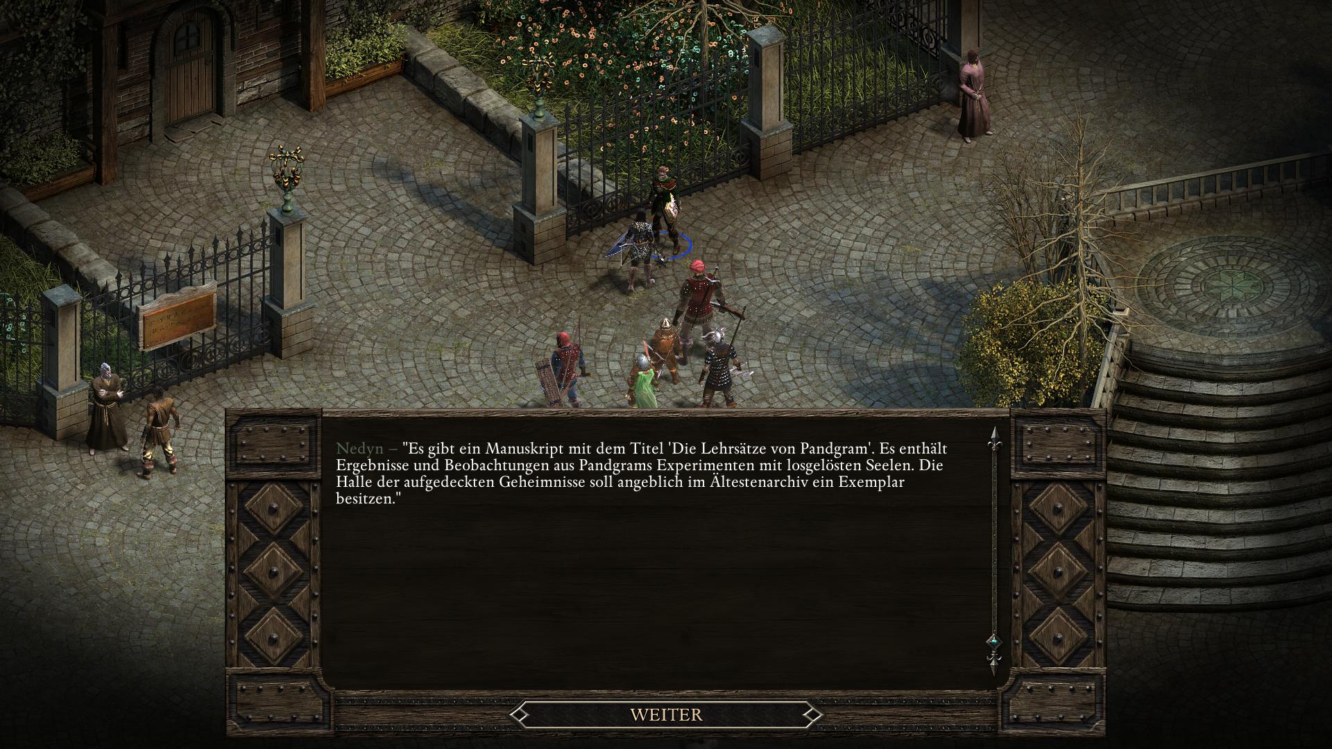 In Farnheim (Brackenbury) steht vor dem Sanatorium im Nordwesten eine Beseelerin (Animancer) namens Nedyn, die mit ihrem Studium der Seelenbefestigung nicht weiter kommt, weil ihr ein Manuskript mit dem Titel "Die Lehrsätze von Pandgram" (Theorems of Pandgram) fehlt. Das einzige Exemplar davon gibt es angeblich im Ältestenarchiv der Halle der aufgedeckten Geheimnisse (Hall of Revealed Mysteries). Doch die Bibliotheksleiterin Grimda hat etwas gegen Beseelung und deshalb will sie es Nedyn nicht aushändigen. Woraufhin ihr Nedyn eure Hilfe anbieten könnt. Begebt euch zur Halle der aufgedeckten Geheimnisse im Nordwesten des Kupferwegs. Wo euch dann zwei Möglichkeiten offen stehen.