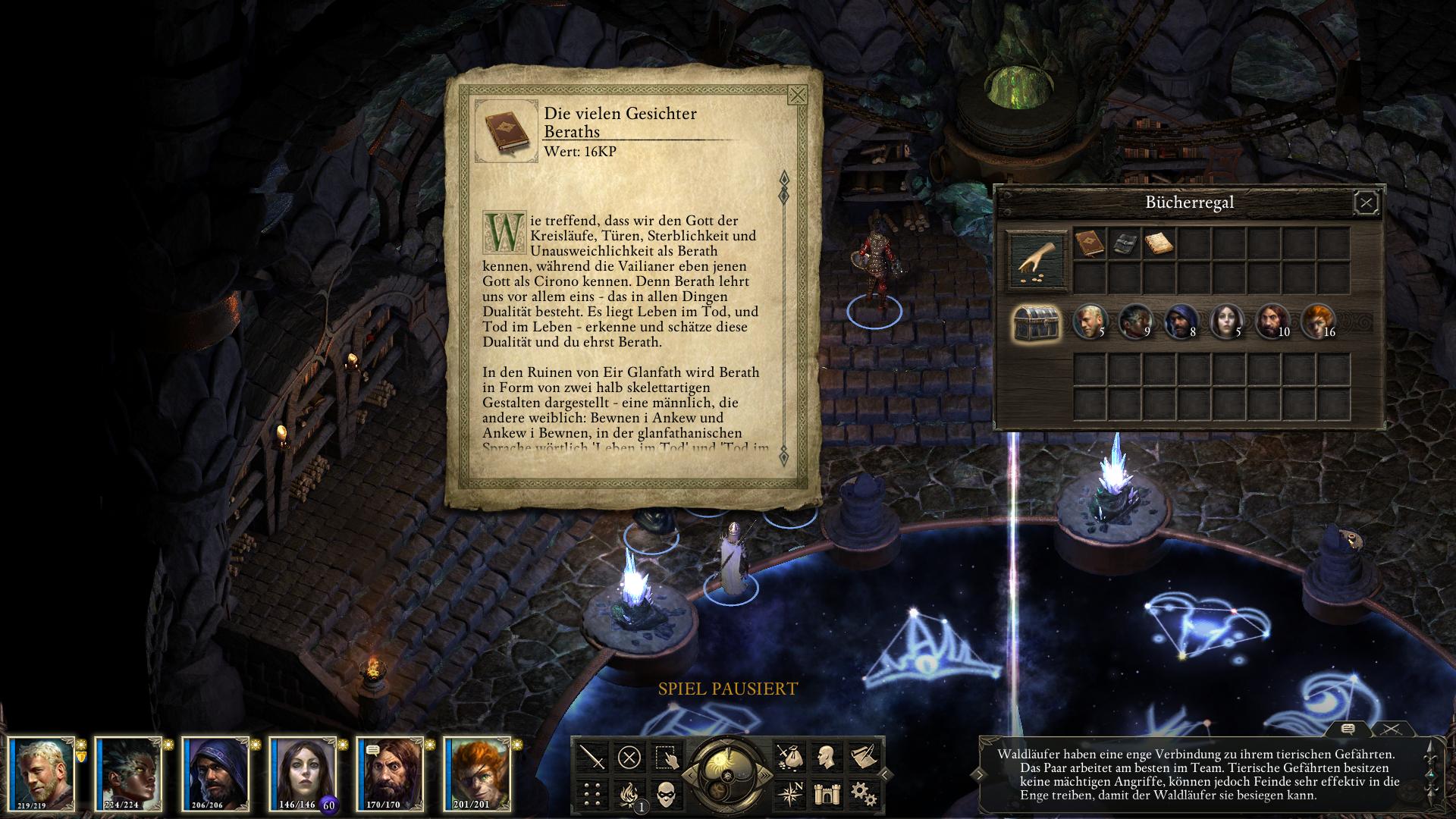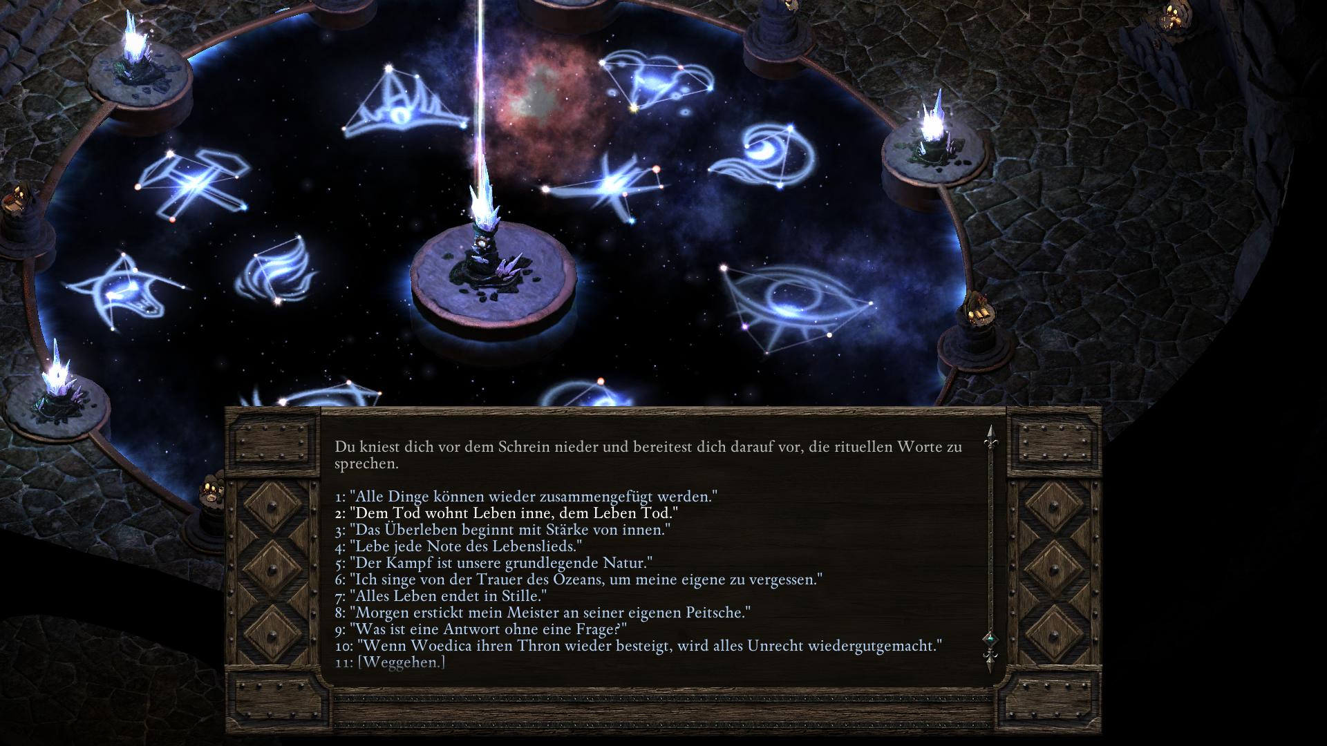 Wie bei allen Götter-Quests müsst ihr zunächst zum jeweiligen Gott beten, damit dieser euch die Aufgabe erteilt. Nehmt als erstes das Buch "Die vielen Gesichter Beraths" aus dem mittleren Regal [1], um das richtige Gebet zitieren zu können. Holt euch als nächstes den Leuchtenden Adra-Splitter vom Podest rechts [6] und platziert ihn in der Mitte, damit der Raum zum Leben erwacht. Betet nun an der rechtsunteren Säule [10] zu Berath. Wählt dafür die folgenden Floskeln: