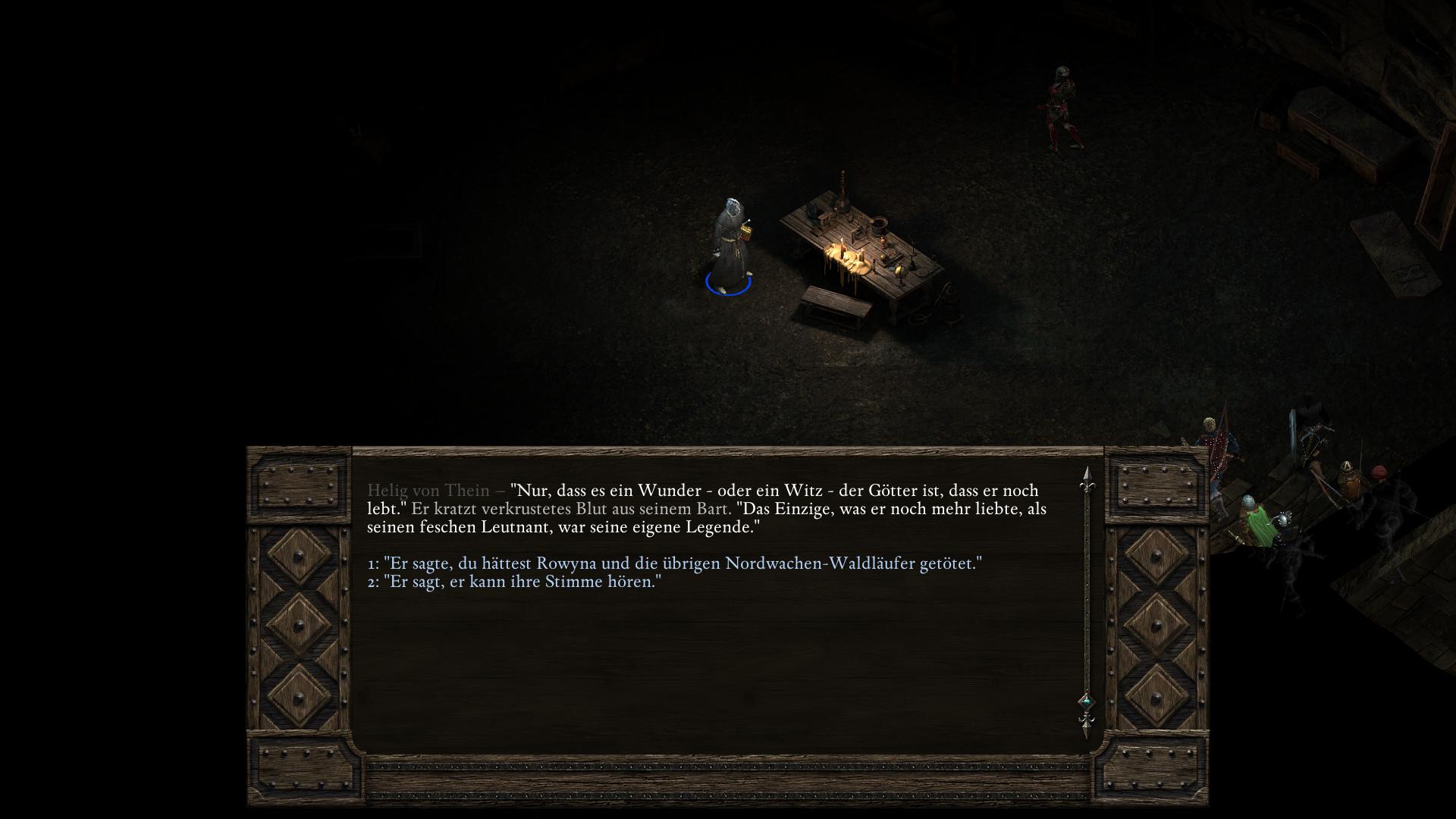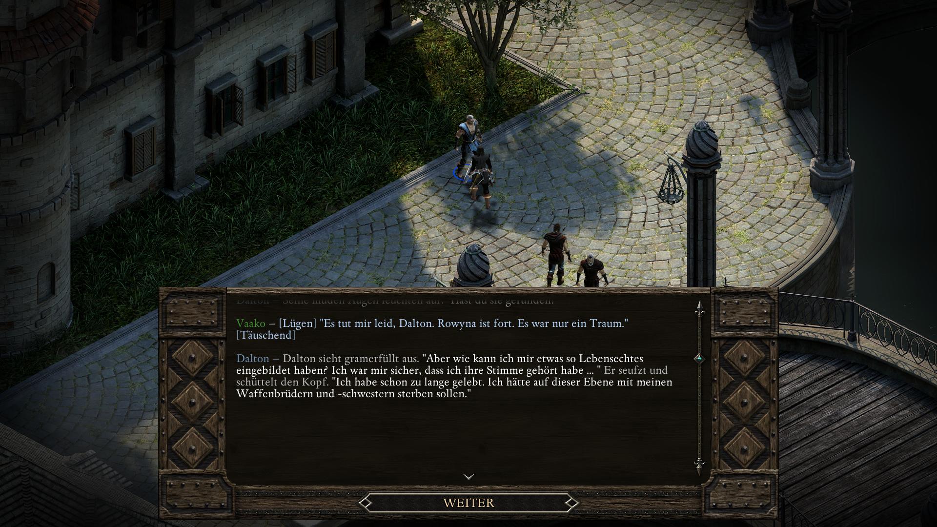 Ich bin heute in Kupferweg dem pensionierten Abenteurer Dalton begegnet. Er hört in letzter Zeit immer wieder die Stimme von Rowyna, seiner Geliebten und Kameradin, die vor fast 60 Jahren an seiner Seite gestorben ist.