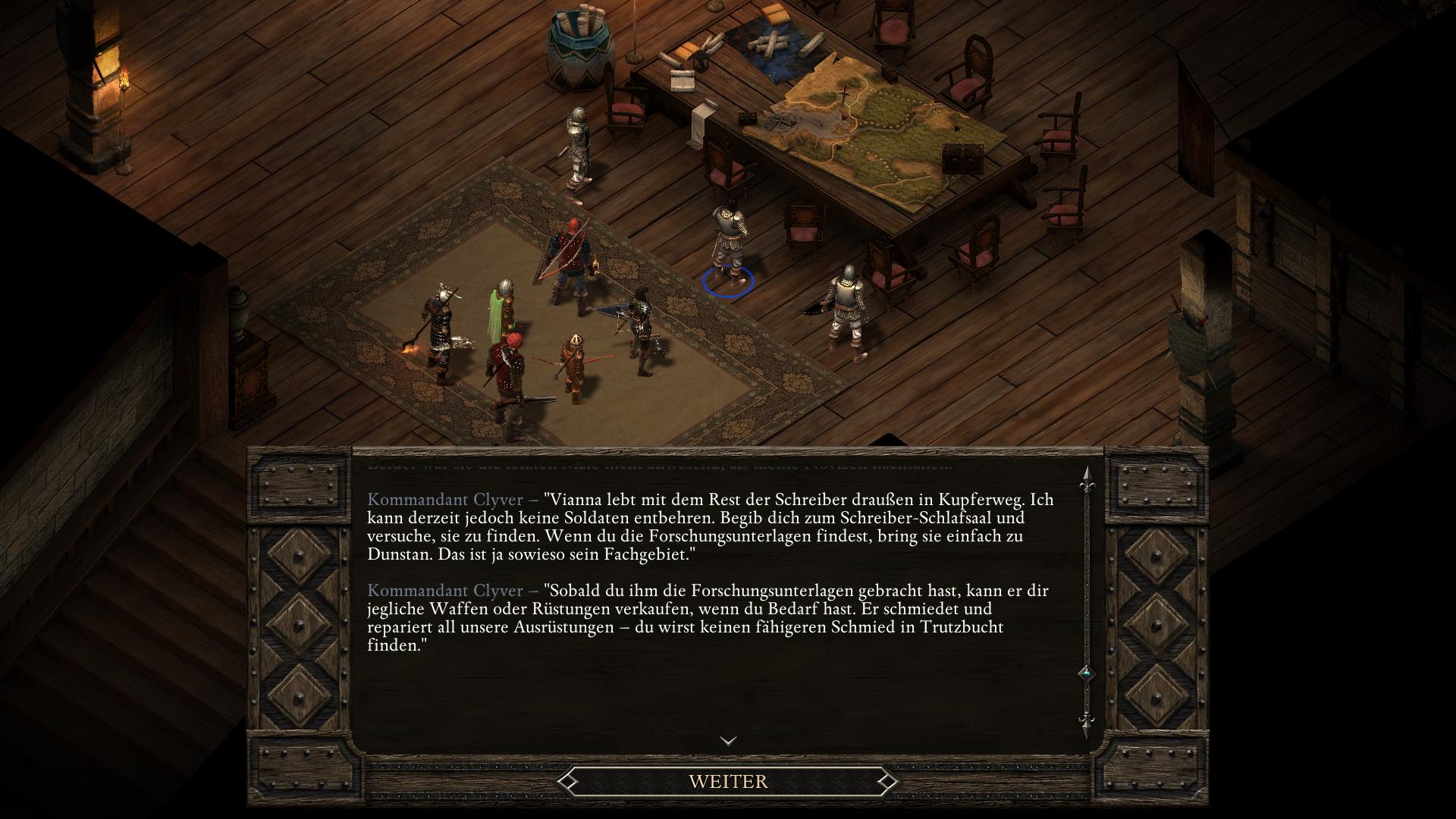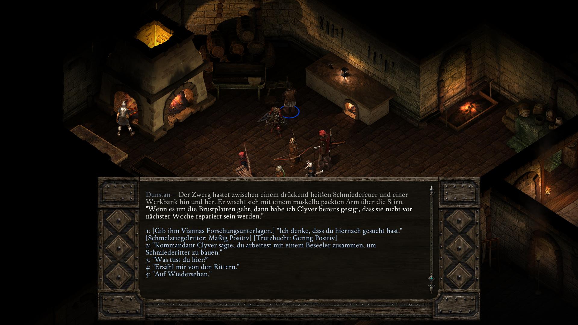 Kommandant Clyver von den Schmelztiegelrittern hat einen Plan, um den Mangel an ausgebildeten Soldaten anzugehen. Er hat Schmiedemeister Dunstan gebeten, Schmiederitter zu bauen - Soldaten, die aus Panzerrüstungen gebaut sind. Dunstan hat die Rüstung hergestellt und braucht jetzt nur noch Viannas Forschungsunterlagen, um das Projekt abzuschließen.