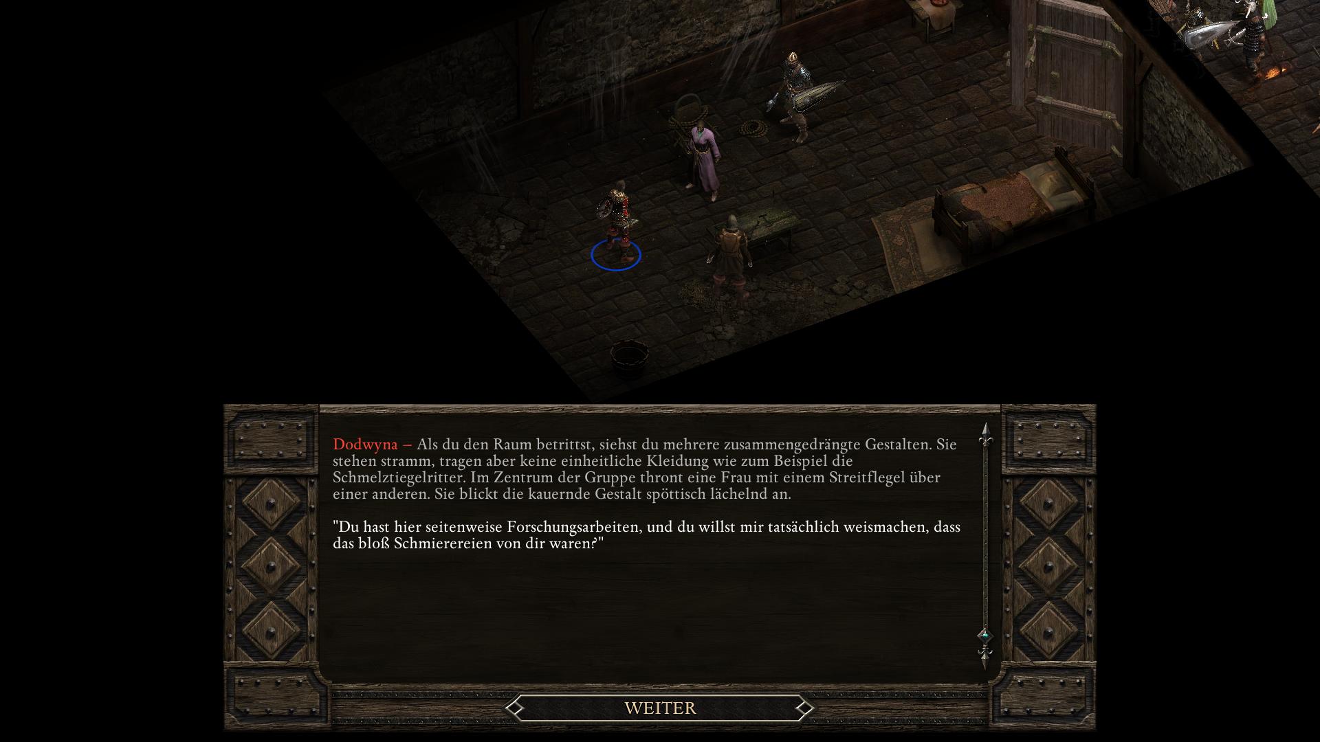 Für die Ewigkeit ist die erste von zwei Quests, um die Gunst der Schmelztiegelritter (Crucible Knights) zu erlangen. Ihr müsst euch im Verlauf des 2. Aktes von Pillars of Eternity für eine der drei Fraktionen Trutzbuchts (Defiance Bay) entscheiden. Sobald ihr "Stahlwinde" (zweite Quest) für die Schmelztiegelritter abschließt, habt ihr damit die Fraktion gewählt und könnt euch nicht mehr für die Dutzenden oder das Haus Doemenel entscheiden! Wie dem auch sei, könnt ihr die "Für die Ewigkeit" Quest ohne derartige Folgen erledigen und erlangt dadurch Zugriff aufs Ausrüstungsgeschäft der Schmelztiegelritter.