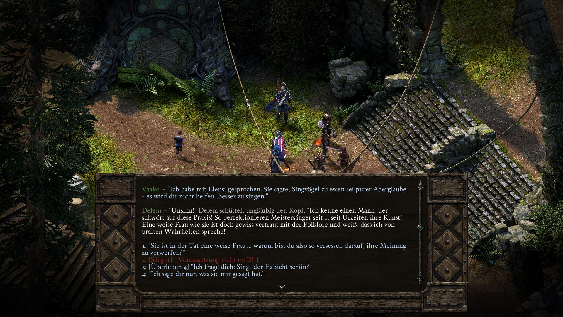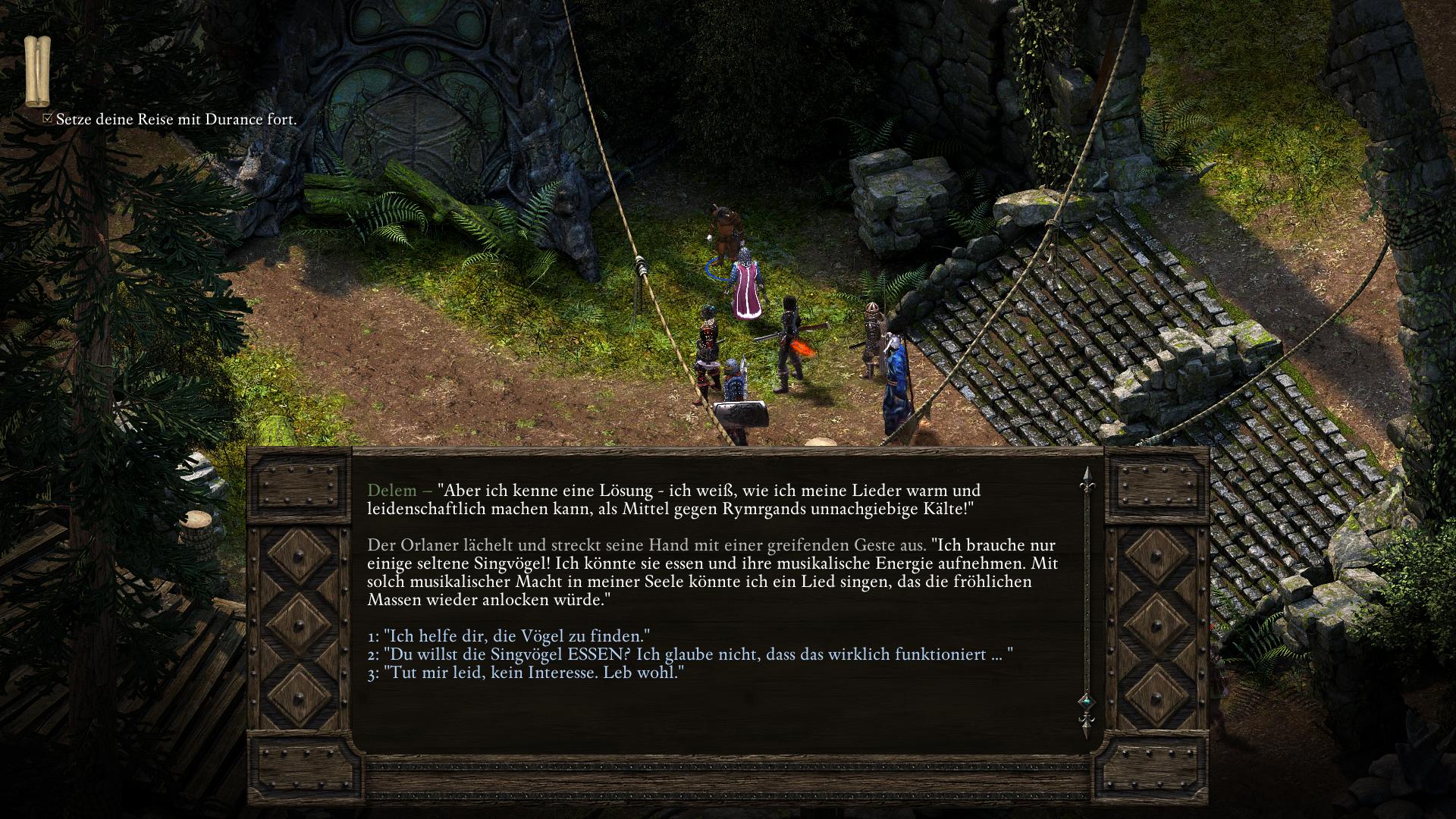 Der Sänger Delem im Südwesten [7] des Altlied Bezirks (Oldsong) von Zwillingsulmen (Twin Elms), ist in dem Glauben, er könne den Gesang der Singvögel erlernen, indem er sie verspeist. Zur Lösung dieser Aufgabe könnt ihr Delem entweder eines besseren belehren, oder ihm tatsächlich die gewünschten drei Vögel beschaffen.