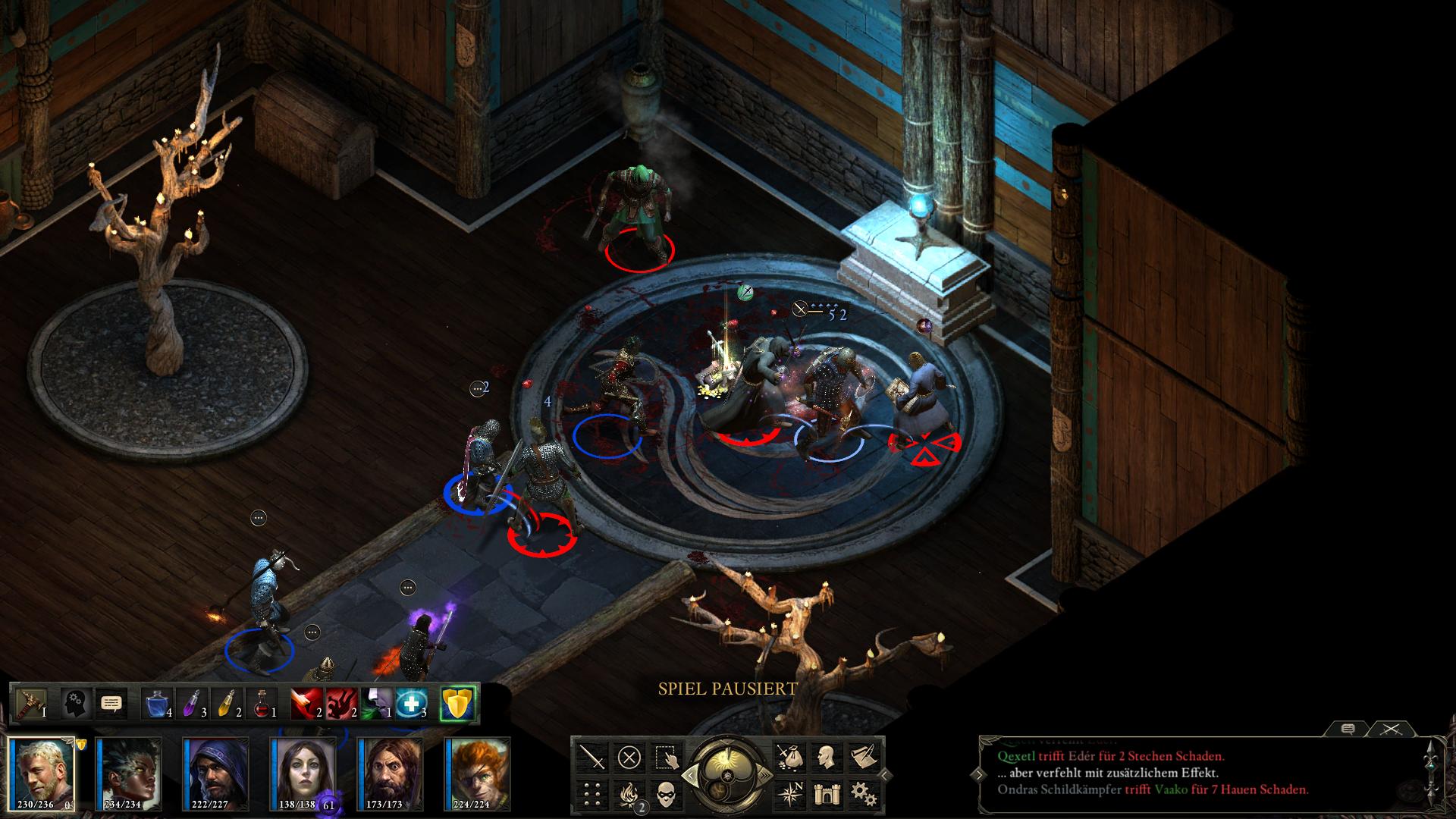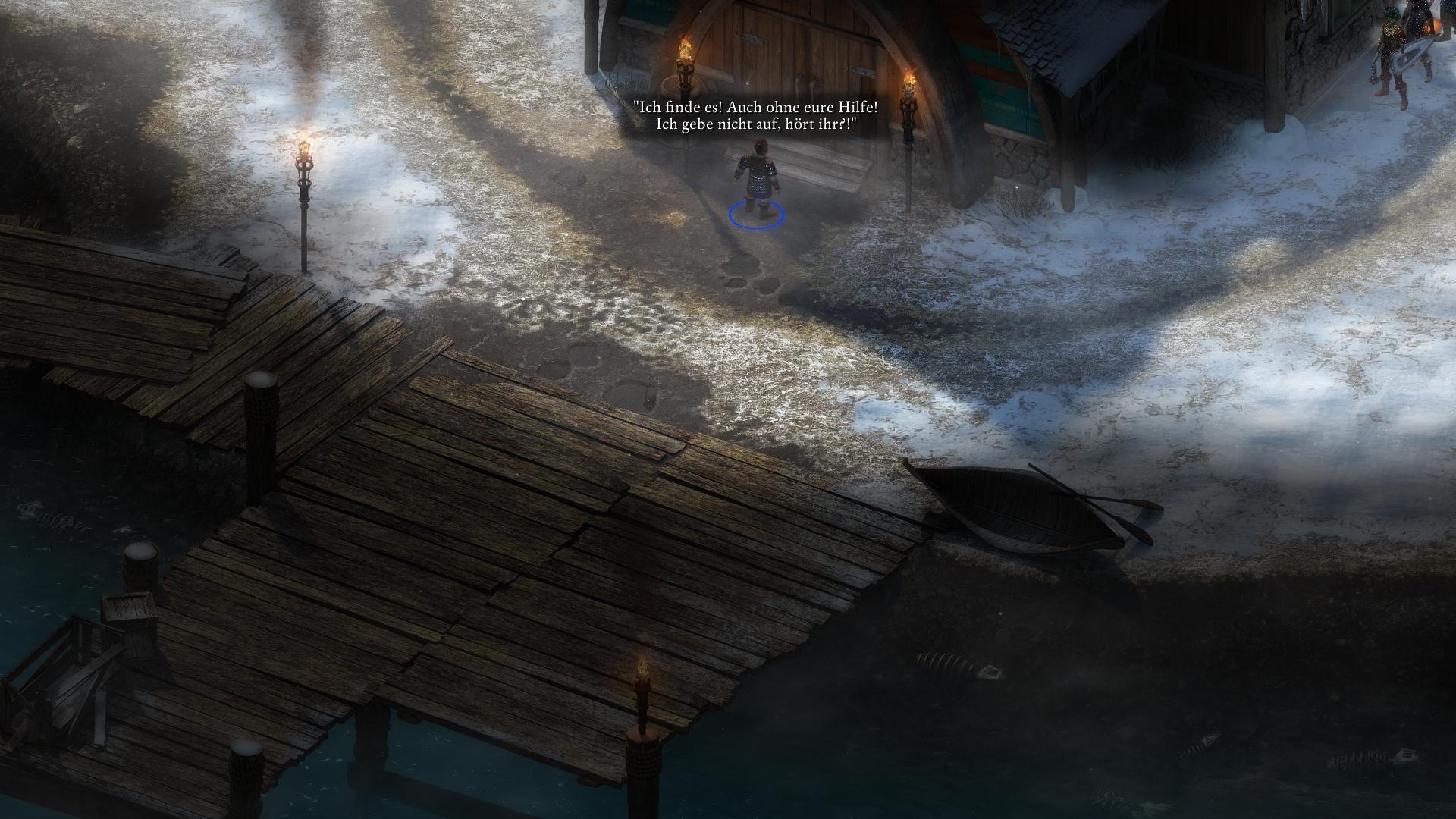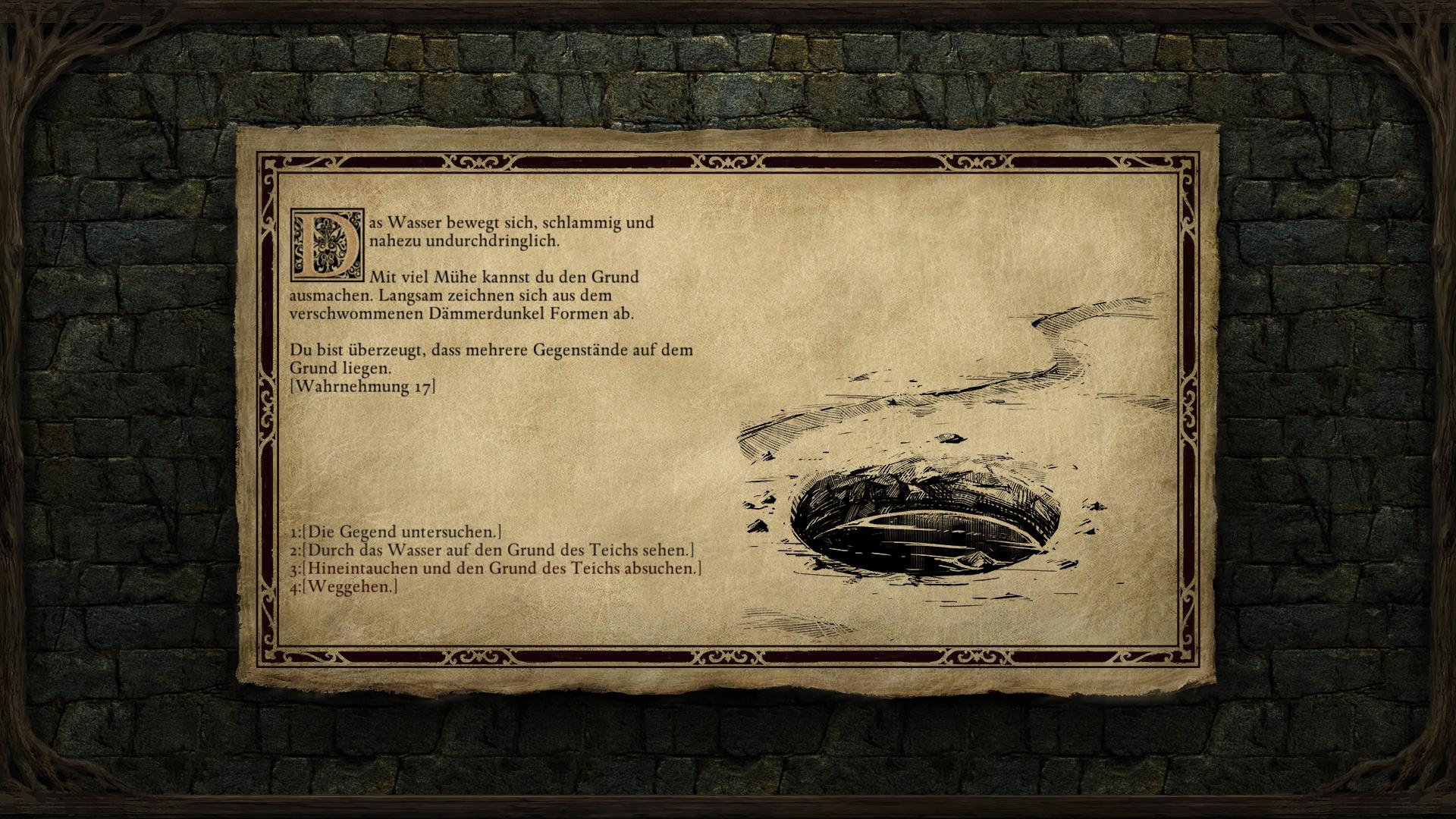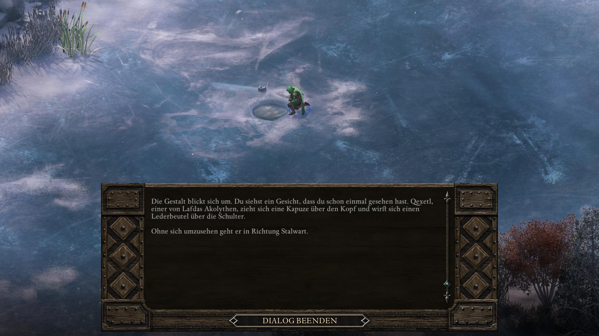 Verlasst ihr den Tempel und kommt kurz darauf noch mal vorbei, seht ihr wie Lafdas Akolyt Qexetl das Gebäude verlässt und nach Westen aufbricht. Im zentralen See des Rotwalds entdeckt ihr Qexetl erneut, wie er an einem Loch im zugefrorenen See hockt und dann mit einem Lederbeutel über der Schulter verschwindet. Untersucht ihr daraufhin das Aumaua große Loch, könnt ihr mit Wahrnehmung 17 mehrere Gegenstände auf dem Grund des Sees ausmachen. Aber auch ohne diese Erkenntnis, könnt ihr ein Gruppenmitglied auf den Grund des Sees hinab tauchen lassen. Damit der Jenige beim Tauchgang Erfolg hat, muss er mindestens Verfassung 16 besitzen, was von den normalen Gefährten nur Eder hat. Habt ihr den zufällig nicht in der Truppe und euer Hauptcharakter besitzt ebenfalls weniger als 16 Verfassung, dann hilft nur der Bollwerk gegen die Elemente Zauber eines Zauberers. Der gleichnamige Trank funktioniert nicht, da er nur im Kampf eingenommen werden kann. Auf diese Weise bergt ihr mehrere Kisten aus dem See, die jedoch alle nur mit Steinen gefüllt sind! Wenige Schritte westlich vom Loch im Eis ist übrigens ein Versteck in der Felswand.