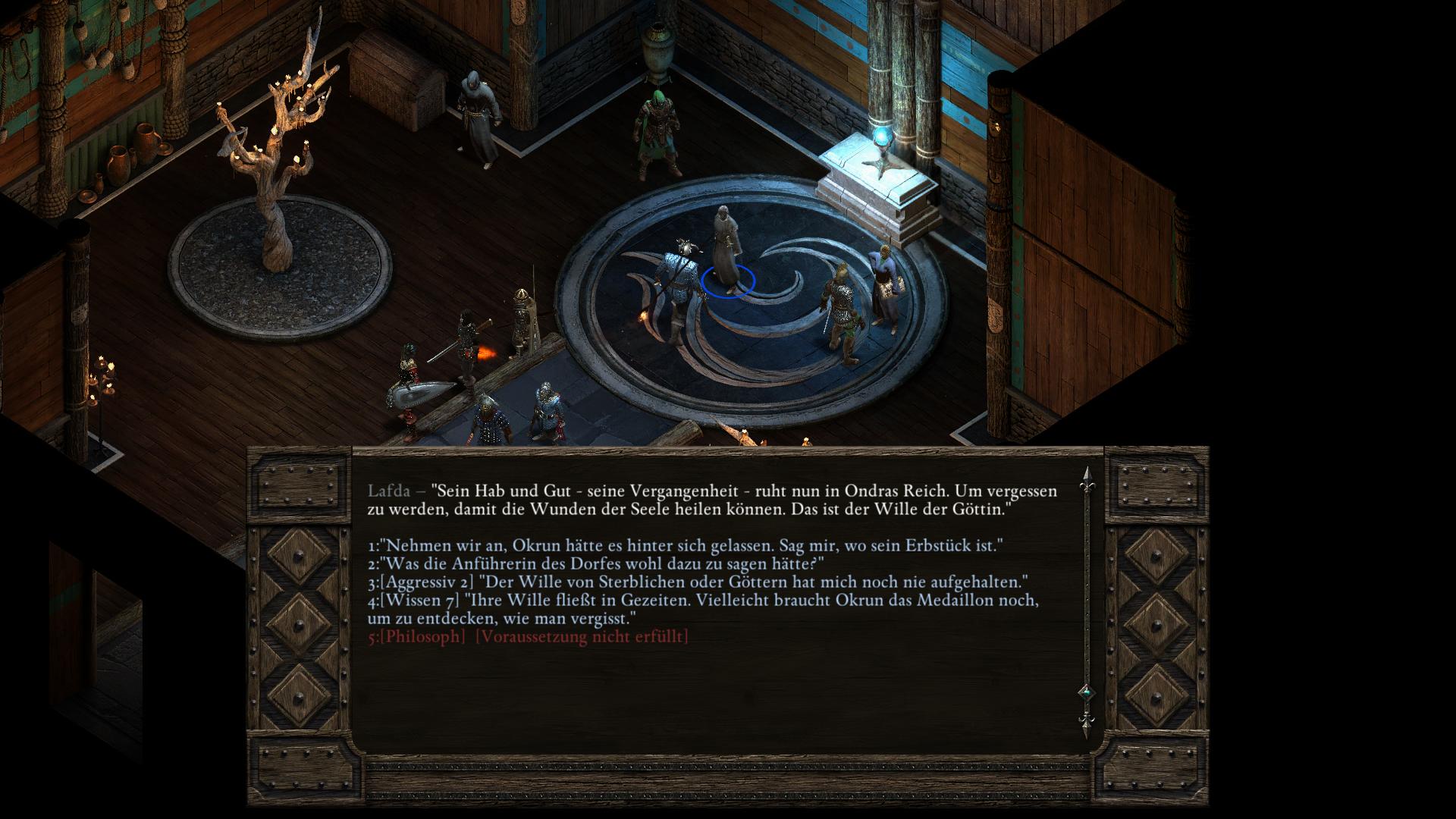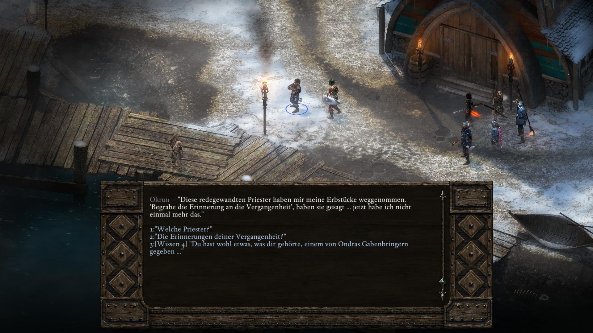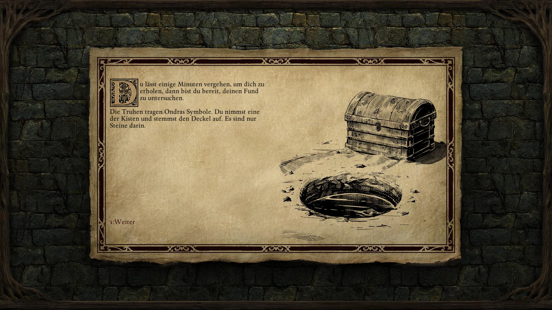 Der Zwerg will sein Medaillon von den Ondra Priestern zurück haben. Doch bei euren Vermittlungsgesprächen beharrt die Priesterin Lafda darauf, dass Okrun loslassen muss um zu vergessen und sein Medaillon bereits an Ondra übergeben wurde. Einzig der Gabenbringer Ixtli wüsste, wo die Opfergaben für die Fürstin abgelegt werden. Aber Ixtli ist von seiner letzten Reise nicht zurückgekehrt.