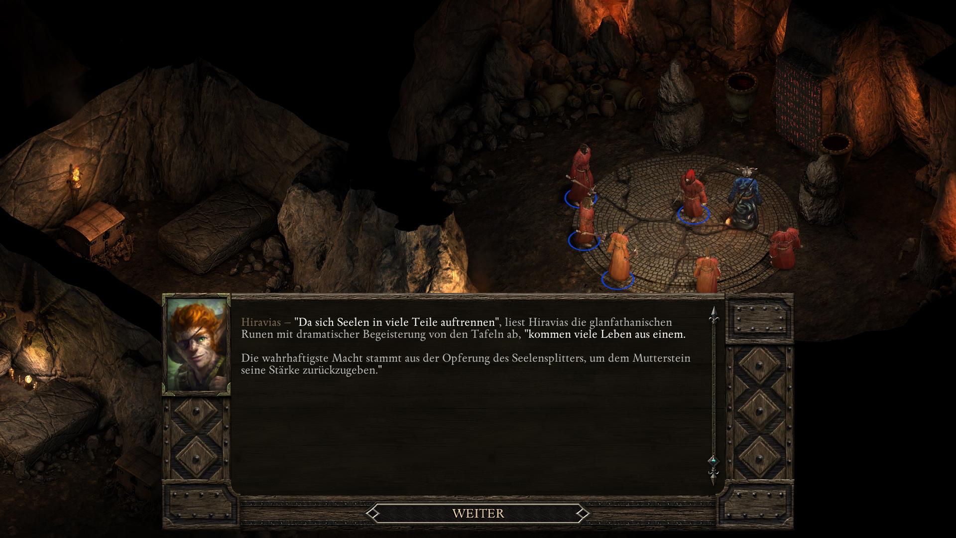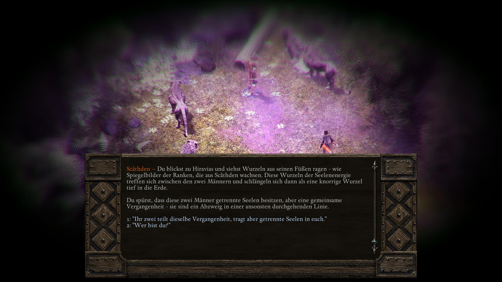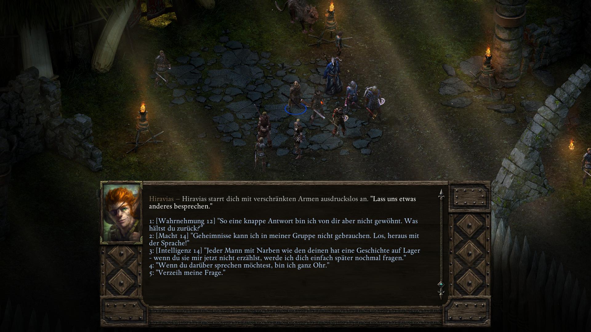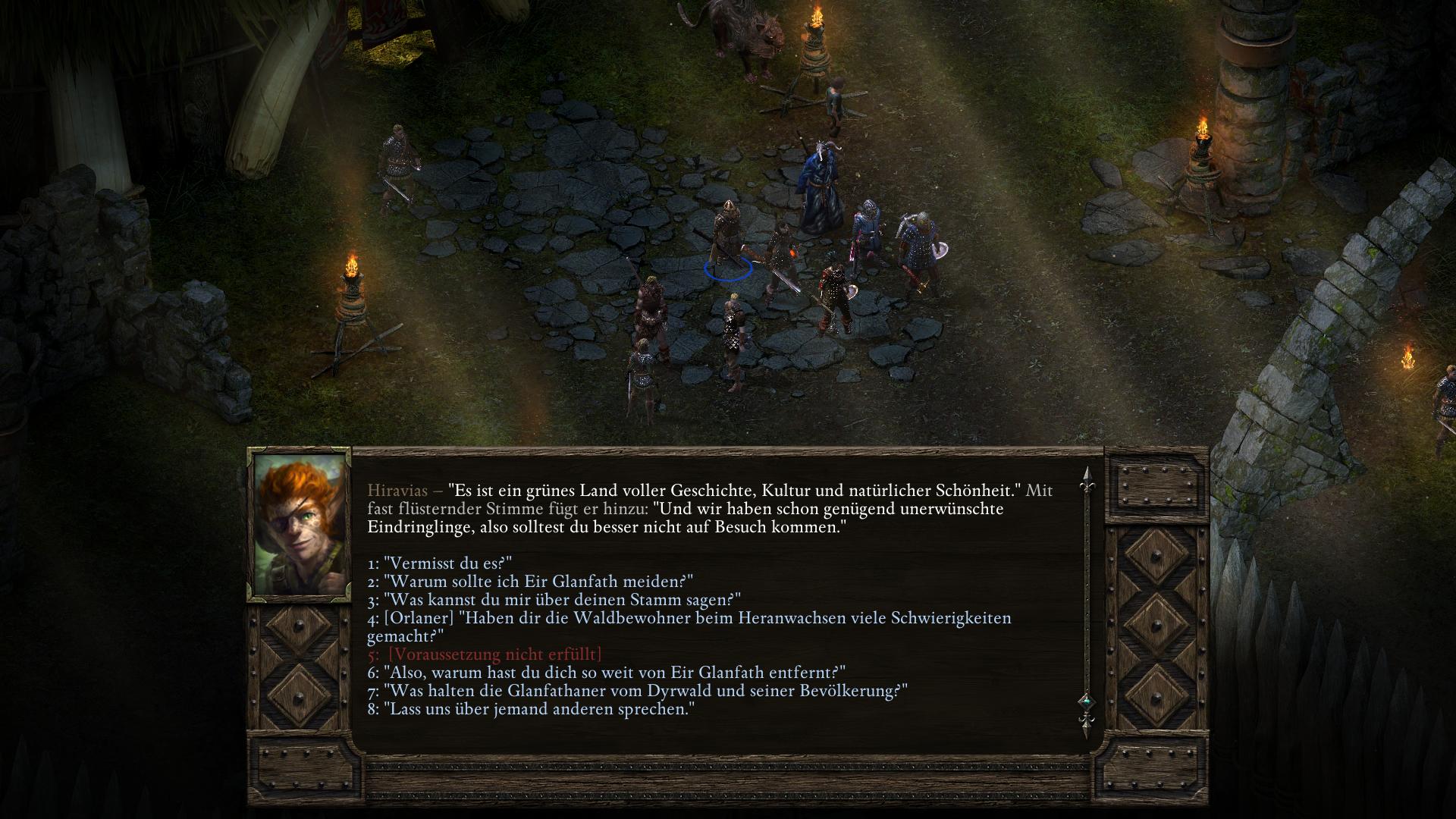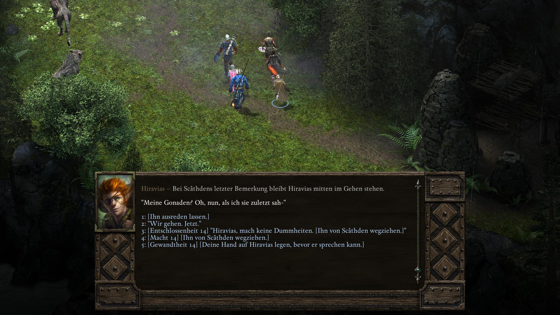 In einem persönlichen Gespräch Hiravias (Portrait anklicken und dann das Gespräch Symbol aus der Buttonleiste wählen) könnt ihr den Druiden fragen, warum er sich von Eir Glanfath entfernt hat. Möglicherweise öffnet sich Hiravias euch gegenüber nicht darüber. Mit Wahrnehmung 12, Macht 14 oder Intelligenz 14 könnt ihr es jedoch provozieren. Versucht einen der Werte durch Buffs (Nahrung/Schlafen) zu erhalten, falls ihr ihn nicht generell habt. Hiravias erzählt euch dann von seinem Kampf mit dem Initiationsritual seiner Druidenausbildung. Es stellte sich heraus, dass Hiravias zweite Form ein Herbst-Stelgaer ist, eine Art Seelenkanibale. Deshalb verstoß ihn sein Stamm. Als ihr ihn traft, war Hiravias gerade auf dem Weg zu den Druiden in Zwillingsulmen (Twin Elms). Dieser Schritt bleibt euch bis zum dritten Akt von Pillars of Eternity verwehrt.