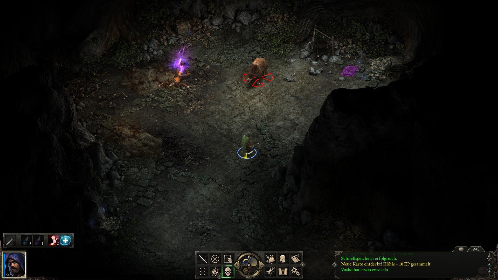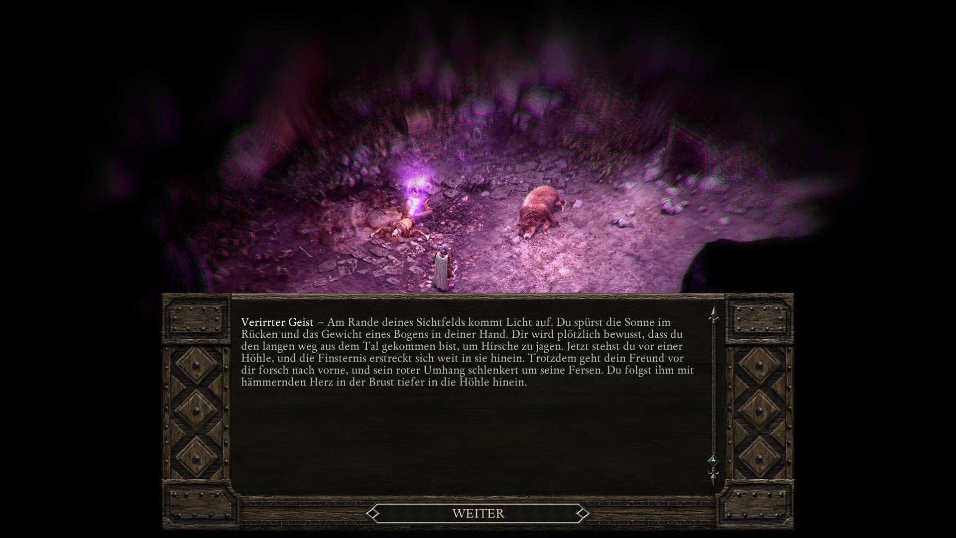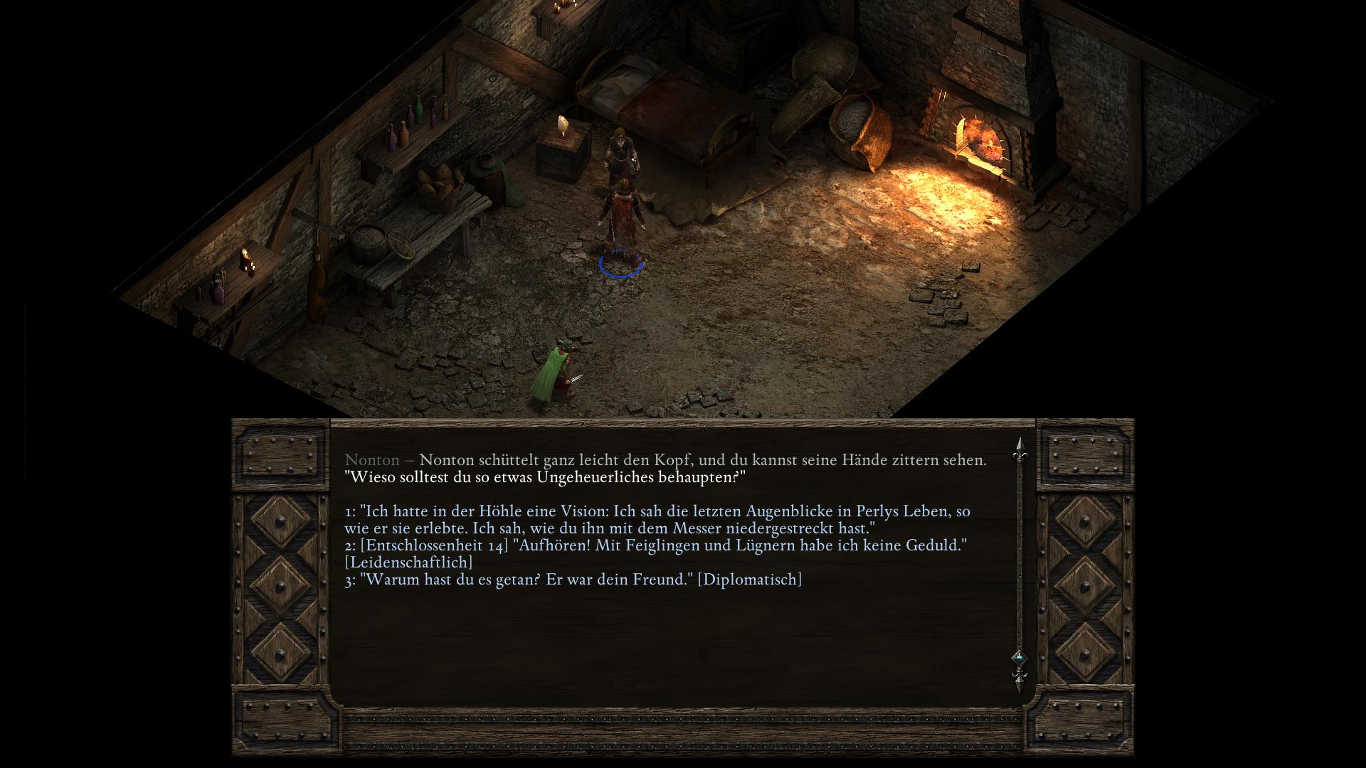 Im Süden von Talholz trefft ihr an der Brücke Nonton [7]. Er erzählt euch von dem Schicksal seines Freundes Perly, den ein riesiger Bär erlegt hat. Zum Zeitpunkt der Erzählung seid ihr vermutlich allein und solltet so nicht zur Bärenhöhle [2] aufbrechen. Geht zunächst weiter ins Goldtal, holt euch da Eder und Aloth in eure Gruppe und/oder heuert selbst erstellte Gruppenmitglieder in der Schänke zum Schwarzen Hund an. Streckt den Bären nieder und erkundet die Seele des Leichnams. Der Verirrte Geist vermittelt euch eine etwas andere Szene. Nonton hat ihn hinterrücks erstochen und sich dann aus dem Staub gemacht. Nontons Lager im Süden des Talholzes ist daraufhin verlassen. Aber ihr findet in seinem Zelt eine gefaltete Notiz von Ingroed. Begebt euch zurück ins Goldtal.