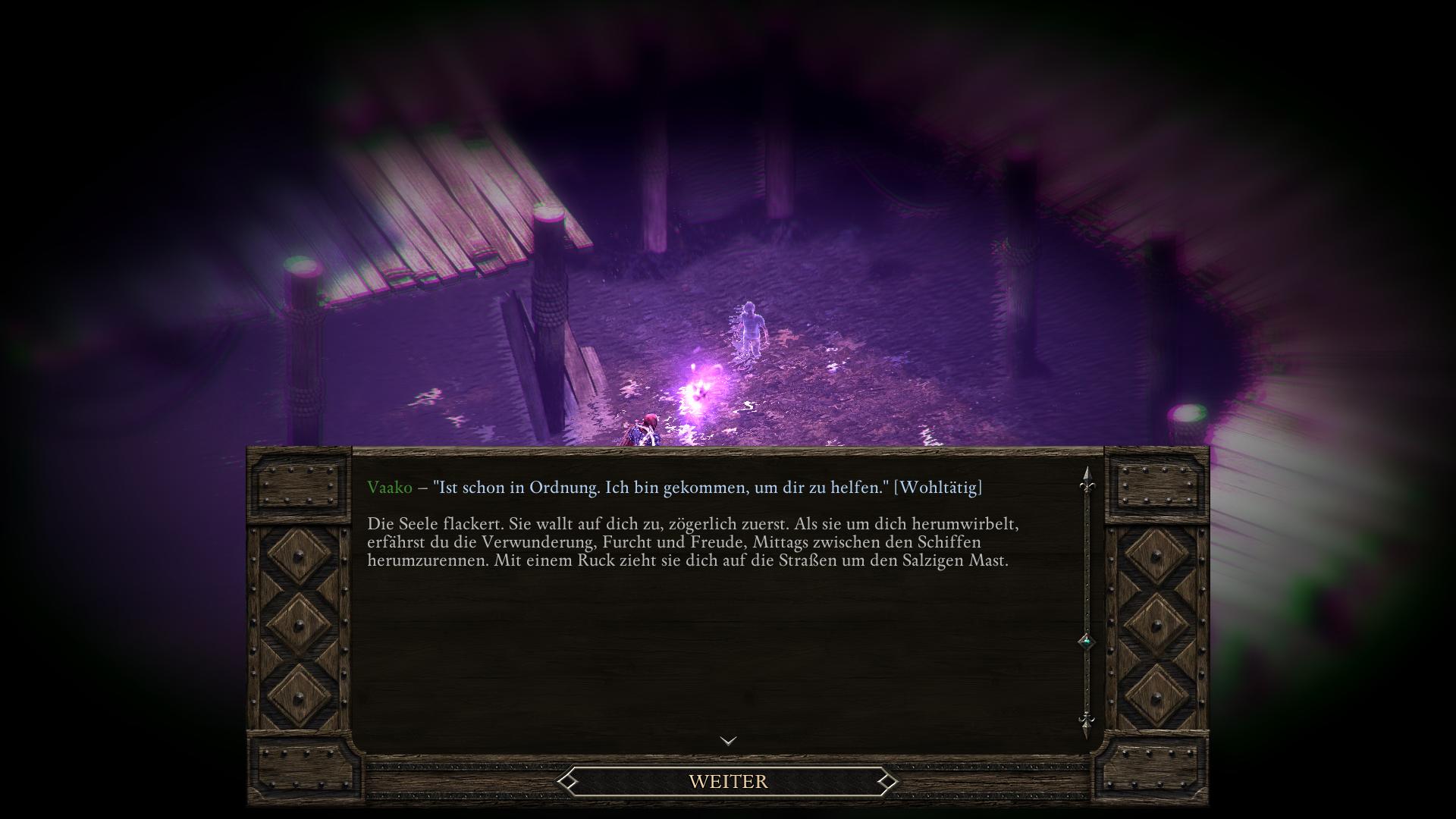 Im Norden von Ondras Geschenk (Ondra's Gift) wohnt Odda [6]. Bei einem Besuch ihres Hauses erzählt sie euch von ihrem seit 2 Tagen verschwundenen Sohn Derrin. Wodurch diese Aufgabe startet. (Alternativ ist es selbstverständlich auch möglich Derrins Leichnam zu finden und dadurch die Aufgabe starten.) Ihr könnt eure Suche im Hafen beginnen, indem ihr die Passanten auf dem Pier befragt. Imatl [10] verweist auf Derrins faullenzenden Vater, Niah [12] hat Derrin nicht gesehen und Marceno erzählt euch, dass Derrin auf seinem Schiff spielen wollte und als er ihn wegschickte, dieser zum Salzigen Mast (Salty Mast) lief [11]. Im Salzigen Mast findet ihr an der Bar dann den erwähnten Faullenzer Weyd. Er wollte nach dem Fischen eigentlich nur kurz einen Trinken und bat Derrin deshalb draußen zu warten. Doch als er kurz darauf wieder rauskam, war der Junge weg und seitdem traut sich Weyd nicht mehr zu seiner Frau nachhause. Wenn ihr das Gebiet vor den Salzigen Mast absucht, könnt ihr bereits vermuten, wo Derrin ist. Denn unterhalb des Stegs schwimmt eine Seele (violetter Fleck). Höchstwahrscheinlich kommt ihr dort jedoch nicht dran, denn meistens herrscht Flut und das geht nur bei Ebbe. In dem Fall müsst ihr etwas Zeit verstreichen lassen (rasten etc.) und wenn ihr schon darauf wartet, könnt ihr gleich die Geheime Fracht Aufgabe annehmen, da sie ebenfalls nur bei Ebbe zu lösen ist. Durch Berühren der Seele seht ihr, wie Derrin einer Frau helfen wollte, die von einigen Schlägern bedrängt und dadurch selbst zum Opfer wurde. Im Anschluss daran könnt ihr die Mordwaffe mit einem eingravierten "B" von Derrins Leichnam bergen und dann ...
