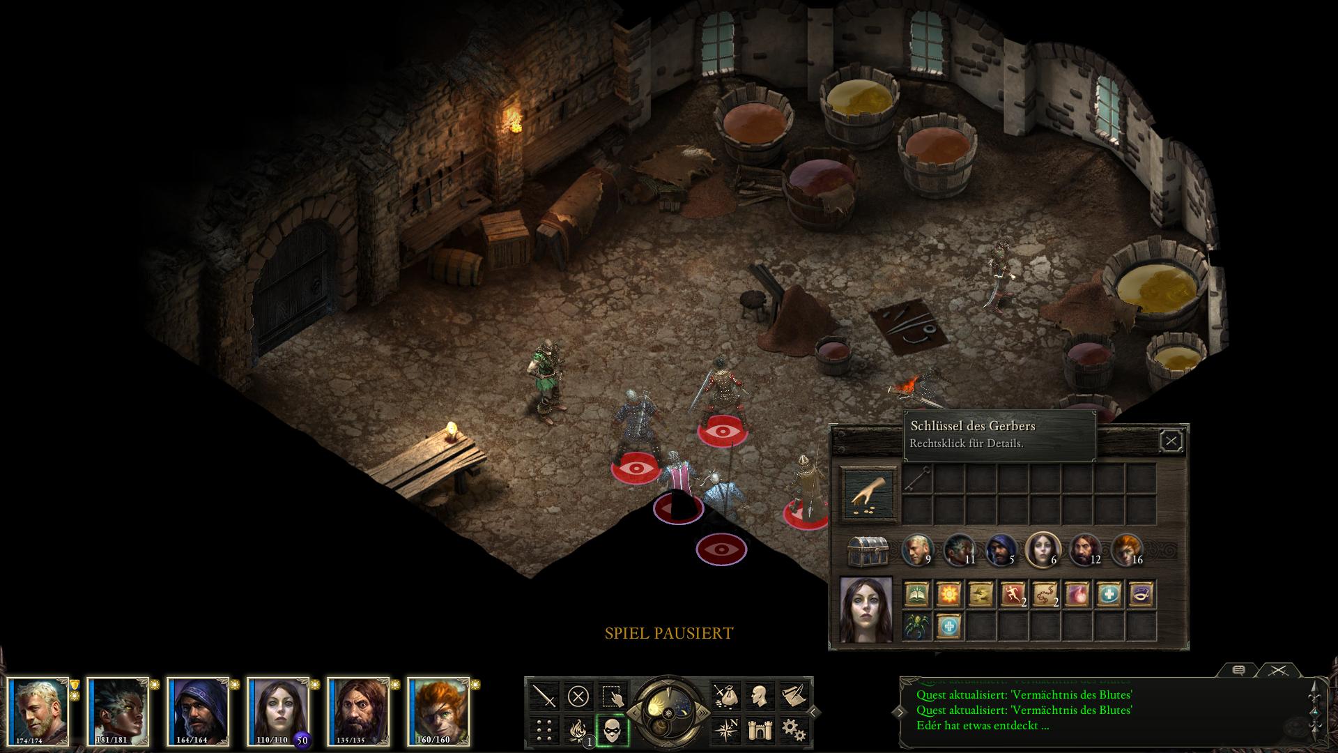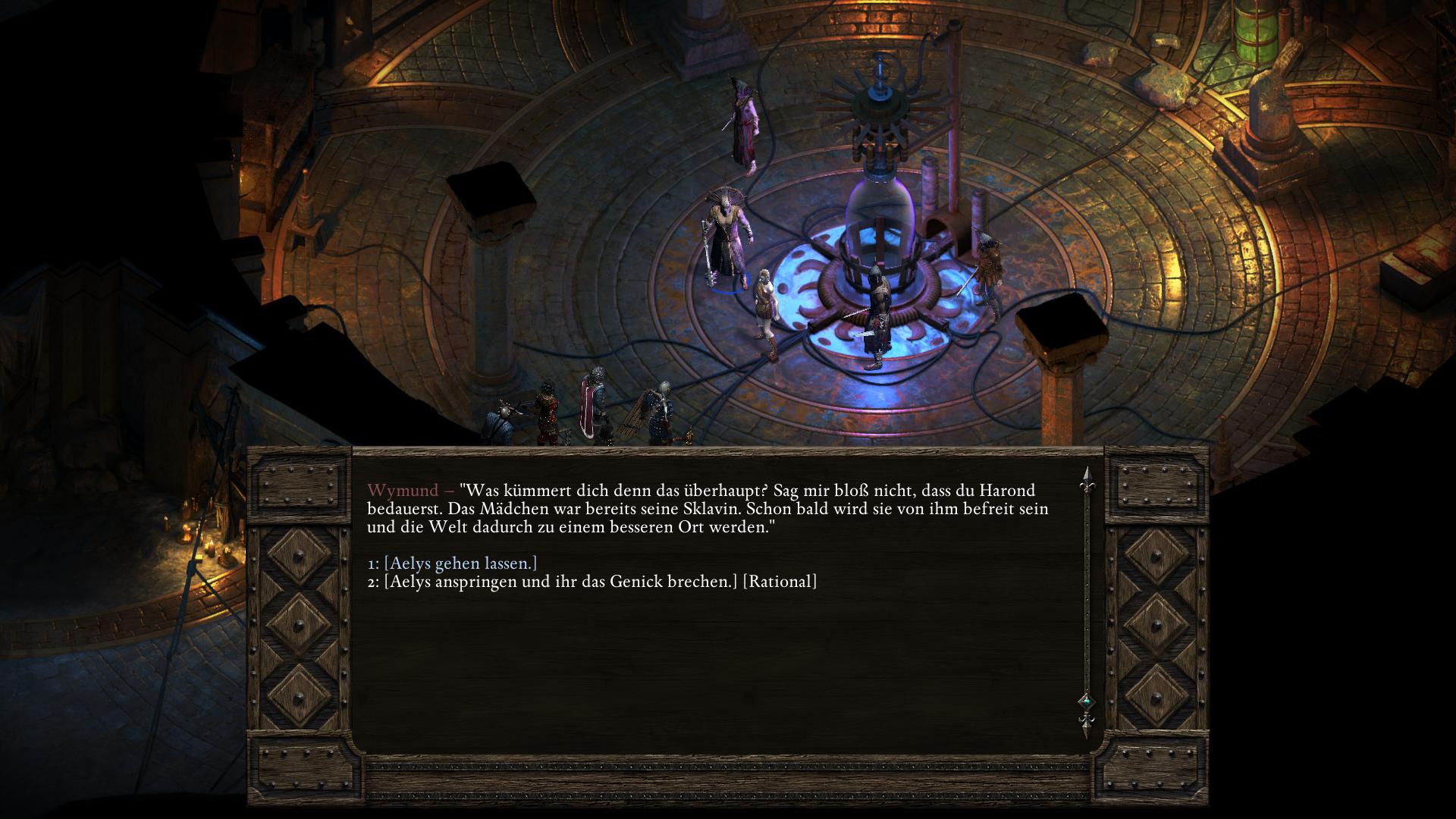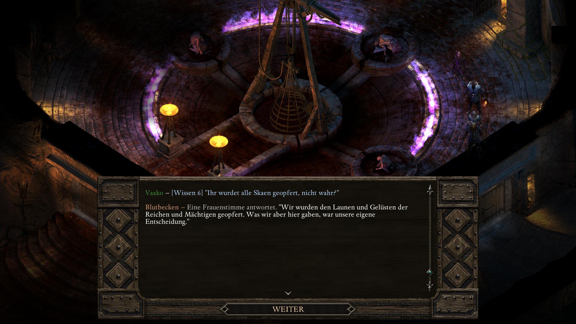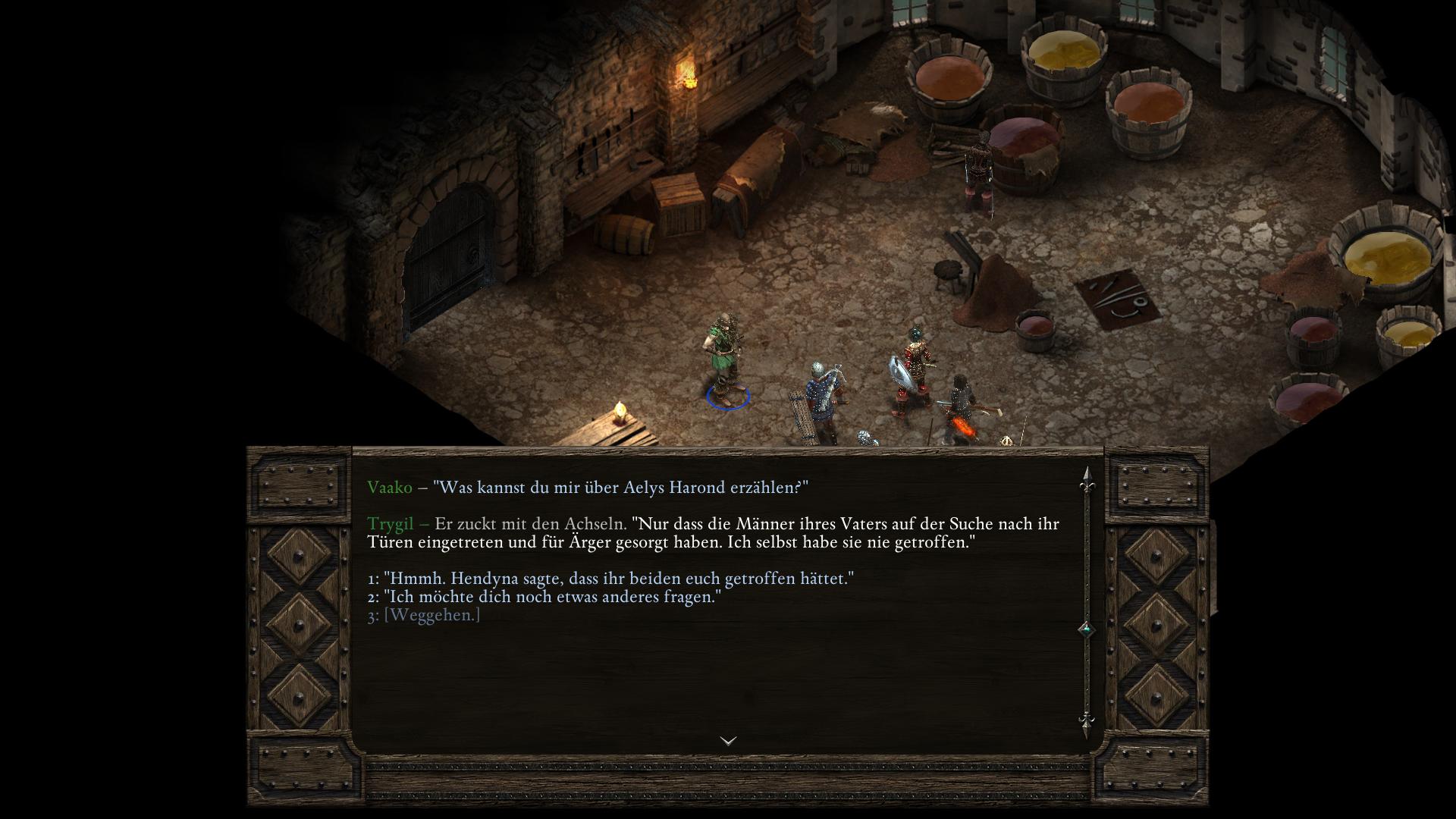 Mit Wahrnehmung 12 könnt ihr Trygil damit konfrontieren, was für ein Dreckloch sein Laden ist und das es total unwahrscheinlich scheint, dass sich eine adelige Dame mit ihm einlassen könnte. Das kann die Konversation etwas ausarten lassen. Oder aber ihr aktiviert den Spähmodus (Schleichen) und entdeckt so den Wasserbehälter rechts und nehmt den Schlüssel des Gerbers (Currier's Key) heraus. Versucht ihr mit dem Schlüssel die Tür hinter Trygil aufzuschließen, greifen er und Sabhan euch an. Streckt sie nieder und klettert über die Leiter im Hinterzimmer des Turms hinab in den Skaen Tempel. - Die Statue