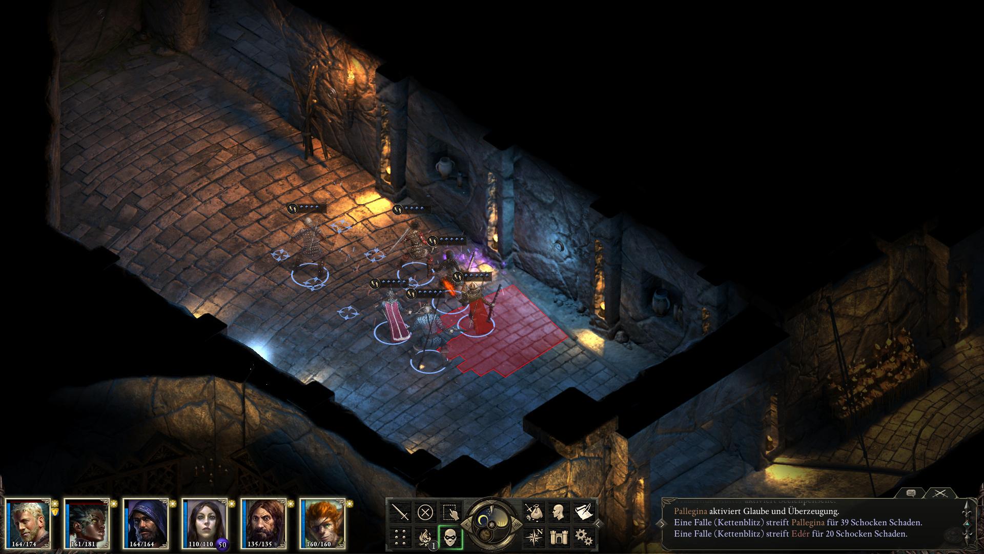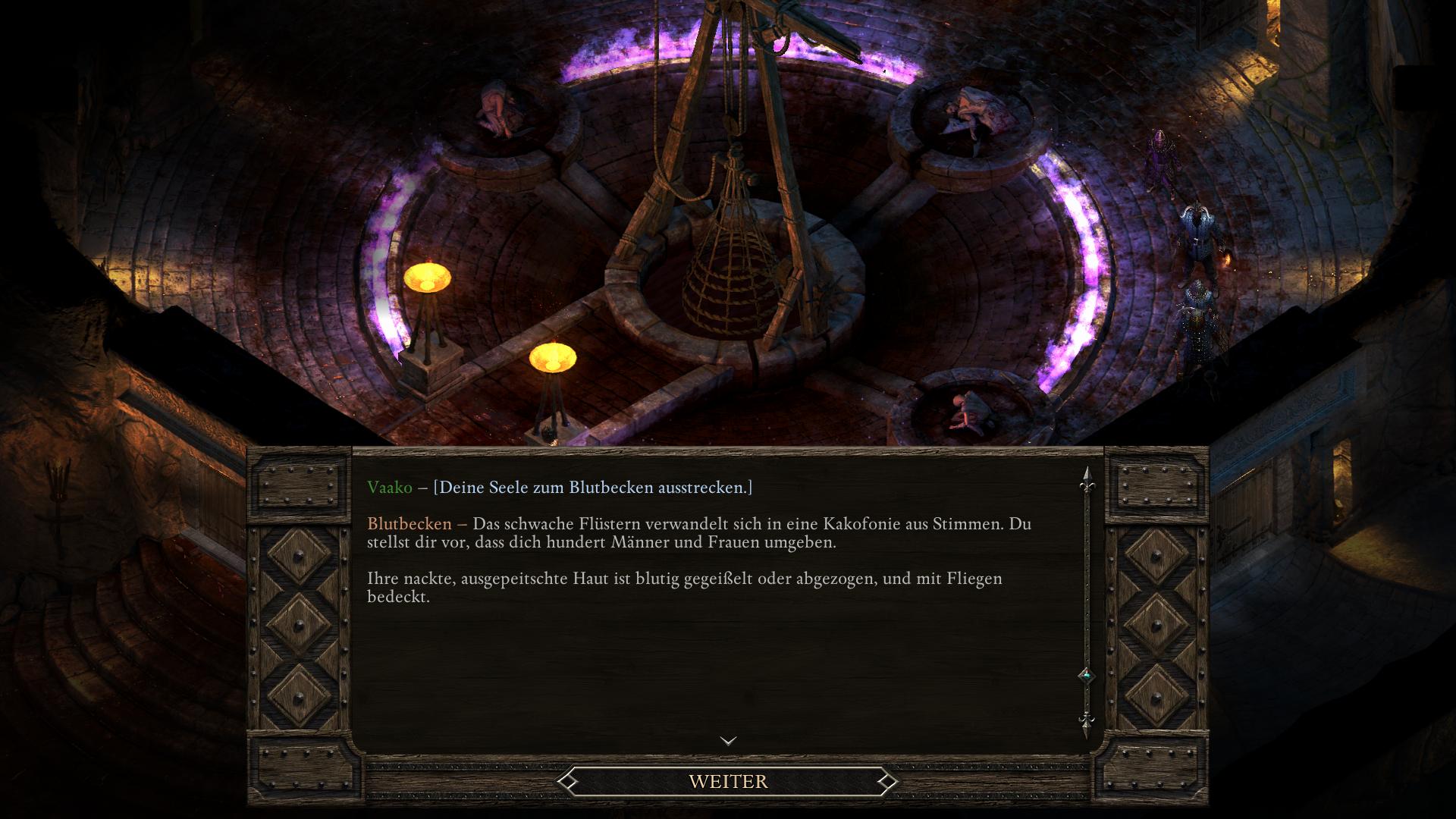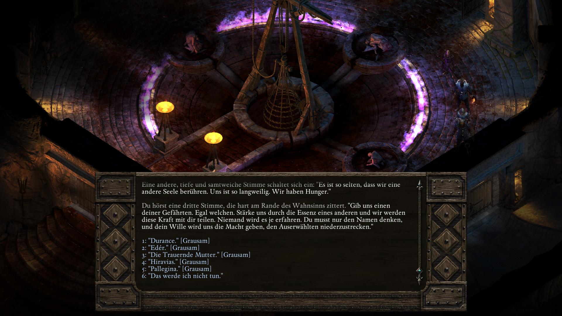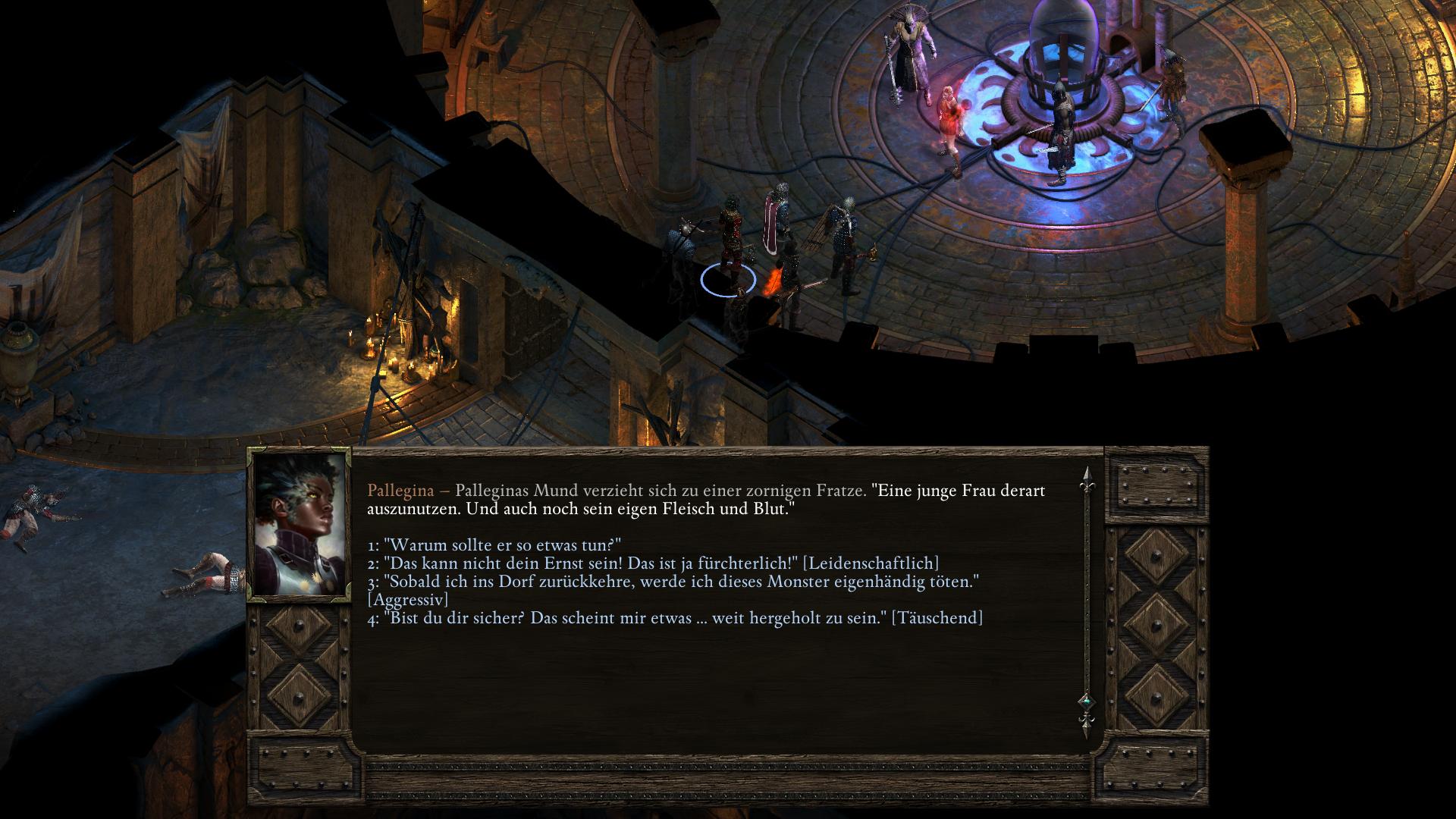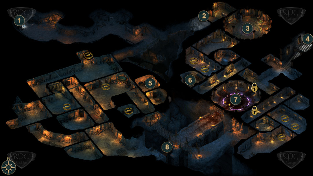 Mit Wahrnehmung 12 könnt ihr Trygil damit konfrontieren, was für ein Dreckloch sein Laden ist und das es total unwahrscheinlich scheint, dass sich eine adelige Dame mit ihm einlassen könnte. Das kann die Konversation etwas ausarten lassen. Oder aber ihr aktiviert den Spähmodus (Schleichen) und entdeckt so den Wasserbehälter rechts und nehmt den Schlüssel des Gerbers (Currier's Key) heraus. Versucht ihr mit dem Schlüssel die Tür hinter Trygil aufzuschließen, greifen er und Sabhan euch an. Streckt sie nieder und klettert über die Leiter im Hinterzimmer des Turms hinab in den Skaen Tempel. - Die Statue