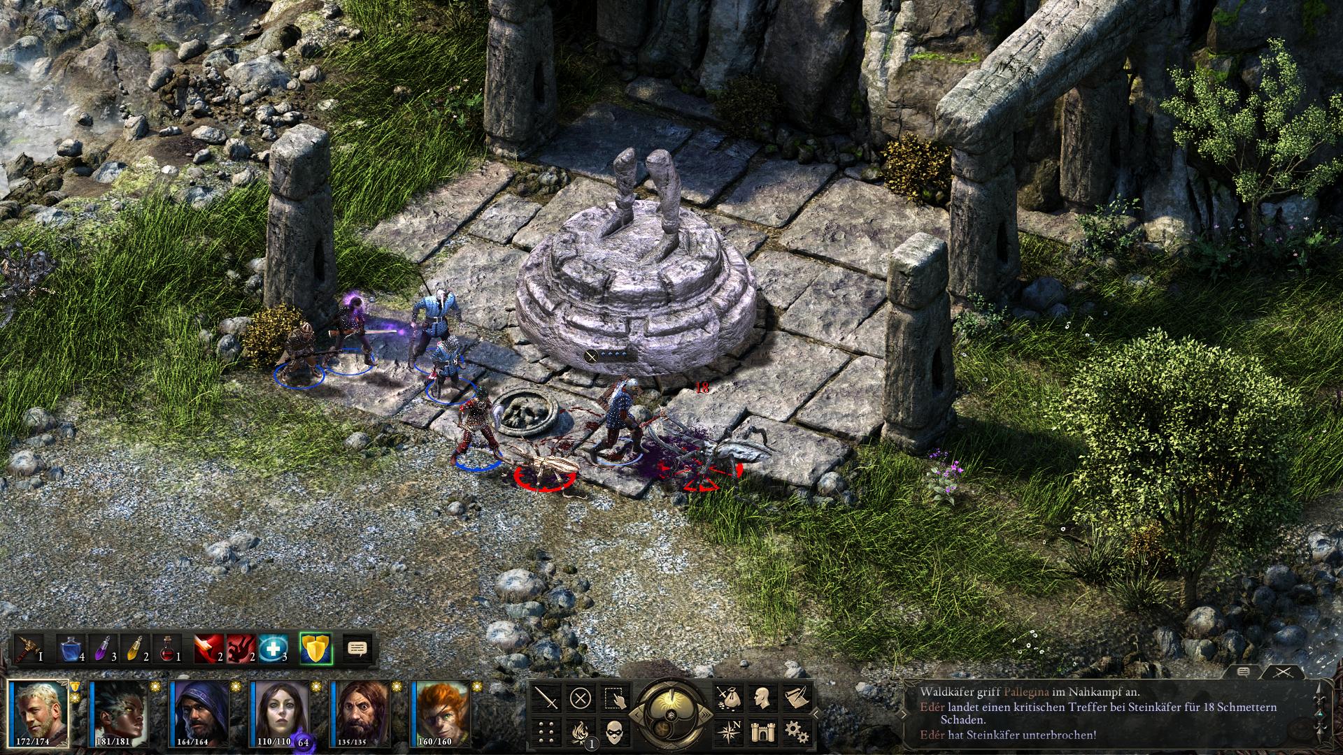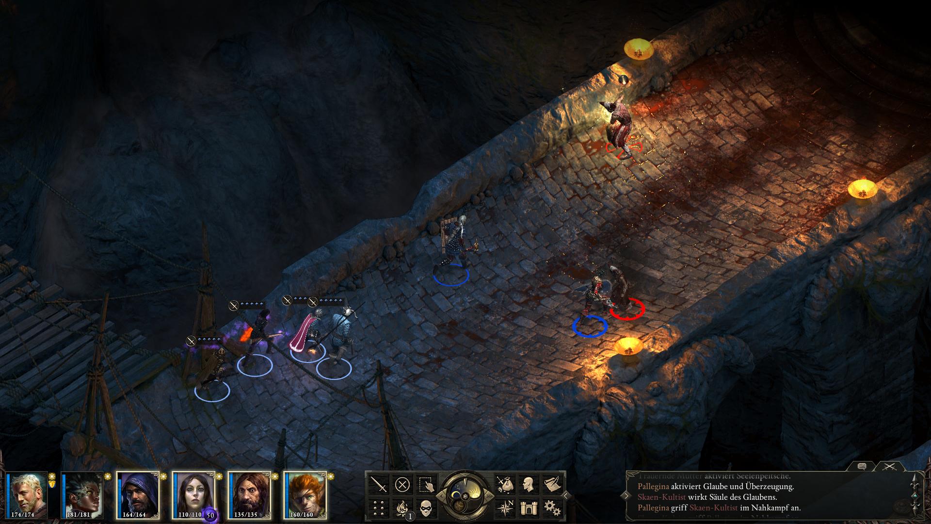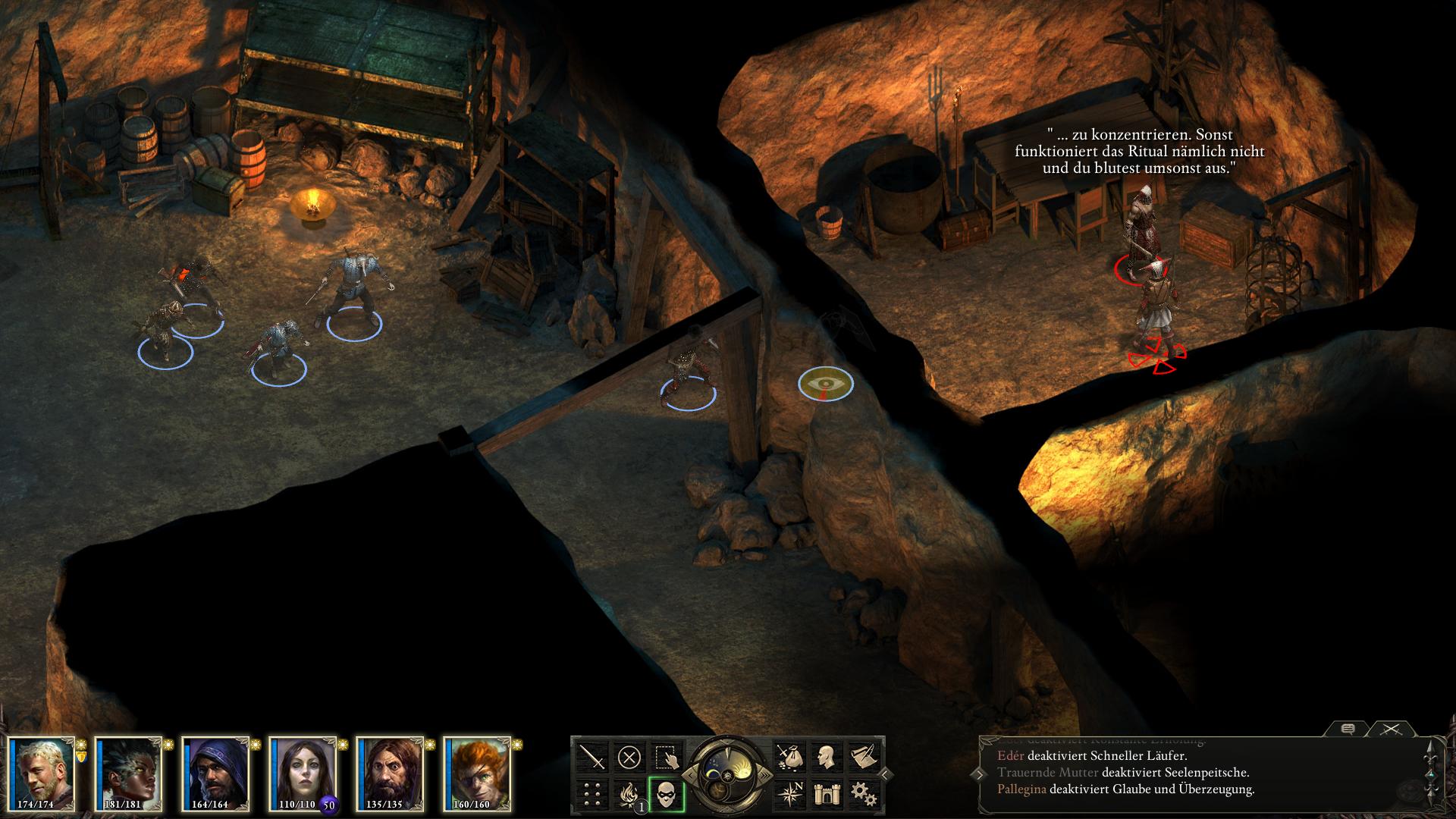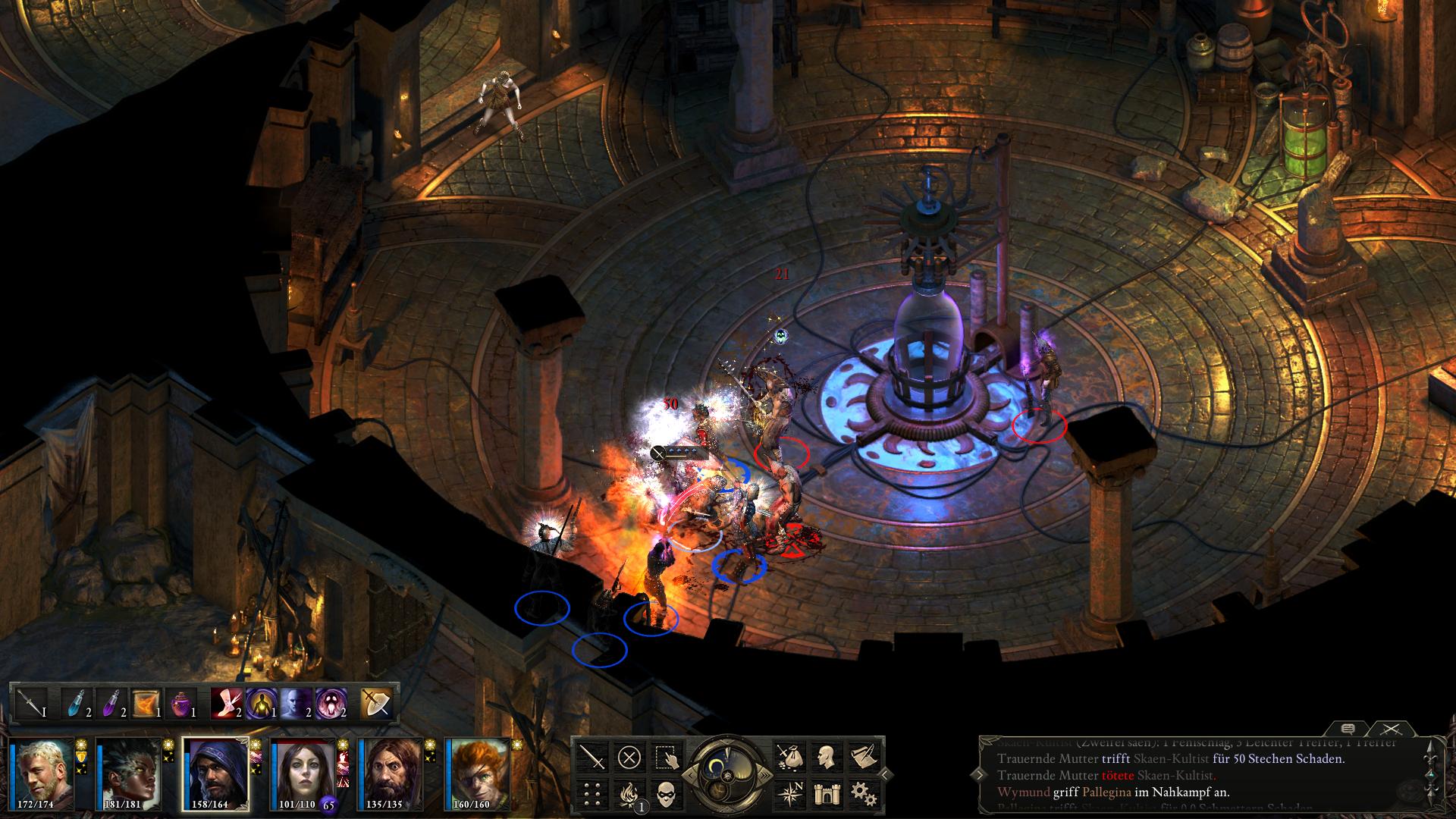 Mit Wahrnehmung 12 könnt ihr Trygil damit konfrontieren, was für ein Dreckloch sein Laden ist und das es total unwahrscheinlich scheint, dass sich eine adelige Dame mit ihm einlassen könnte. Das kann die Konversation etwas ausarten lassen. Oder aber ihr aktiviert den Spähmodus (Schleichen) und entdeckt so den Wasserbehälter rechts und nehmt den Schlüssel des Gerbers (Currier's Key) heraus. Versucht ihr mit dem Schlüssel die Tür hinter Trygil aufzuschließen, greifen er und Sabhan euch an. Streckt sie nieder und klettert über die Leiter im Hinterzimmer des Turms hinab in den Skaen Tempel. - Die Statue