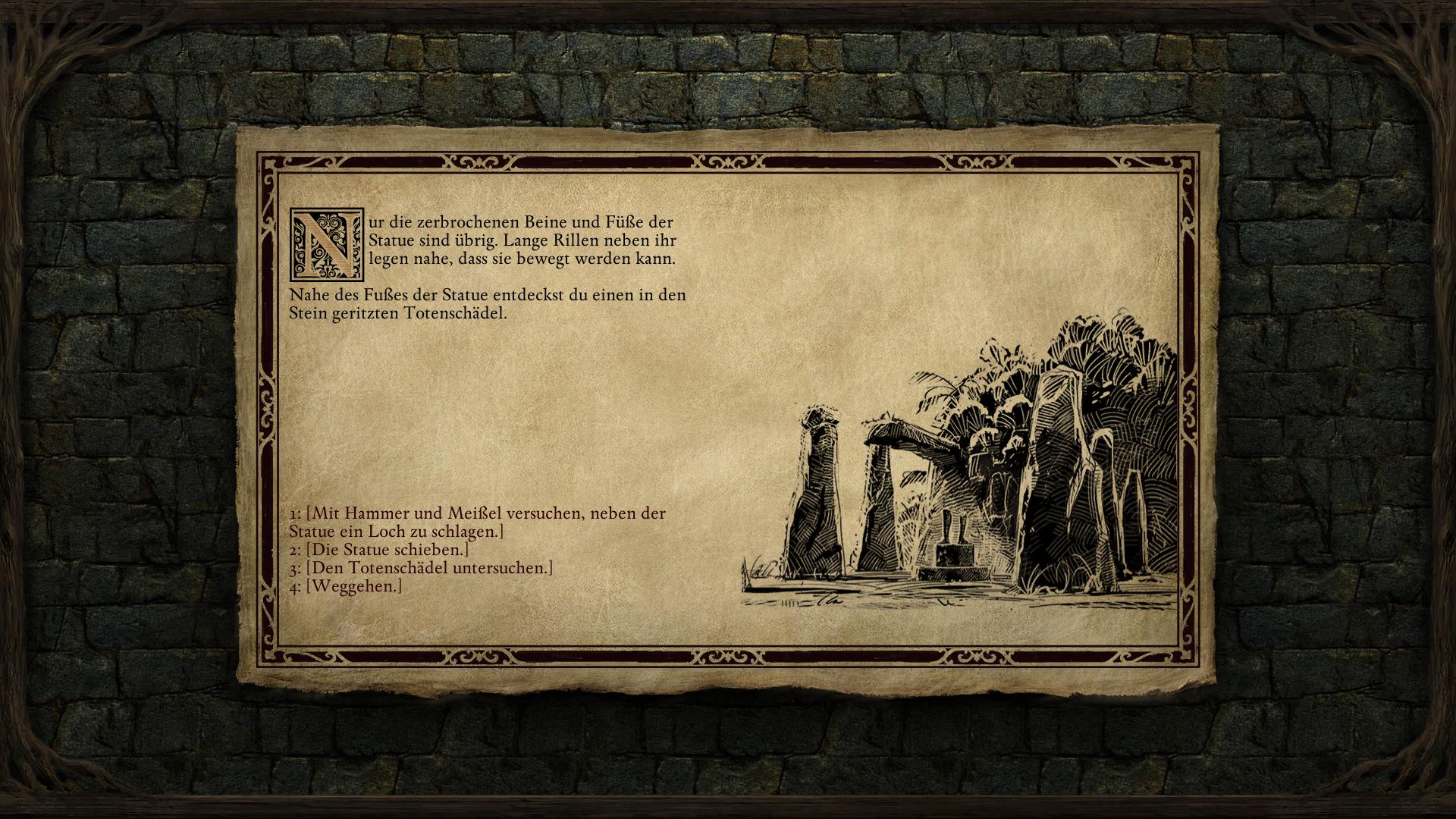 Reist zu besagtem Fluss (Dyrfurt-Flusskreuzung) und untersucht die Statue auf der Insel im Zentrum. Mit Macht 19 könnt ihr die Statue wegschieben. Oder ihr knackt das Schloss im Totenschädel. Steht euch auch die Mechanik dafür nicht zur Verfügung, könnt ihr in Winfriths Laden "Hammer und Meißel" kaufen und damit ein Loch neben der Statue schlagen und so in den Skaen Tempel gelangen.