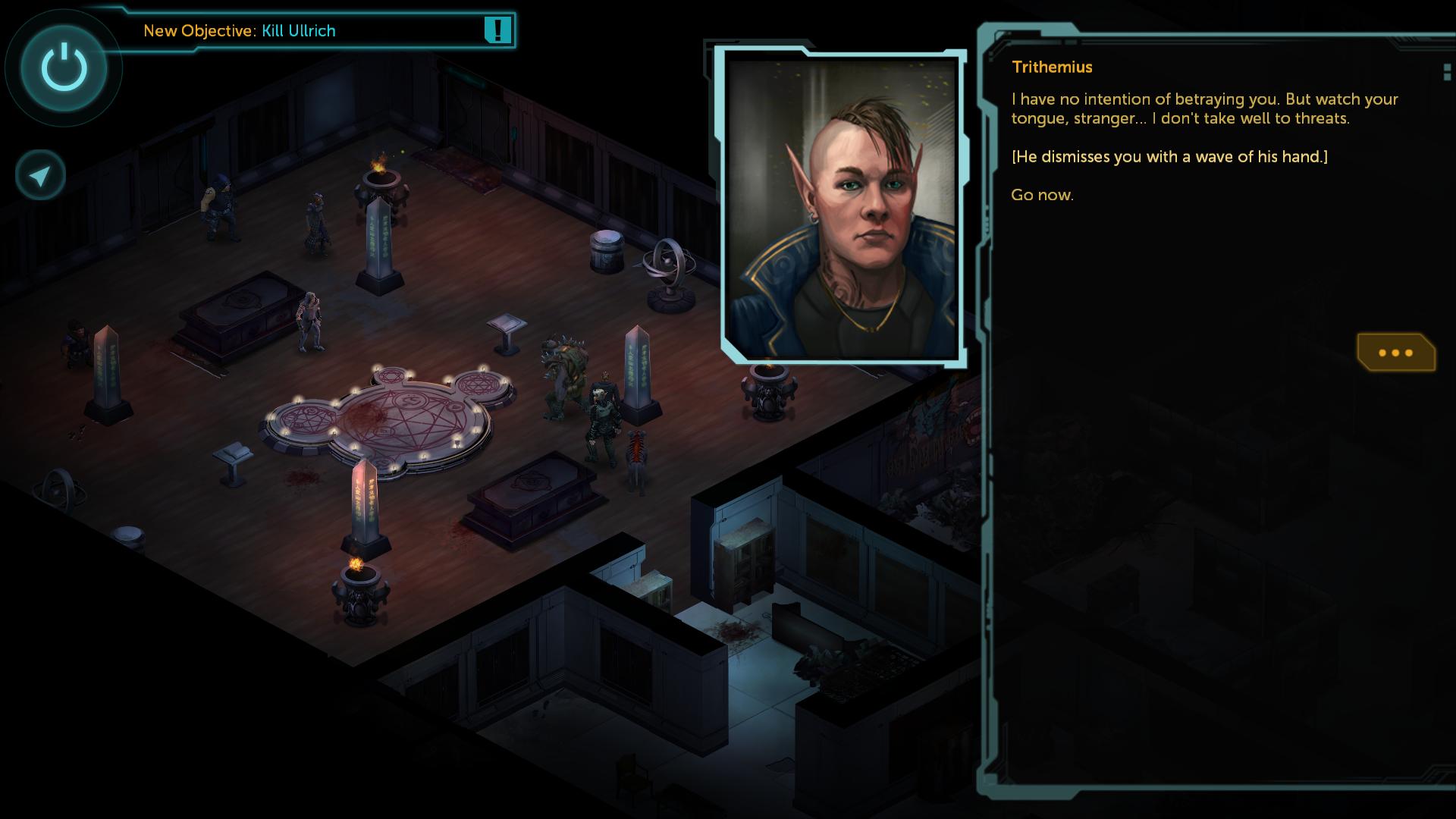 Dank Parsons Hinweis geht's zuletzt durch die Geheimtür des südöstlichen Zimmers in Trithemius Opferraum. Der verrückte Magier hat selbstverständlich den Gegenvorschlag, dass du Ulrich für ihn tötest und so an beide fehlenden Bauteile des Fahrstuhls kommst. Wen der beiden du umbringst ist gänzlich dir überlassen. Der Unterschied liegt lediglich in den Habseligkeiten der jeweiligen Gang. Trithemius hat logischerweise haufenweise Magier Kram und Ulrich einen "Ganger Mask" Anzug und ein Medkit im Angebot. Durch ihn kommst du im Keller zudem an einen Tresor mit einer "Remington Roomsweeper" (Pistole). Wenn dir ein Gang-Oberhaupt nicht reicht, kannst du aber auch beide töten. Dafür musst du zunächst Ulrich für Trithemius töten und anschließend Trithemius noch mal übers Ohr hauen und angreifen. Solltest du dich dafür entscheiden Ulrich zu töten, musst du ihm aber auf alle Fälle vor der Entscheidung die "Magnifiker Amulets" verkaufen, sonst ist das Geld futsch.