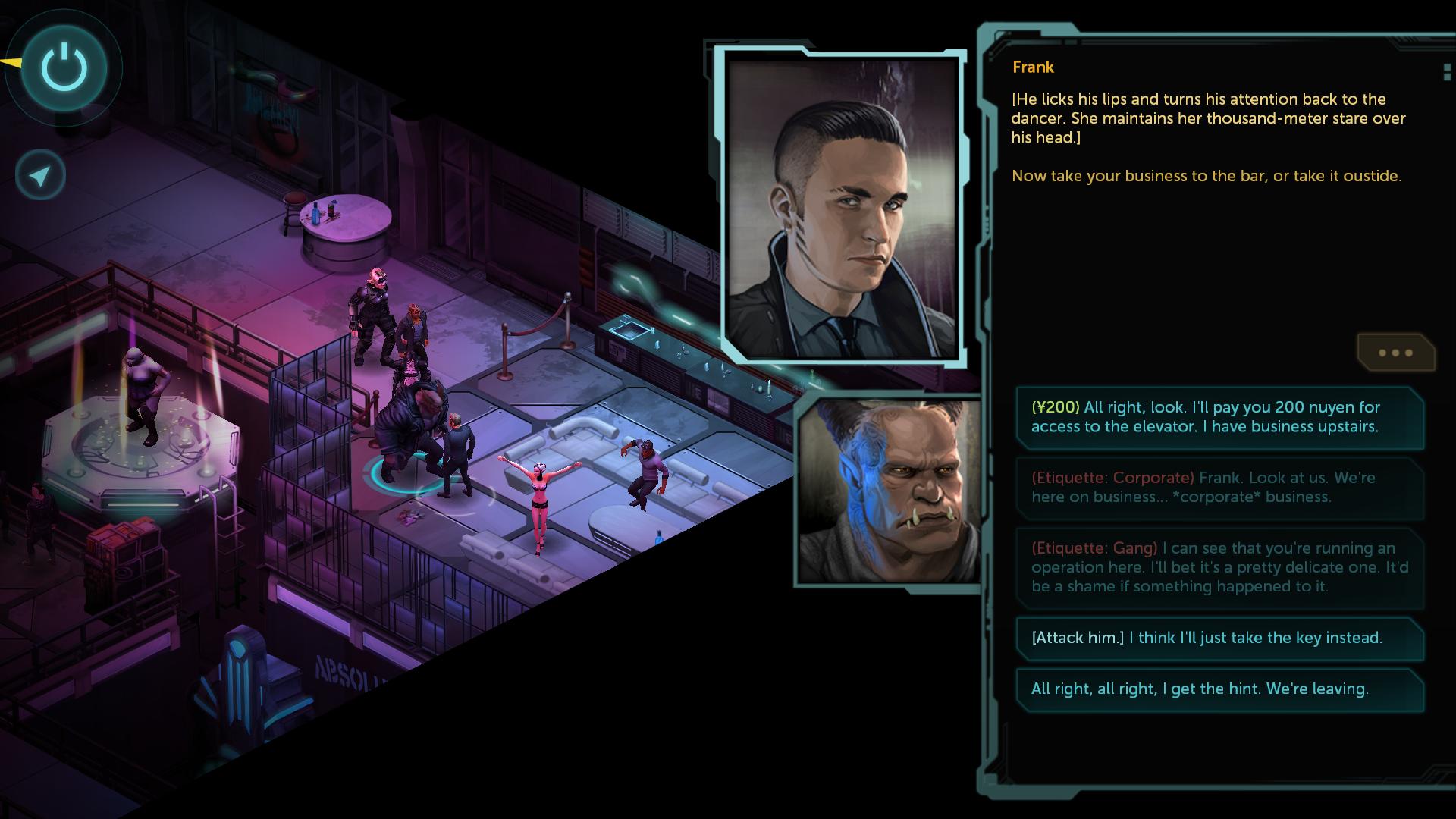 Im Gespräch mit ihm eröffnen sich zwei Möglichkeiten. Entweder greifst du Frank an, wodurch ein Kampf mit ihm und den Sicherheitskräften des Clubs entsteht (nichts schwerwiegendes) oder du bezahlst ihn. Wobei sich der Preis mit Etiquette: Corporate oder Gang reduzieren lässt. Mit dem Fahrstuhl <6> kannst du anschließend die fünf anderen Stockwerke des Gebäudes abklappern. Je nachdem wie ausgiebig sich dein Besuch hier gestalten soll. Für das Hauptziel, Green Winters, müsstest du zunächst in den zweiten Stock, um dort seinen Zimmercode in Erfahrung zu bringen. Wenn du Silkes Nebenquest übernehmen möchtest, solltest du auf Etage drei anfangen.