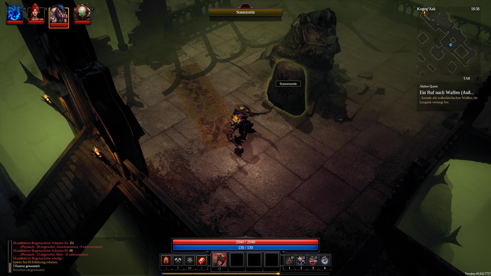 Im Nordwesten des Splitterspeer-Passes befindet sich der Eingang zu Kogo'Aak. Das Dungeon ist eine gewaltige Puzzlestätte. Im Anschluss an die ersten Gegnerhorden gelangt ihr zum Teleporterlabyrinth. Für die Öffnung der Tür müsst ihr mindestens ein Bruchstück des Sonnensteins [S] haben und das in den gleichnamigen einsetzen. Eins bekommt ihr aus dem Schrein der Außenlande und ein weiteres aus dem Grenzlager der Taymurianer. Im Teleporter gibt es neun verschiedene Punkte, an die ihr teleportiert werden könnt, wenn ihr eine der Teleporterplatten betretet. Die farbige Nummer auf der Karte markiert den Zielort und die Plattform der jeweiligen Farbe den Ausgangspunkt. Effektiv werdet ihr euch jedoch nur im Kreis bewegen, wenn ihr nicht beachtet, dass es in der Schattenwelt noch drei Verbindungsbrücken gibt. Nutzt die Teleporterplatten um euch als erstes in den Westen [7] zu den Zugbrücken zu teleportieren.