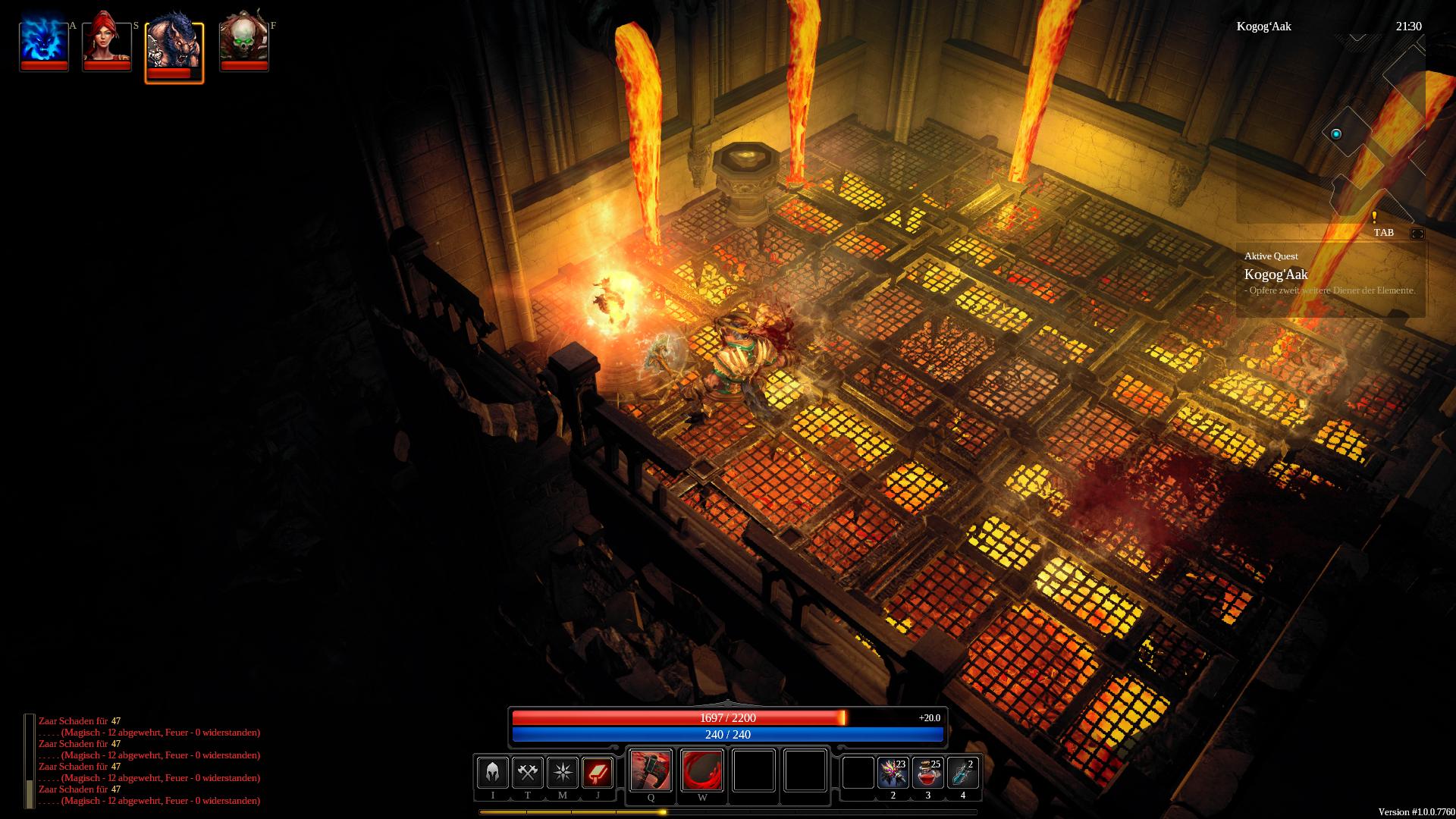 An den Zugbrücken angelangt müsst ihr grundsätzlich immer zwei Hebel betätigen und dann über die nächsten beiden Brücken rennen. Legt also vom Eingang aus die beiden Hebel um, was die Brücke vor [13] euch und die nach links [10] hebt. Lauft auf die linke Seite rüber und betätigt dort die beiden Hebel. Wodurch ihr zurück in die Mitte und sofort nach rechts [12] rüber kommt. Von dort aus bringen euch die beiden letzten Hebel zur letzten Plattform [11]. Beim spiralförmigen Abstieg müsst ihr eine Reihe von Feuerlementaren vernichten und könnt euch am Ende das Feuersigel (Fire Sigil) schnappen. Direkt daneben steht das Totem des Neumondes für die später kommende "Die Geister des Ahnenmondes)" Quest. Das solltet ihr ebenfalls unbedingt einstecken. Anschließend könnt ihr zurück über die Brücken zum Teleporterlabyrinth. Dazu müsst ihr einfach nur immer den Hebel neben der Brücke betätigen. Teleportiert euch nun in den südlichen Abschnitt von Kogo'Aak [9]. Für den nächsten Schritt braucht ihr mindestens zwei Bruchstücke des Sonnensteins.