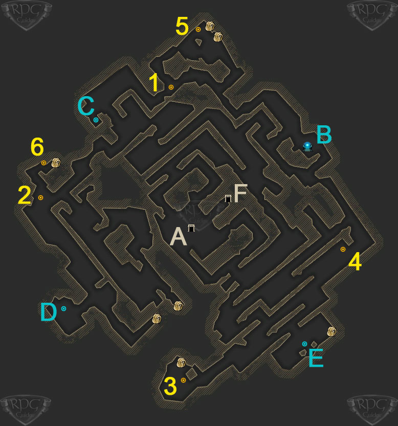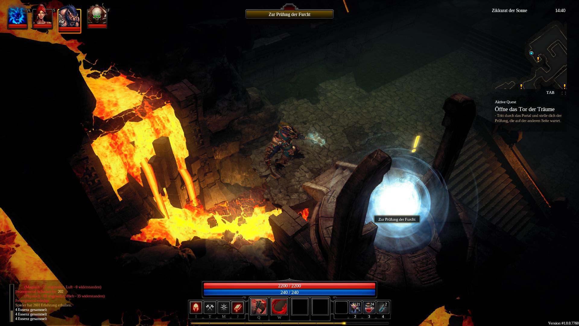 Die Prüfung der Furcht erreicht ihr über das westliche Portal [C]. Hier müsst ihr nur lange genug in der Mitte bleiben und überleben. Ihr könnt dabei so viele Feuerwächter töten, wie ihr wollt. Sie entstehen in der jeweiligen Ecke sofort neu und rücken euch wieder auf den Leib. Verlassen des inneren Kreises führt zum Scheitern der Prüfung. Sobald die Zeit (grüner Balken), abgelaufen ist, ist die Prüfung bestanden. Im Westen der Kammer steht anschließend noch eine Schatztruhe.