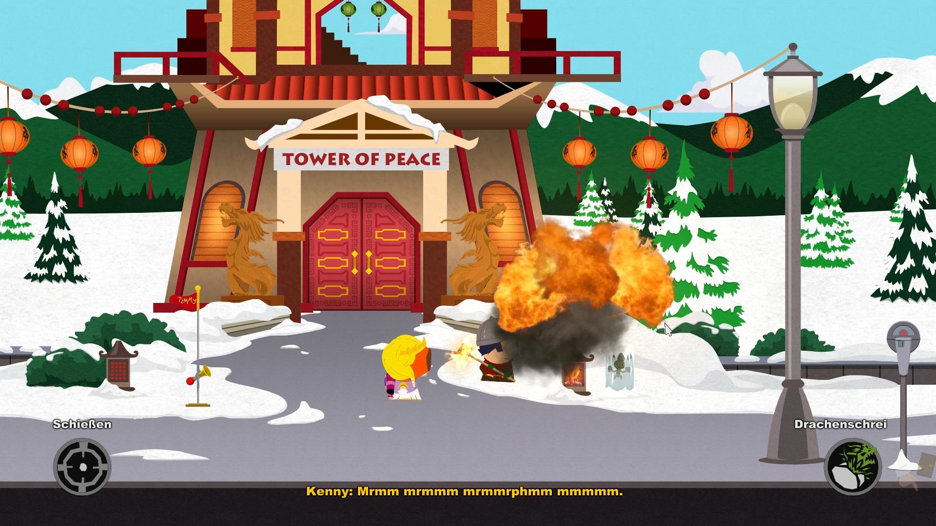 Brocorri befindet sich in einem Eisblock rechts vor dem Eingang des Tower of Peace. Verwende deinen Cup-A-Spell (bekommst du nach der Befreiung von Token und Tweek) Furz auf die Lampe neben ihm, damit ihn die Explosion aus dem Eisblock befreit.