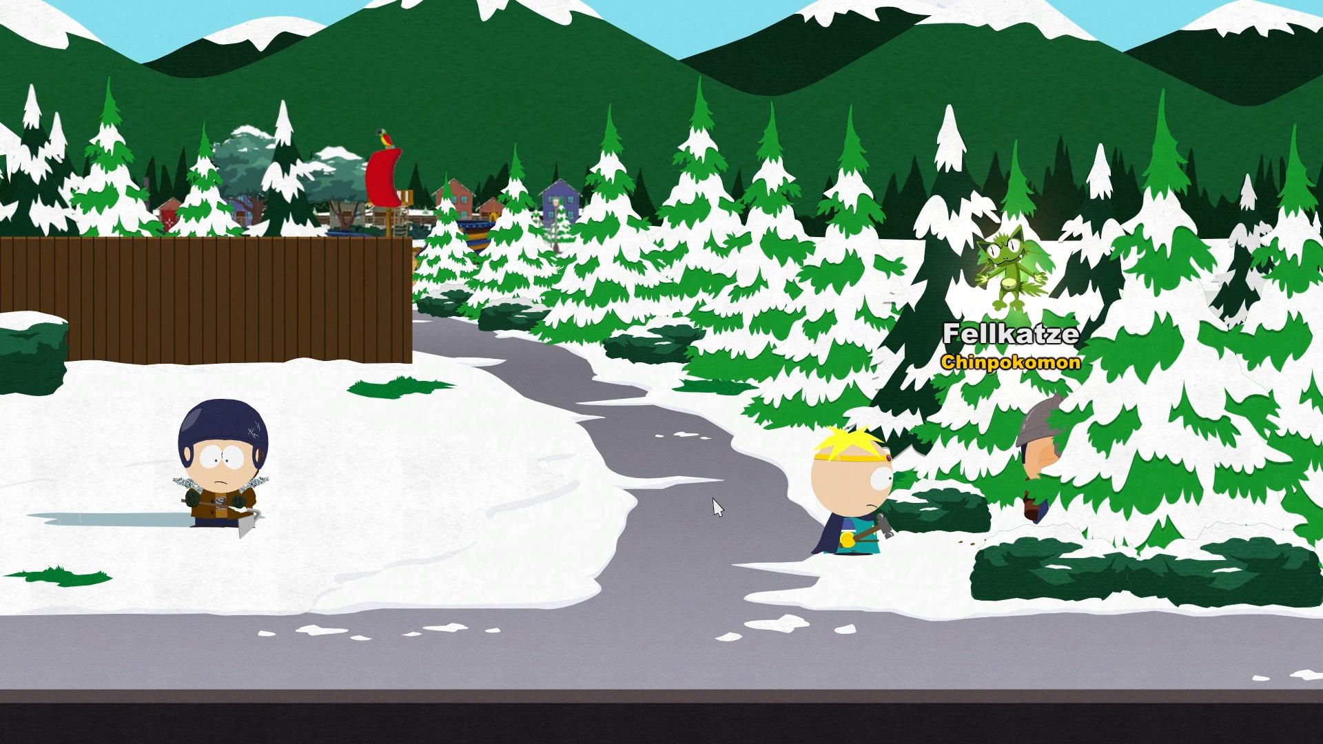 Der Furrycat Chinpokomon liegt rechts im Gebüsch, auf dem Weg zu Kennys Haus (Ende des Bildschirms bevor du zu Kennys Haus kommst). Zerschlag den kleinen Holzhaufen bei den Tannen und hol Furrycat aus dem Gebüsch.