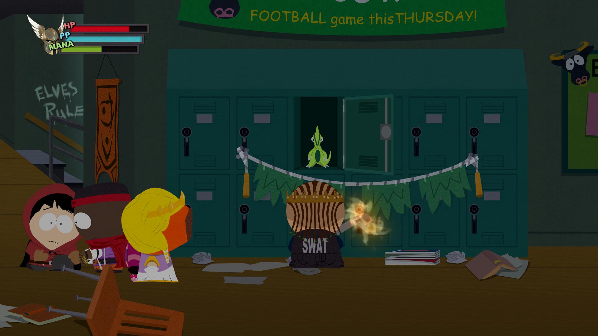 Während der Belagerung der Schule am zweiten Tag, findest du den Pterdaken Chinpokomon in einem Schließfach im Obergeschoss. Du musst also bereits den Haupteingang geöffnet und den Butters oder Stan besiegt haben. Geh die Treppe dahinter hoch. Normalerweise würdest du auf dieser Etage nach links gehen und dort deinen Kameraden helfen, die verdrescht werden. Das begehrte Schließfach befindet sich jedoch rechts von der Treppe. Öffne es und schlag dagegen, damit Pterdaken herunter fällt.