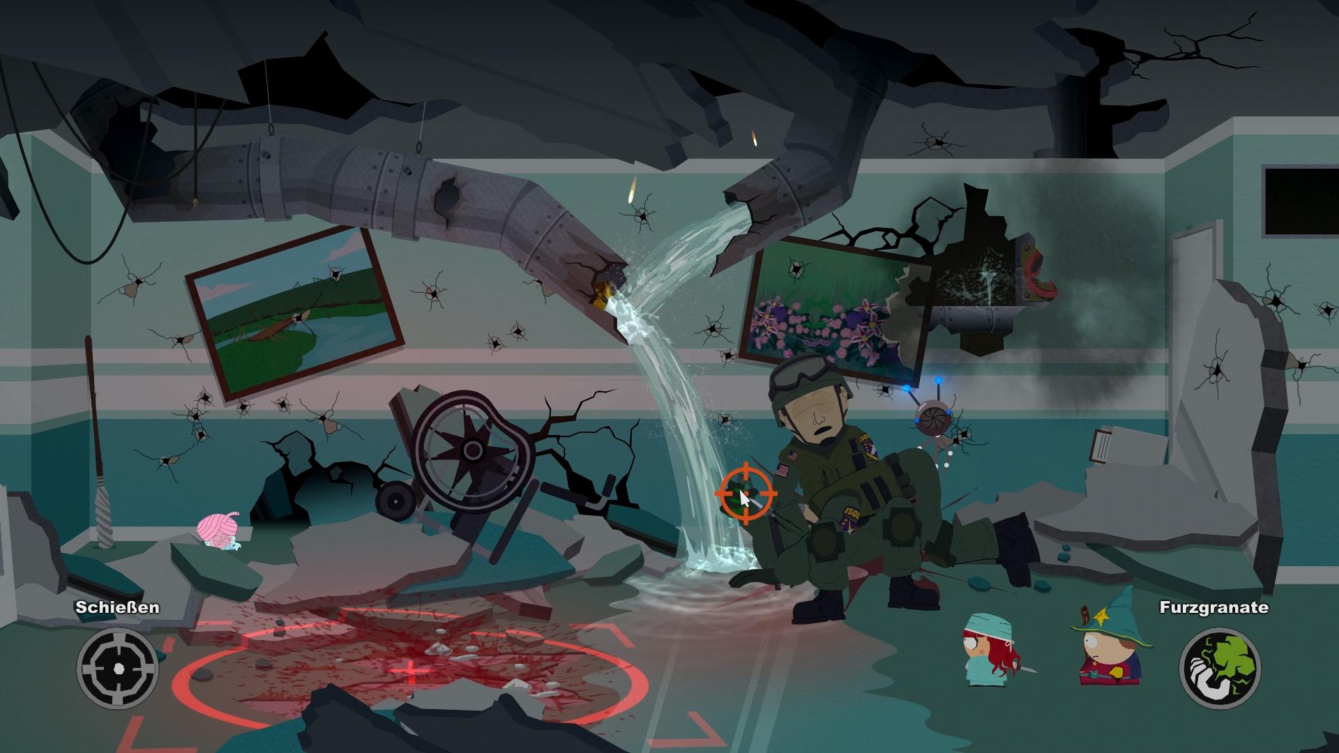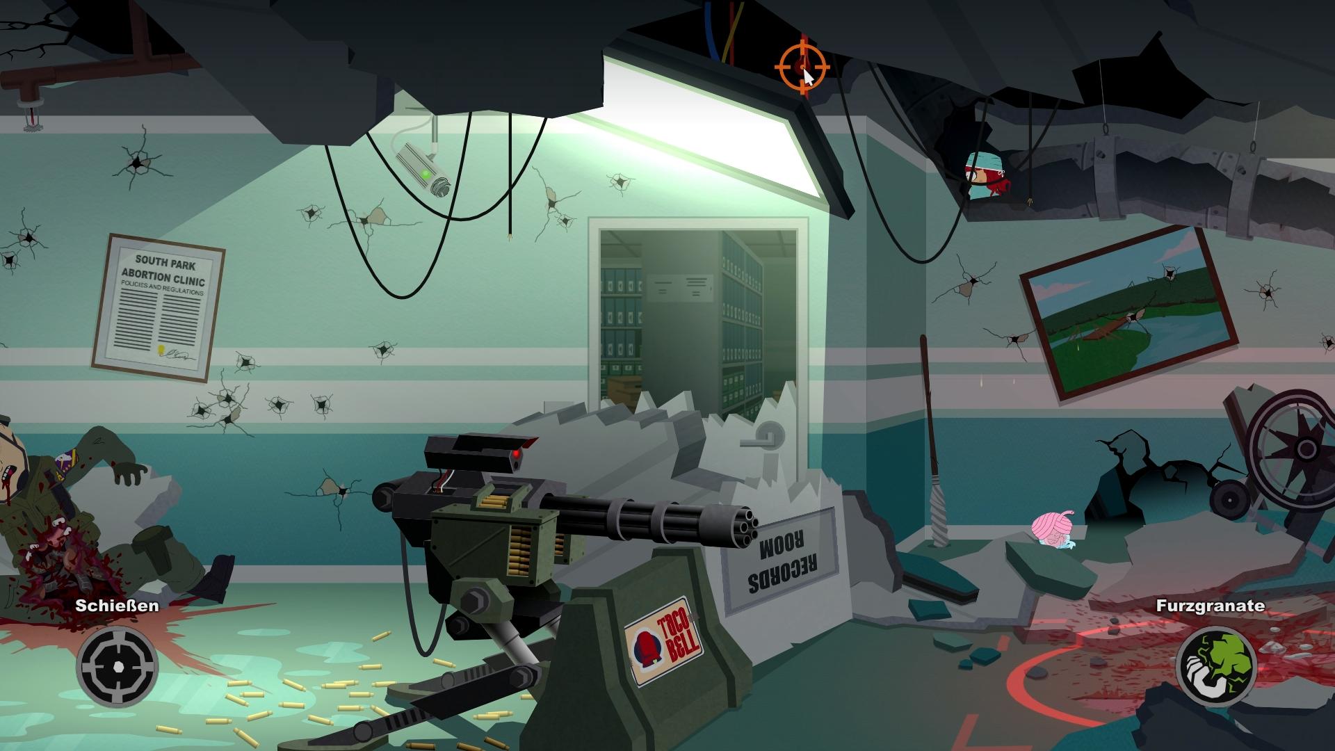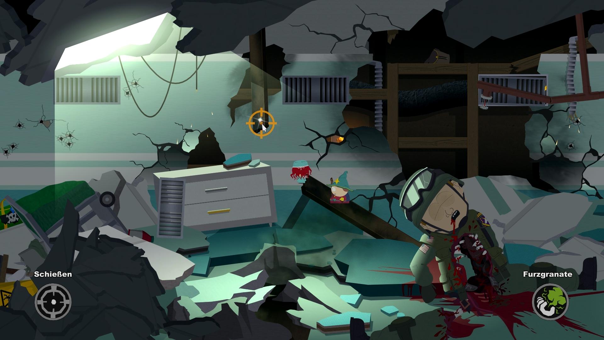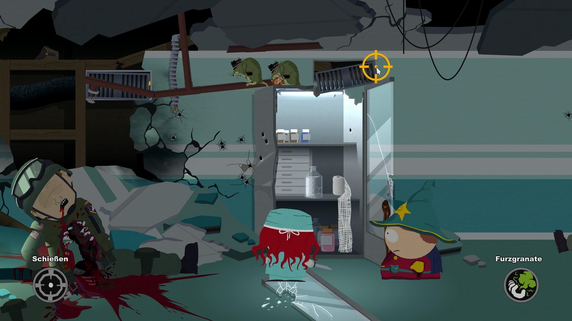 Als der Angriff der Nazi-Zombie-Fötusse anfängt, kannst du Randy in seinem Stuhl zurücklassen und auf den Flur zurück. Butters streckt seinen Kopf durch die Decke und schließt sich dir wieder als Begleiter an. Du kannst jetzt auch zu einem anderen Buddy deiner Wahl wechseln. In normaler Größe kommst du hier auf dem Gang nicht sonderlich weit. Oben auf den Arzneischrank sind zwei Ratten neben einem Lüftungsschacht. Den Schacht kannst du mit einem Schuss in eine Leiter verwandeln. Dann musst du aber immer noch die Ratten bekämpfen.