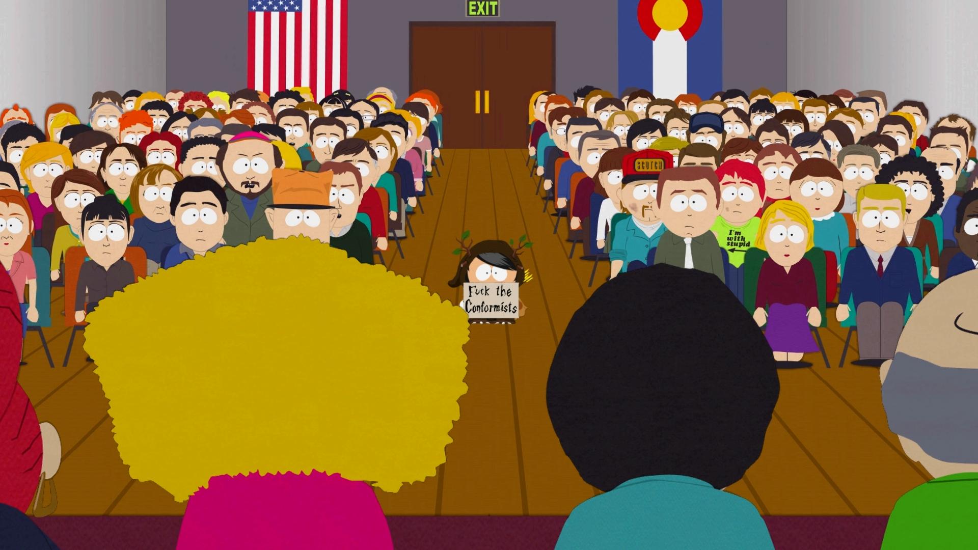 Zieh die drei Goth Kleidungsstücke an und geh damit zu den Goths hinter der Schule <25> zurück. Micheal sieht leider nicht ein, dich nur wegen der Kleidung zu akzeptieren und gibt dir stattdessen ein "Fuck the Conformists" Schild, das du dir um den Hals hängen und damit ein Foto auf der Elternratversammlung schießen darfst. Die Besprechung im Gemeindezentrum (Community Center) <26> nebenan verläuft ganz anders als geplant. Nachdem dich alle ignoriert haben und abgezogen sind, kannst du mit Randy Marsh reden. Er bittet dich ihn auf der Toilette zu treffen. Mr. Mackey hat übrigens die Verschwendetes Lager (Wasted Cache) Nebenquest anzubieten, die dir sowohl einen weiteren Freund als auch den Ferasnarf Chinpokomon.