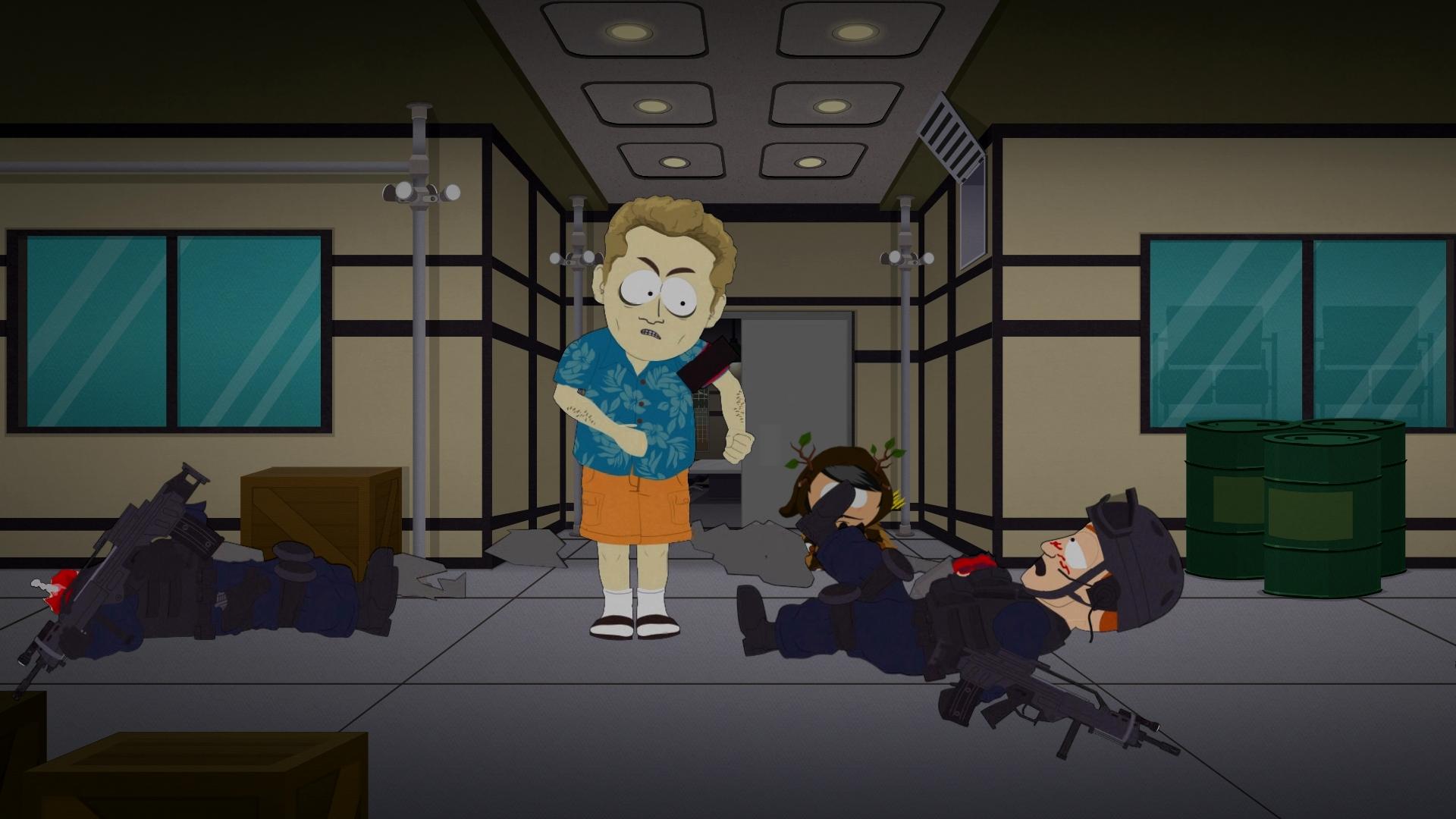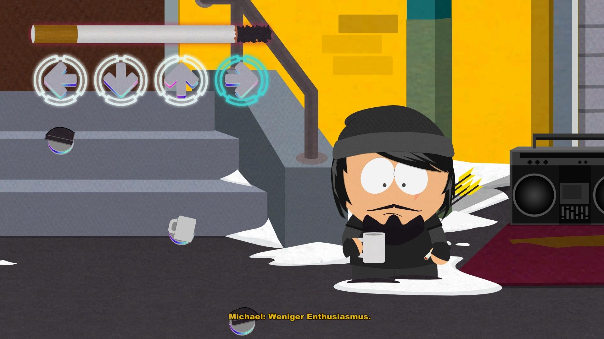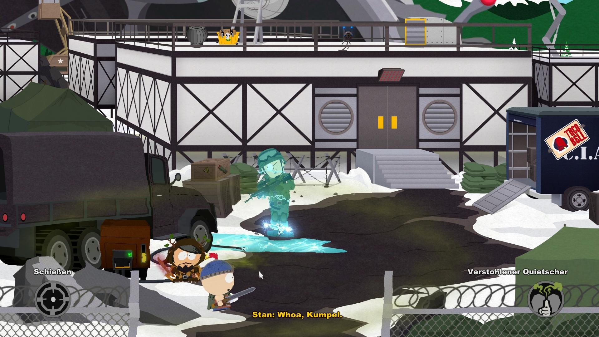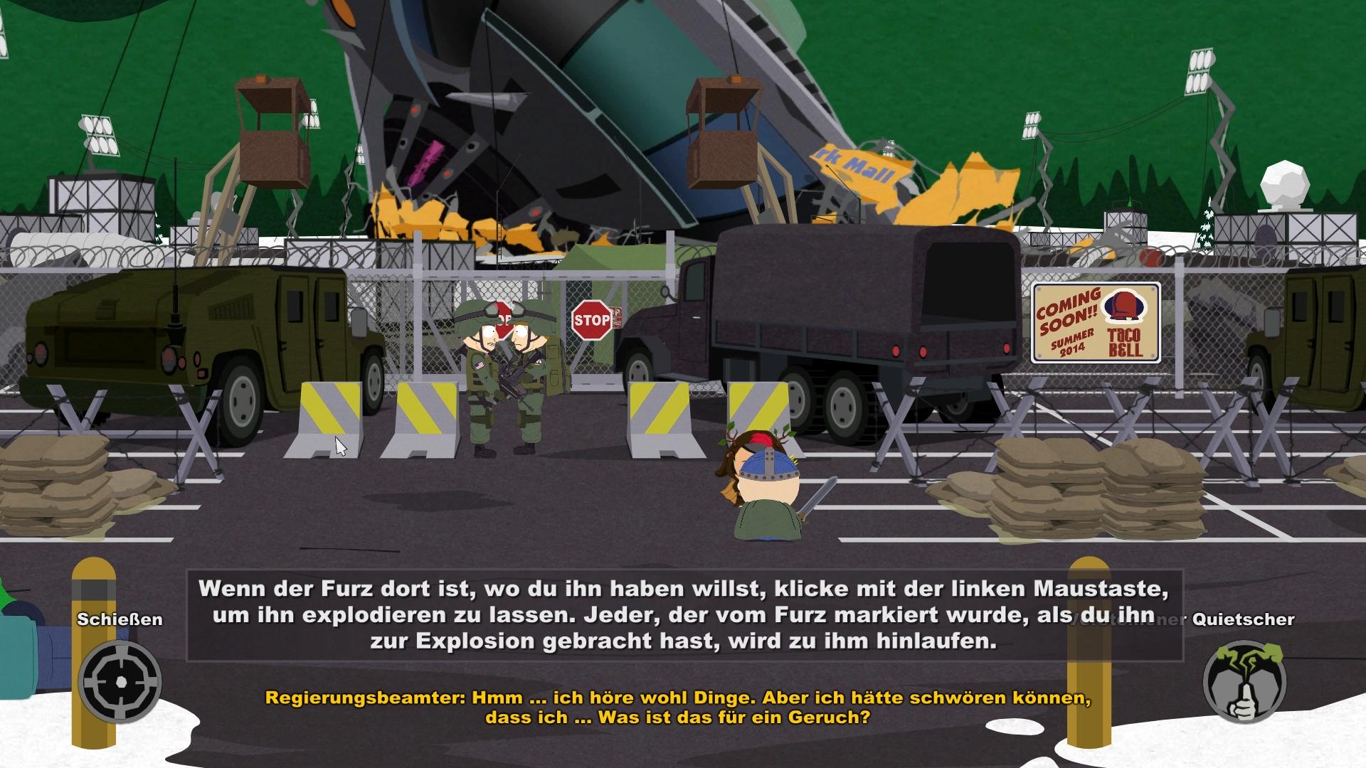 Randy bringt dir auf dem Klo den "Verstohlener Quietscher" (Sneaky Squeaker) Furz bei, den du gleich mal an Mr. Mackey austesten darfst. Der einzige Weg jetzt noch an dein Foto zu kommen, besteht darin Randy zu helfen die Pläne der Aliens aufzudecken. Fahr mit dem Timmy Express zum ehemaligen Einkaufszentrum (City Mall) <5>, wo sich jetzt eine Menschentraube gebildet hat, die den Bau des neuen Taco Bell beobachtet. Einer der Schaulustigen stellt zu detaillierte Fragen über die Speisekarte und Enchiritos. Woraufhin ihn die Sicherheitsleute ausschalten und die Menschenmasse sich auflöst. Du musst jetzt einen Weg finden an den beiden Wachleuten vorbei aufs Gelände zu gelangen. Dabei hilft dir dein neuer "Verstohlener Quietscher" (Sneaky Squeaker) Furz. Höchstwahrscheinlich wirst du beide einzeln ablenken und dann schnell reinlaufen müssen. Stell dich neben die Wachen, lenk einen Furz in die andere Richtung, sodass zumindest die Wache bei dir reagiert und dann einen weiteren, der beide noch mal in die gleiche Richtung lenkt. Die Reichweite des Furzgeräuschs zeichnet sich bräunlich auf den Soldaten ab, sobald du den Furz selbst steuern kannst.