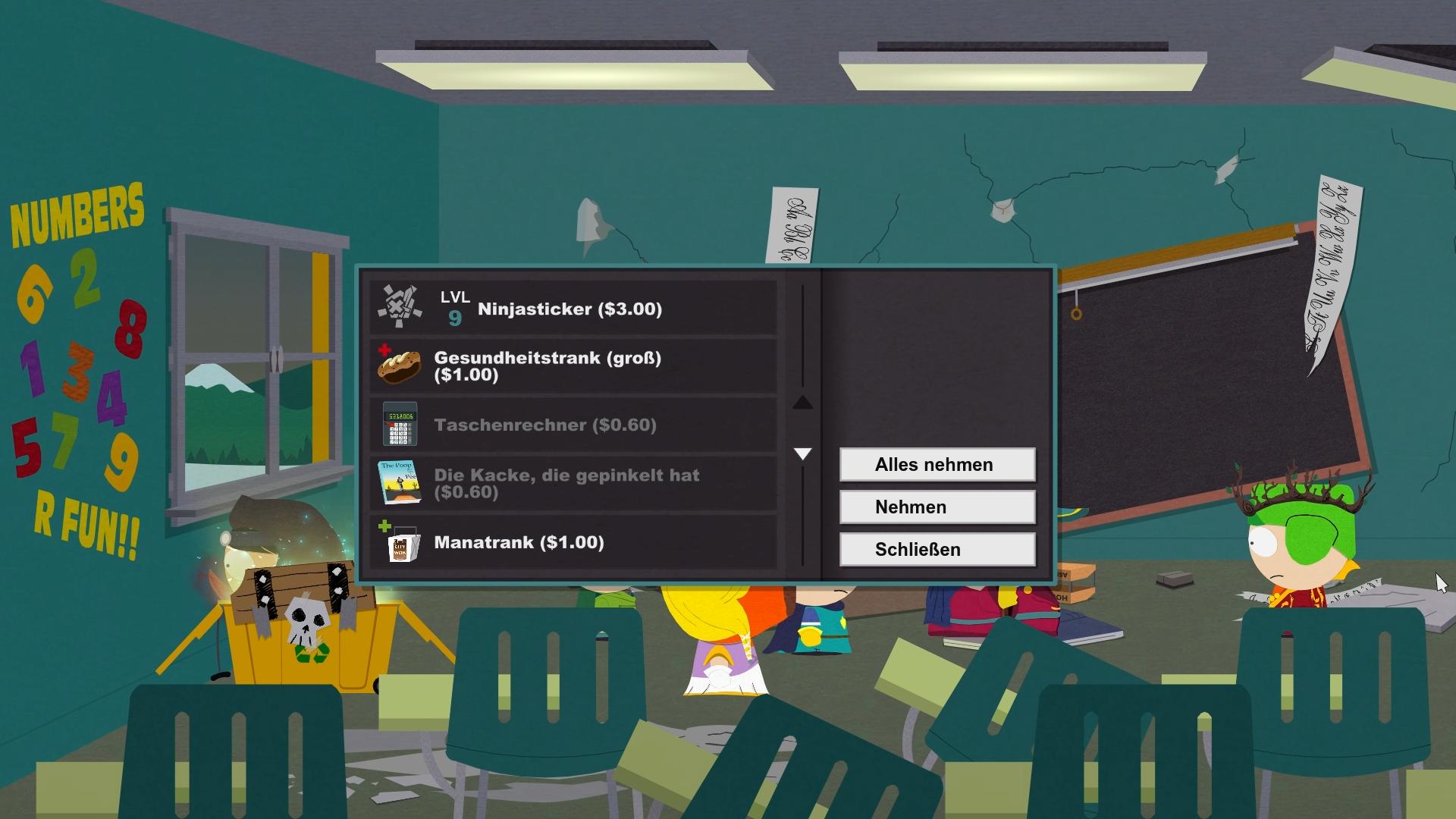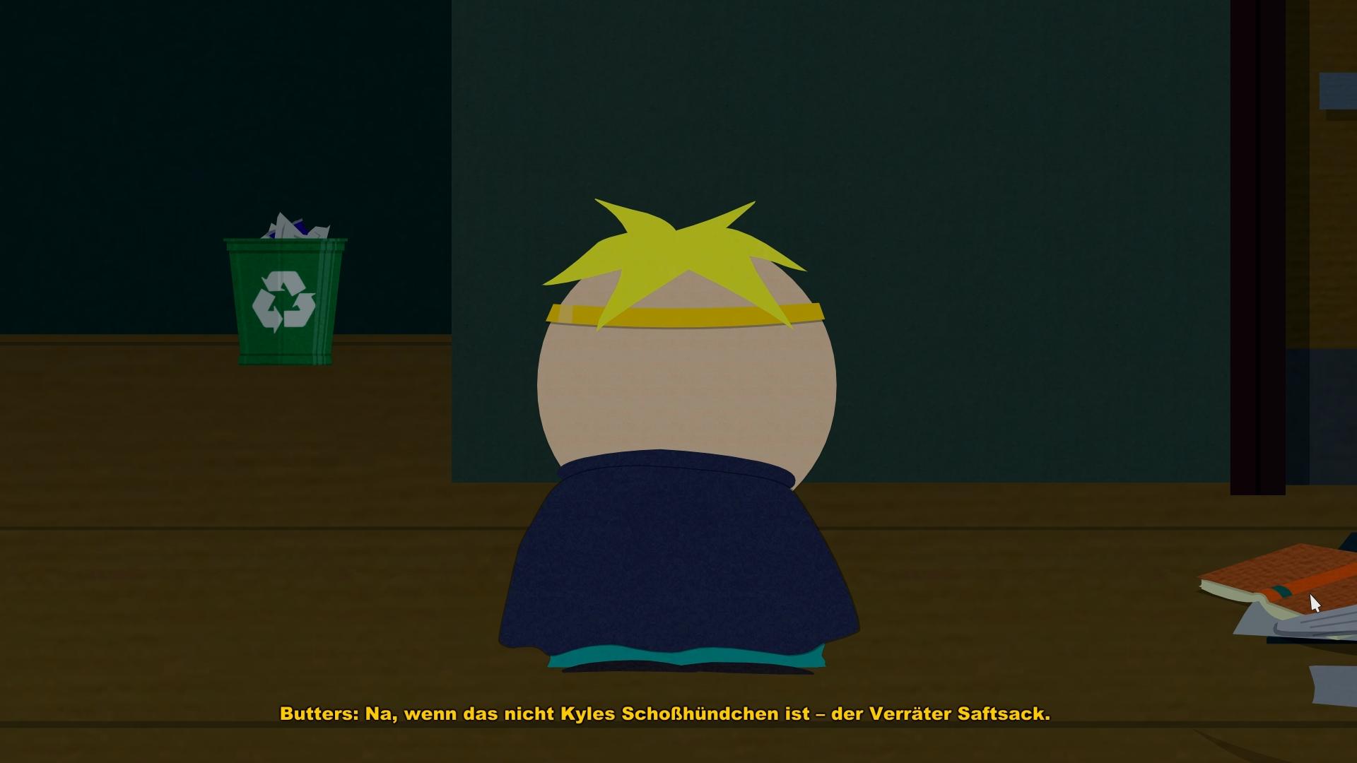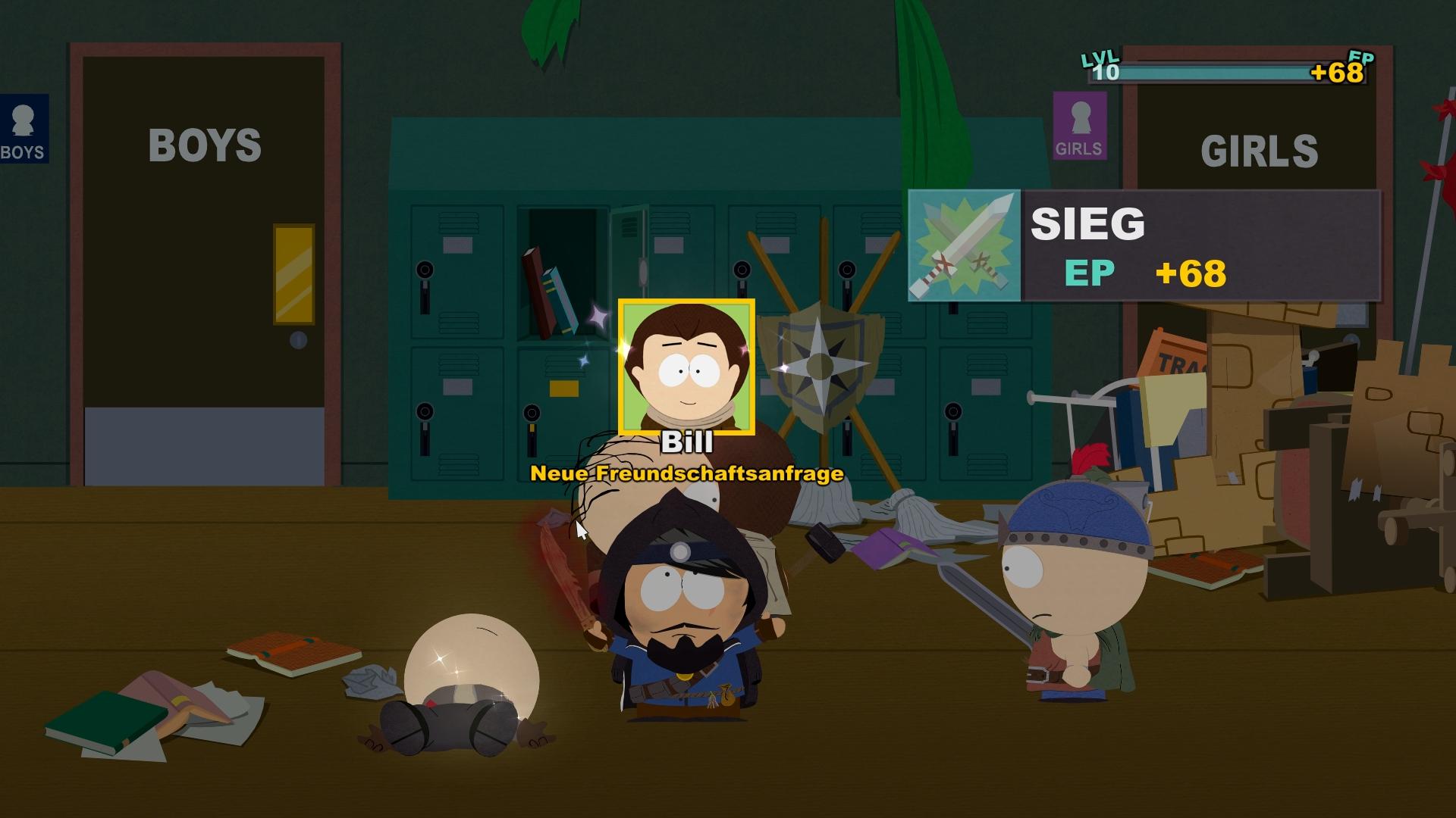 Folg dem Gang um die nächste Ecke. Kyle / Cartman werden dich zum finalen Schlag auffordern. Bevor du den 4. Klasse Raum links betrittst, solltest du aber erst mal rechts in den von der 5. Klasse. Befreie dort den Jungen in der Ecke und heile ihn, um die Lemmiwinks Freundschaftsanfrage zu bekommen. Im angestrebten Klassenraum musst du dich letztlich gegen einen von beiden entscheiden. Schlag Cartman oder Kyle zum Start des Endkampfes.