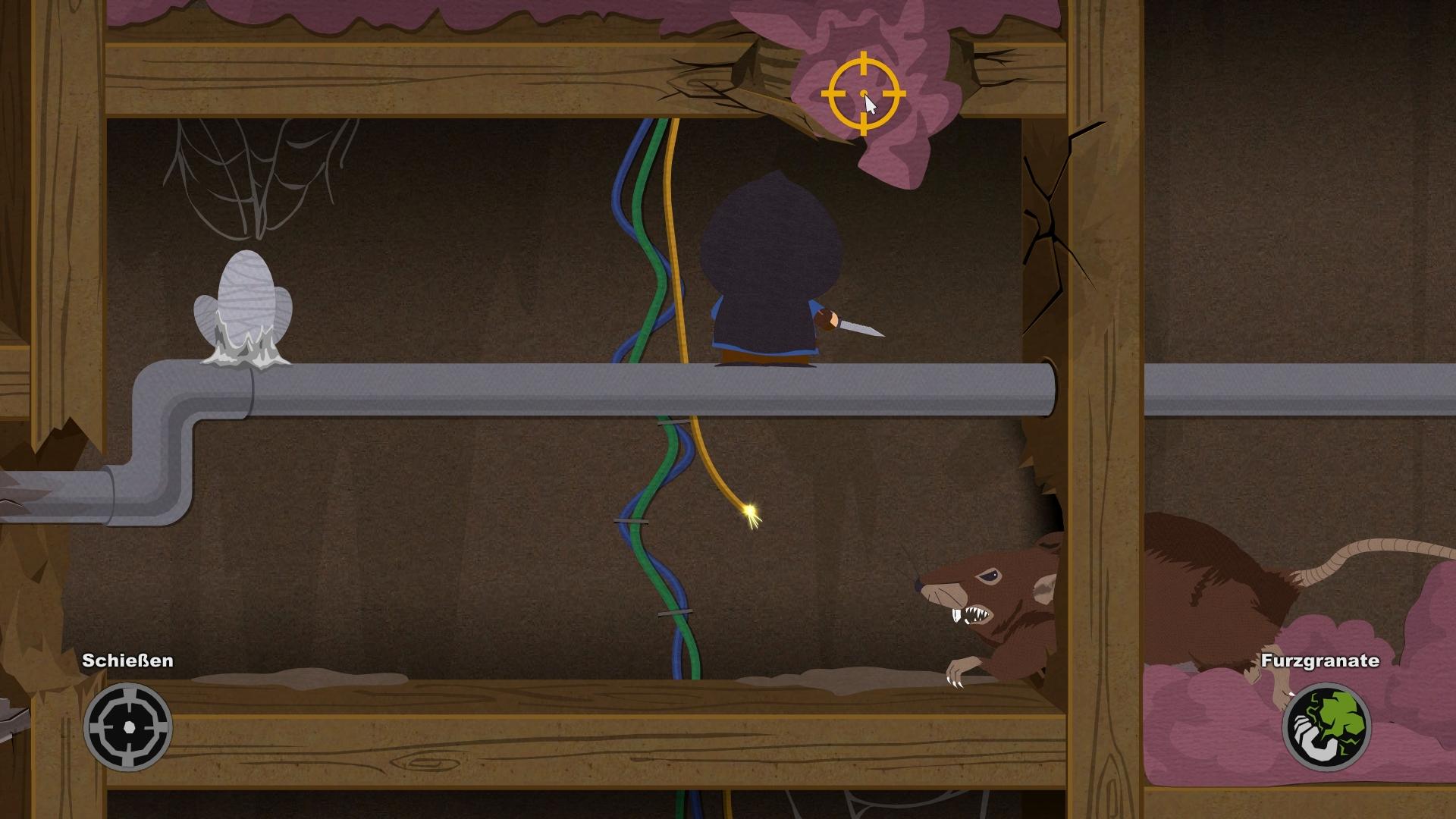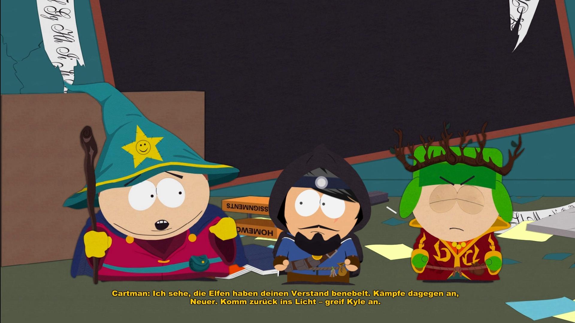 Kyle: Der Elfen-König ist eigentlich wie Cartman nur ohne Heilfähigkeiten. Dafür richten seine Angriffe aber mehr Schaden an. Gegen Ende wirst du ebenfalls auf einer Taste rumhacken müssen, um zu gewinnen.