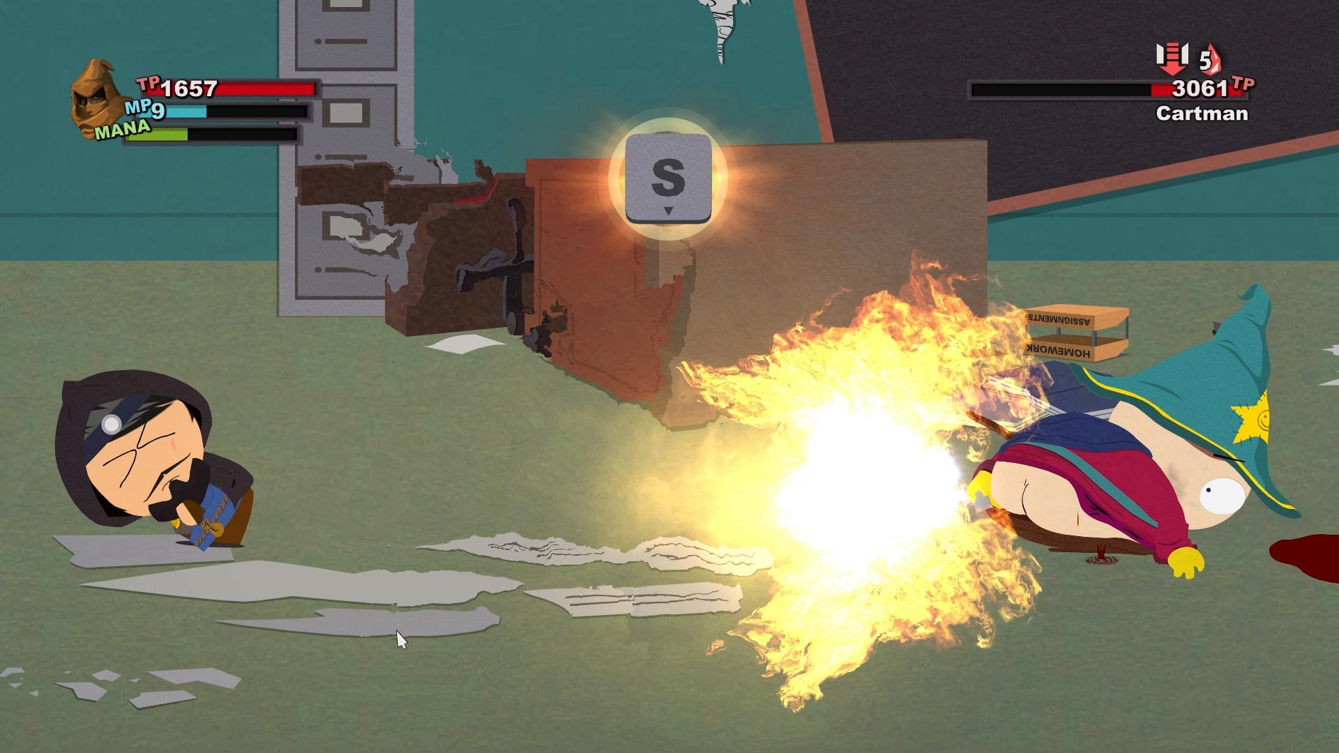 Cartman: Der Großmagus ist nicht sonderlich schwer zu bezwingen. Er hat eine Reihe von Elementarangriffen, die viel Schaden anrichten und kann sich selbst mit Cheesy Poofs heilen. Aber wenn du seine Heilfähigkeiten mit einem "angewidert" (grossed out) Debuff unterbindest, vereinfacht das den Kampf drastisch. Eventuell musst du dich während des Kampfes seiner Zauberer Kraft erwehren. Hack auf dem angezeigten Button rum, bis Cartman down geht.