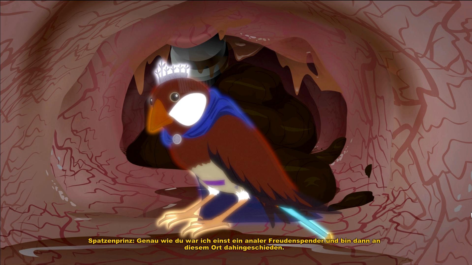 Bei dem Vibrator, etwas weiter den Dickdarm entlang, musst du die zweite Billardkugel mit einem Nagasaki Furz zum platzen bringen. Das formt eine Rampe, über die du auf den Vibrator klettern kannst. Vom hinteren Ende aus kannst du dich dann mit der Analsonde auf den Kronkorken teleportieren und den Vibrator aktivieren. Der blockierte Darm wird damit frei und ermöglicht die Sicht auf zwei Wachleute der Regierung. Bei ihnen gibt es keine Alternativlösung zur Beseitigung. Töte sie und der Weg zur Snuke ist endlich frei.