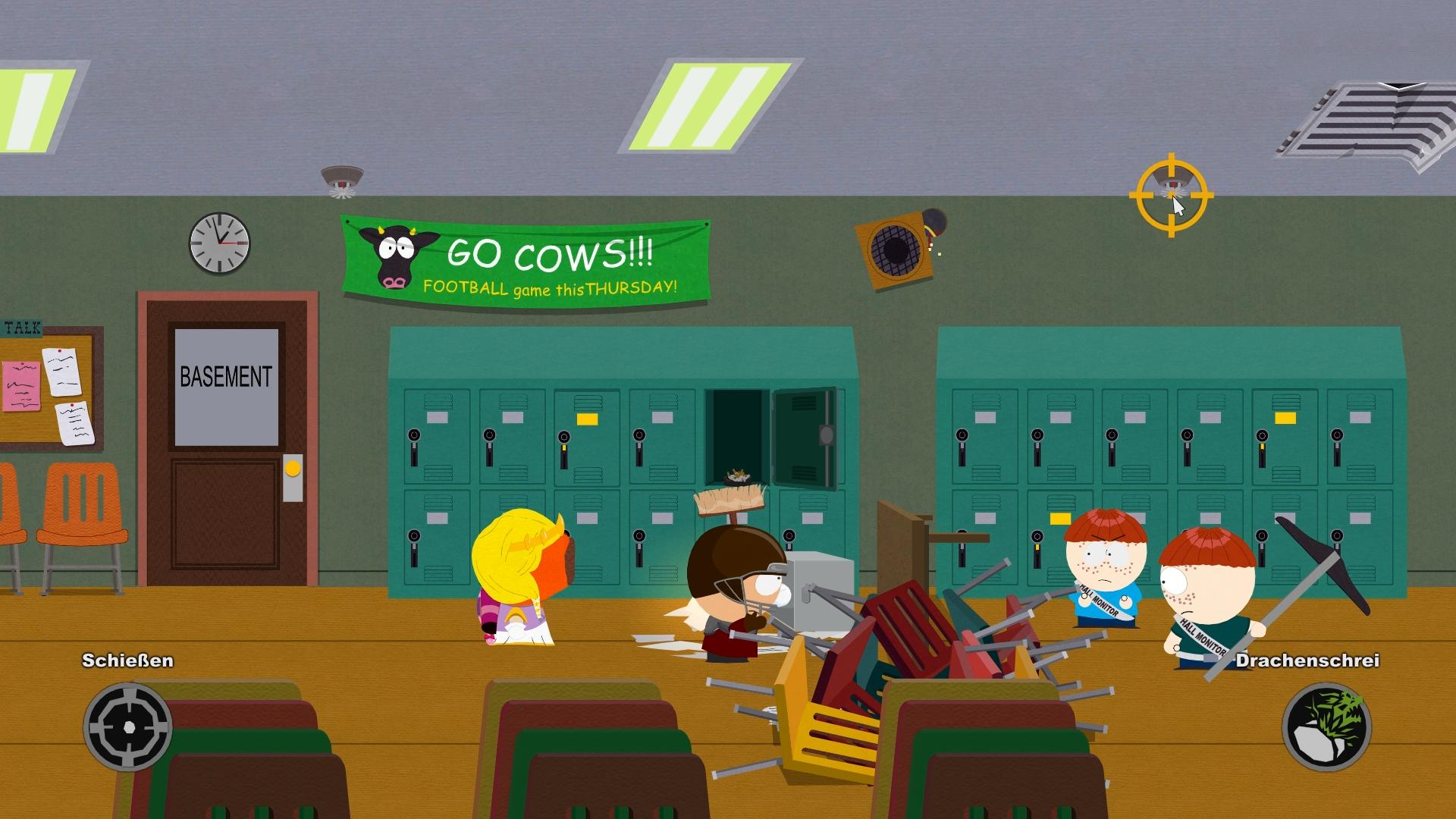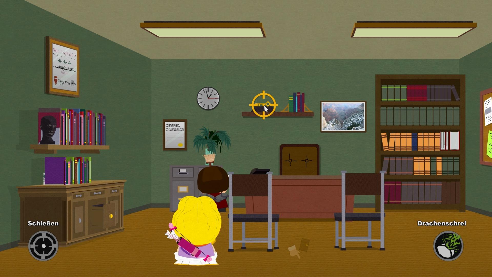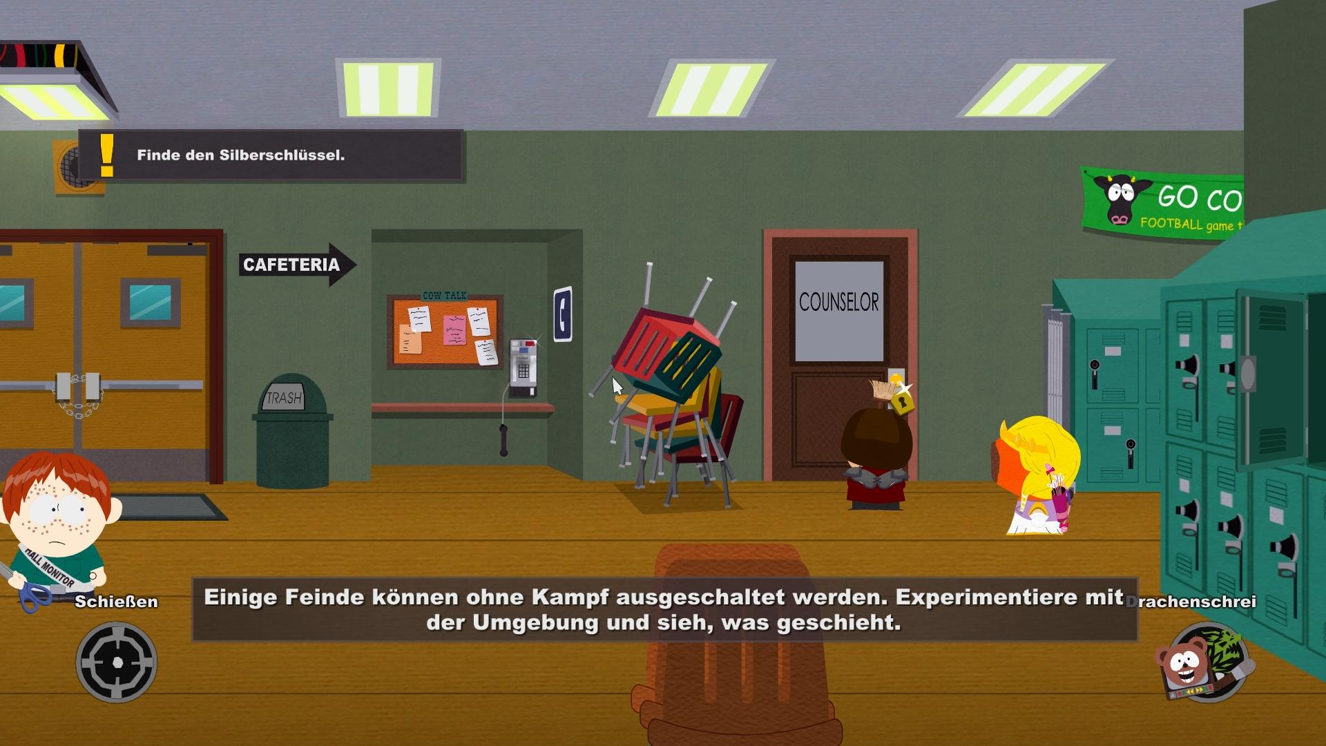 Wechsel dein aktives Gruppenmitglied zu Butters und lasse ihn durch ein weiteres "Begleiter befehligen" (Buddy Command) den verletzten Jungen versorgen. Er gibt dir daraufhin den Silberschlüssel (silver key). Geh damit in Mr. Mackeys Büro, schieß den Goldschlüssel (gold key) vom Regal hinterm Schreibtisch und benutz den wiederum, um die Cafeteria Türen zu öffnen.