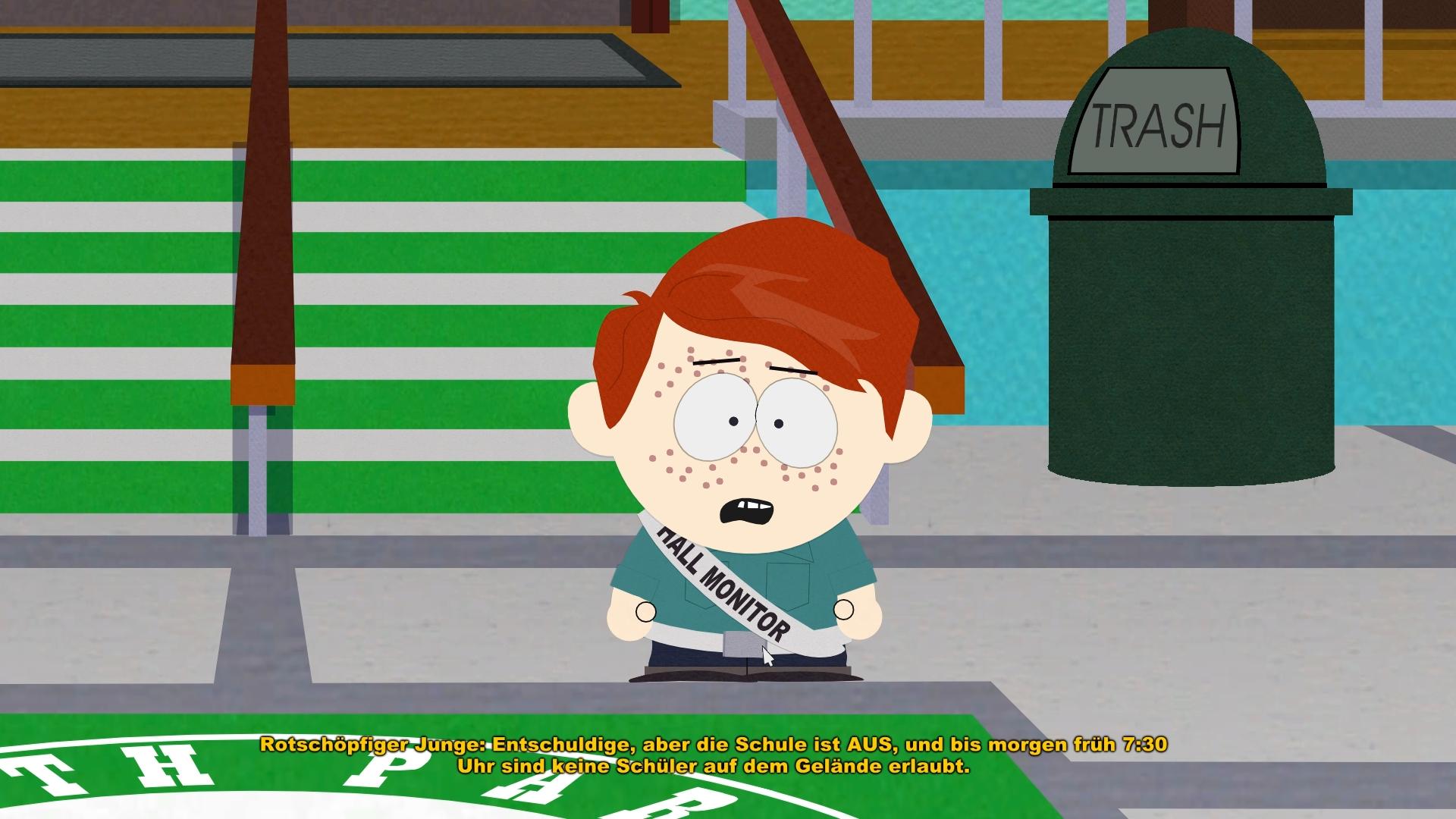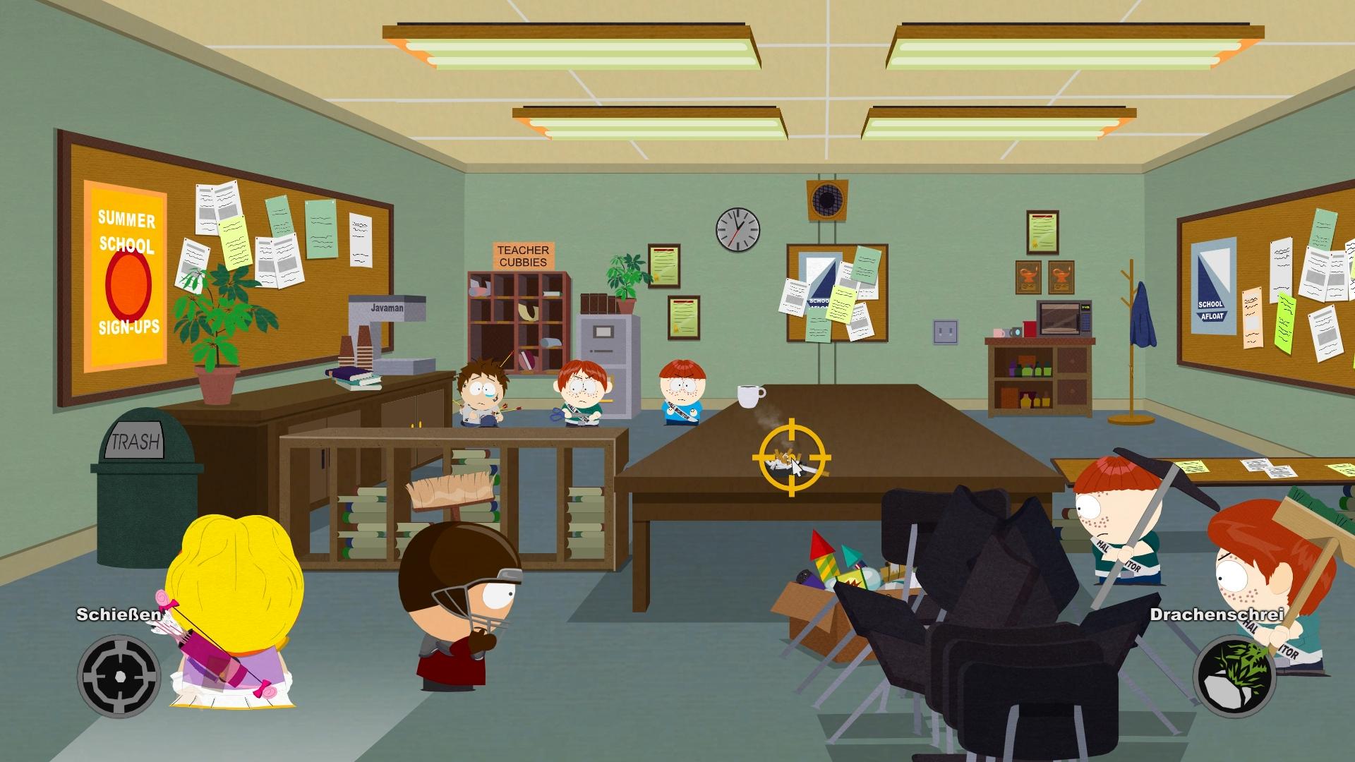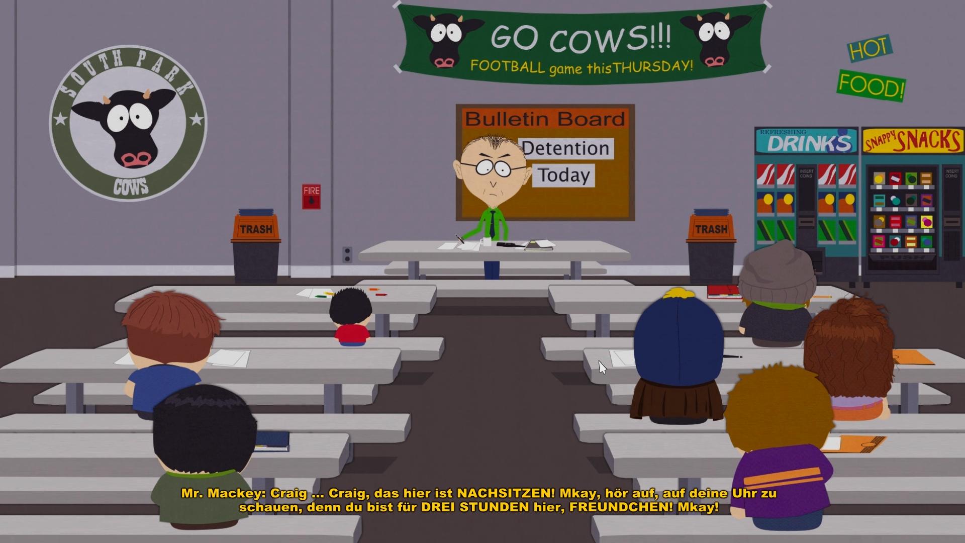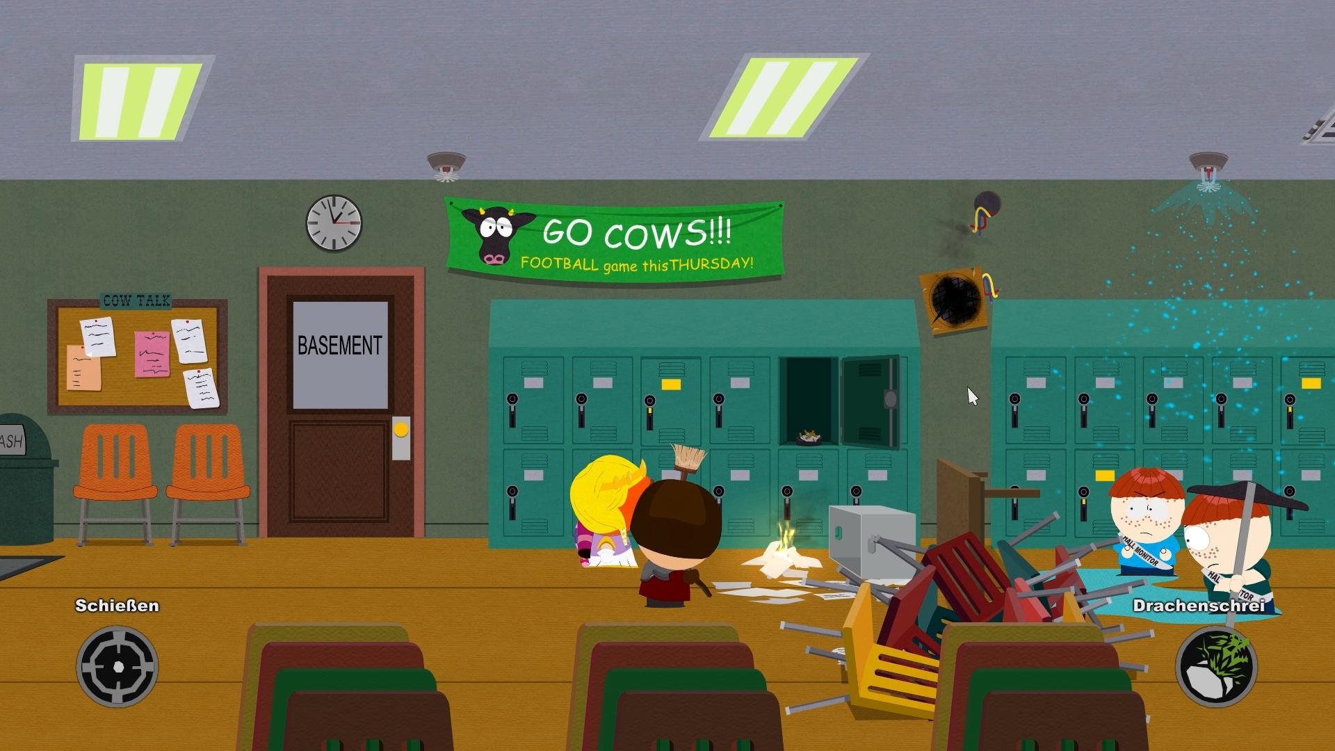 Wechsel dein aktives Gruppenmitglied zu Butters und lasse ihn durch ein weiteres "Begleiter befehligen" (Buddy Command) den verletzten Jungen versorgen. Er gibt dir daraufhin den Silberschlüssel (silver key). Geh damit in Mr. Mackeys Büro, schieß den Goldschlüssel (gold key) vom Regal hinterm Schreibtisch und benutz den wiederum, um die Cafeteria Türen zu öffnen.