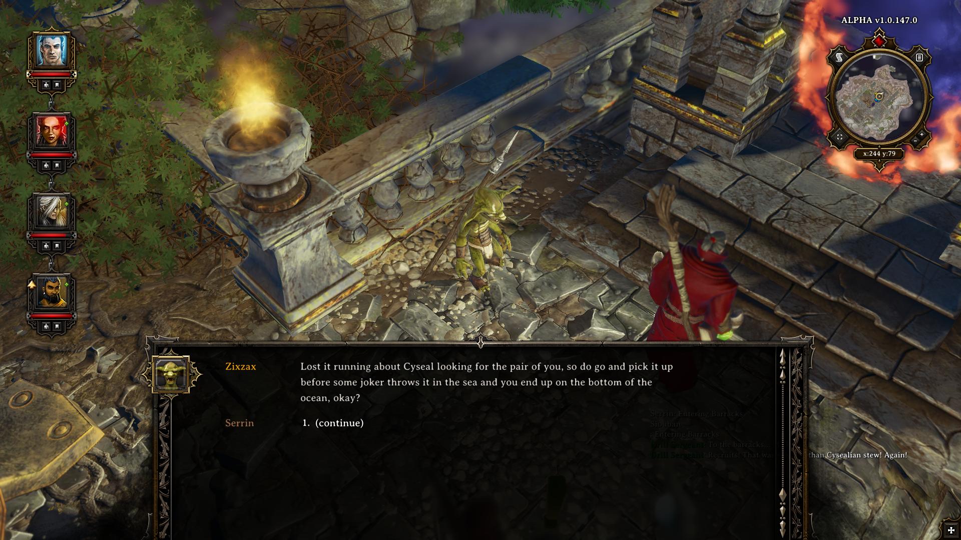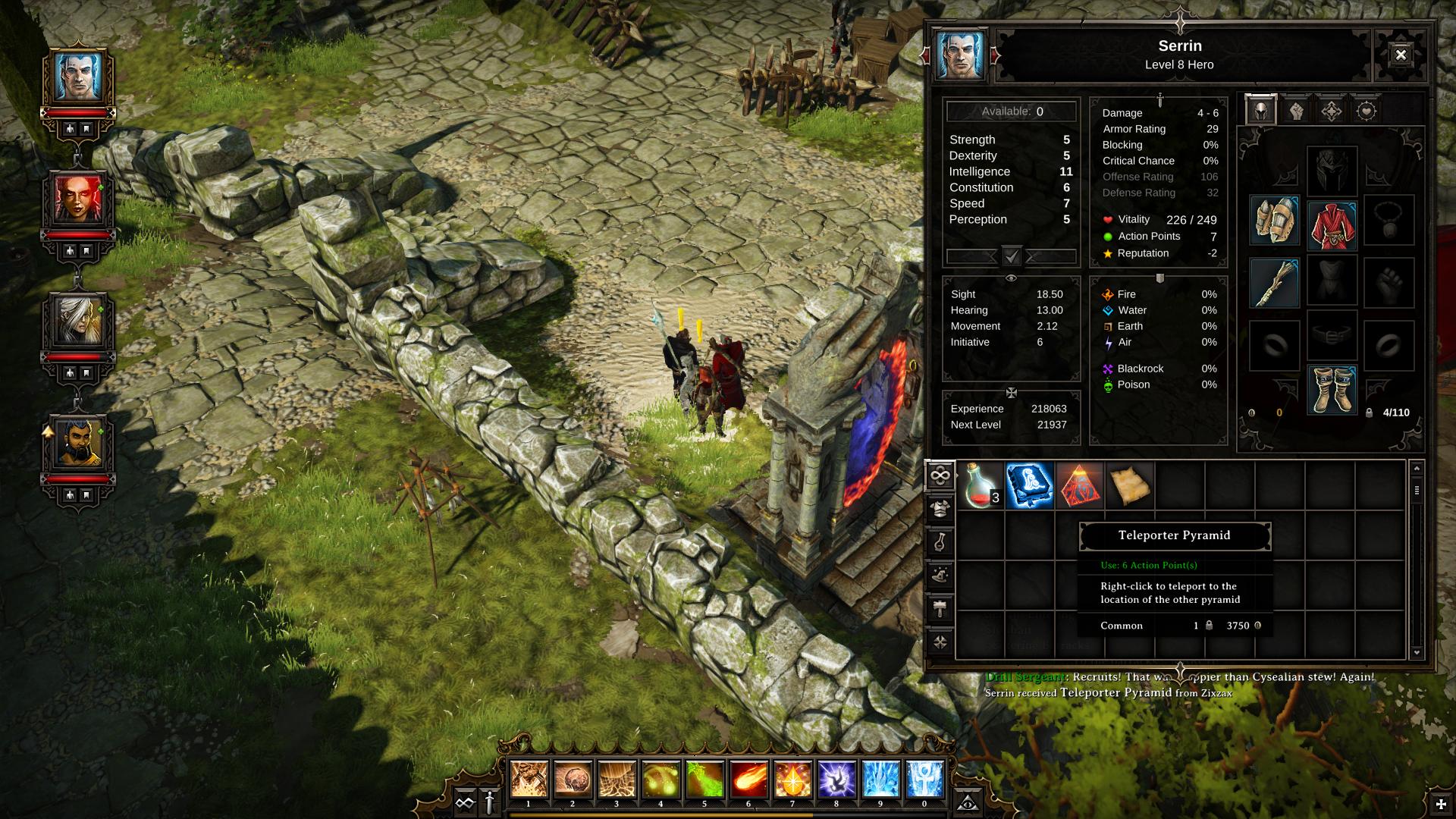 Neben den Portalen erhält man eine Teleporter-Pyramide mit der man jederzeit zu einem zeitlosen Ort zurückkehren kann, ähnlich des Einsprengsels bzw. eurer Festung in Baldur's Gate 2 - Thron des Bhaal bzw. anderen BioWare-Rollenspielen. Was man übrigens mit einer gehörigen Prise Humor beigebracht bekommt. Während das Spiel eigentlich größtenteils den typischen mittelalterlichen Stil hat, taucht plötzlich ein Imp auf, teleportiert einen auf irgendeine übernatürliche Ebene, wo ein Schwein davon erzählt ein berühmter Schriftsteller werden zu wollen. Beim Versuch die Ebene zu verlassen, wird man vom Imp gebeten eine weitere Pyramide zu finden, die angeblich irgendwer ins Meer geworfen hat oder sowas. Durch einen Klick auf die erhaltene Pyramide, wird die eigene Gruppe zur zweiten teleportiert und steht plötzlich im Badezimmer der Bürgermeister-Gattin. Die sich lauthals aus der Badewanne heraus beschwert, dass nach dem Wichtel jetzt auch noch eine ganze Abenteurergruppe aus dem Nichts auftaucht! Was dem Spieler mit Antwortmöglichkeiten überlässt wie: "Das ist aber eine ungewöhnliche Verwechslung, nicht wahr? Da werden wir morgen eine Geschichte zu erzählen haben!", oder "Ich schwöre, ich bringe den Wichtel um, der mich hierher geschickt hat! Zusammen mit jedem, der diesen Scherz mit angesehen hat!".