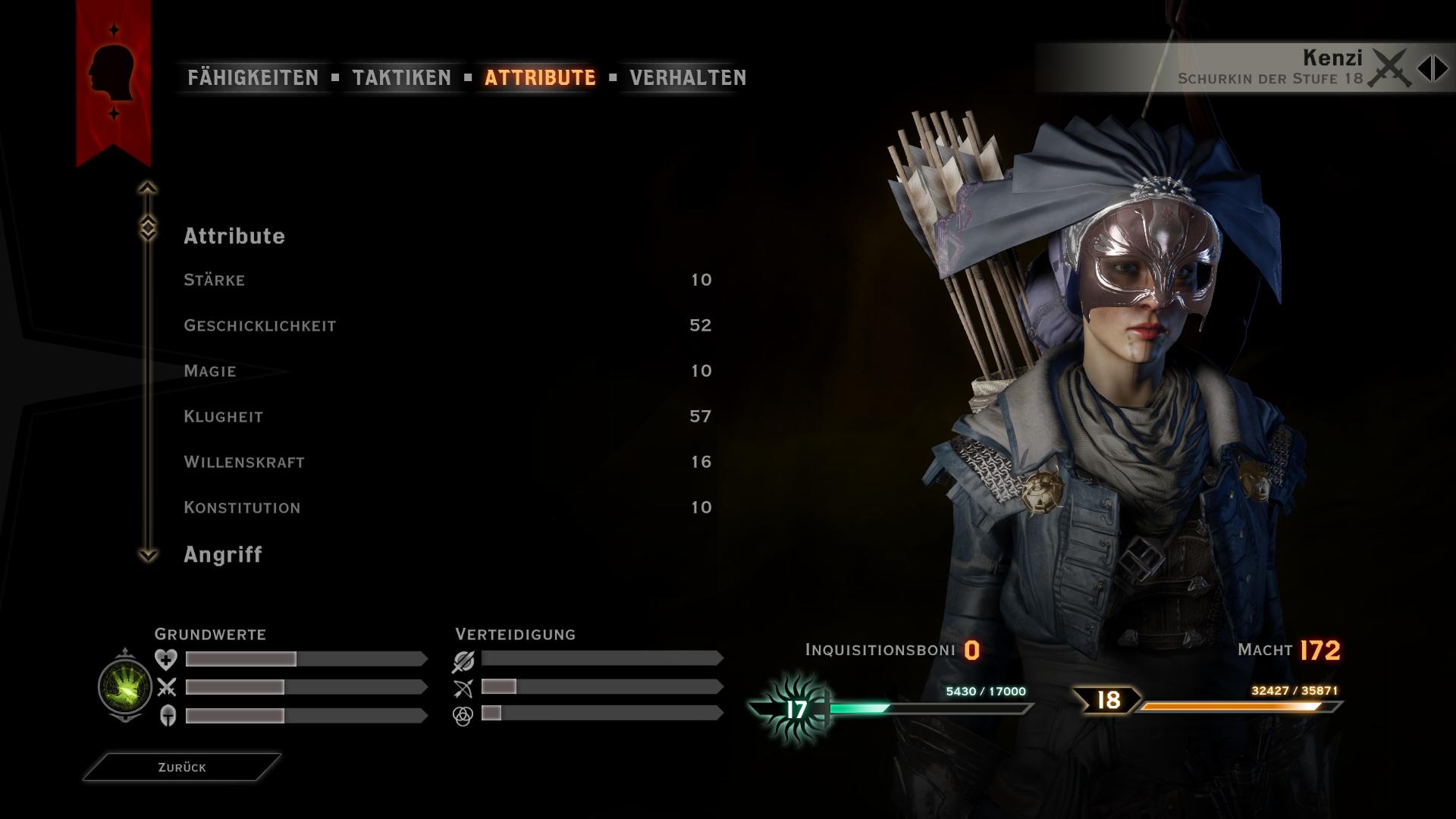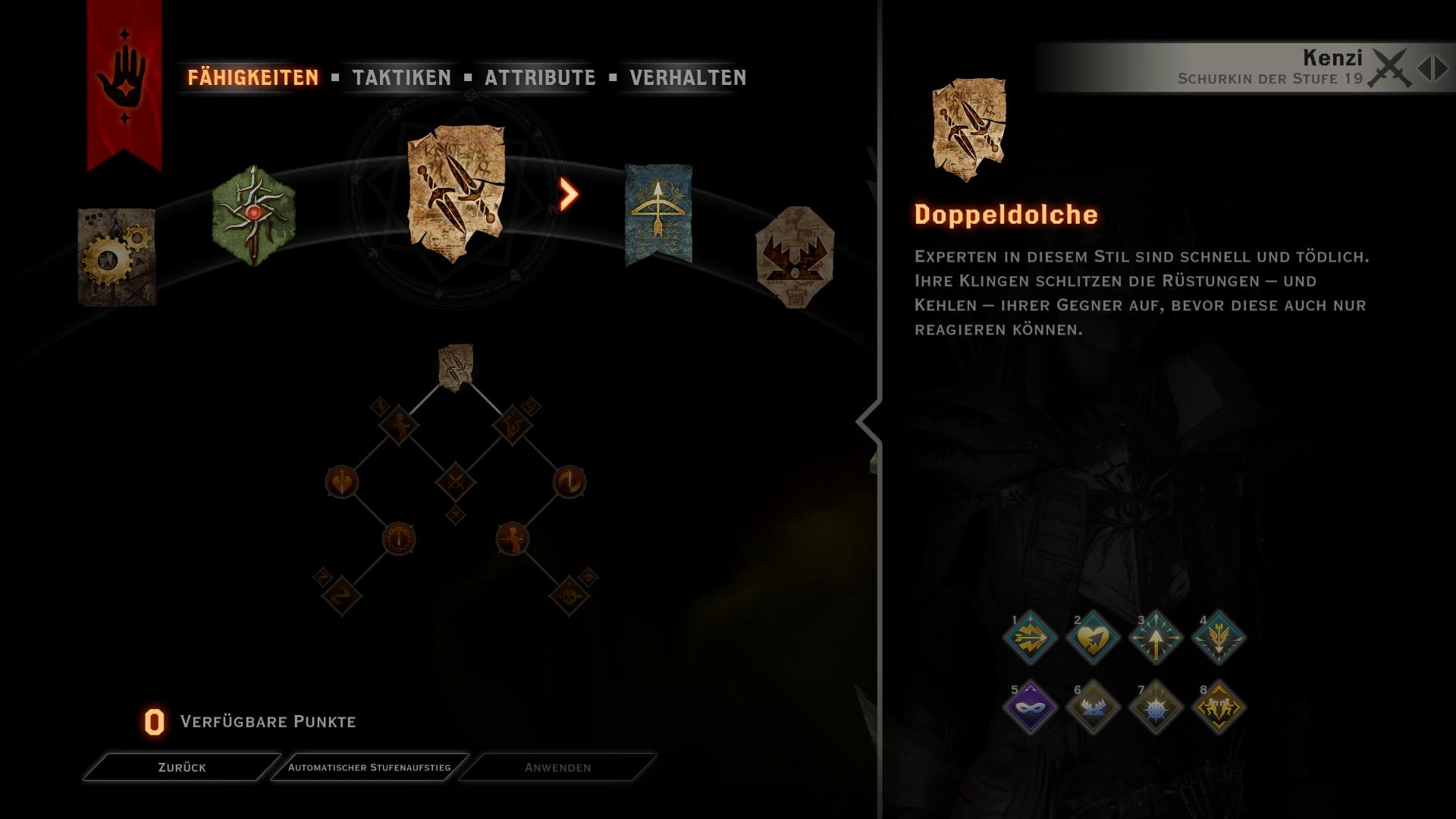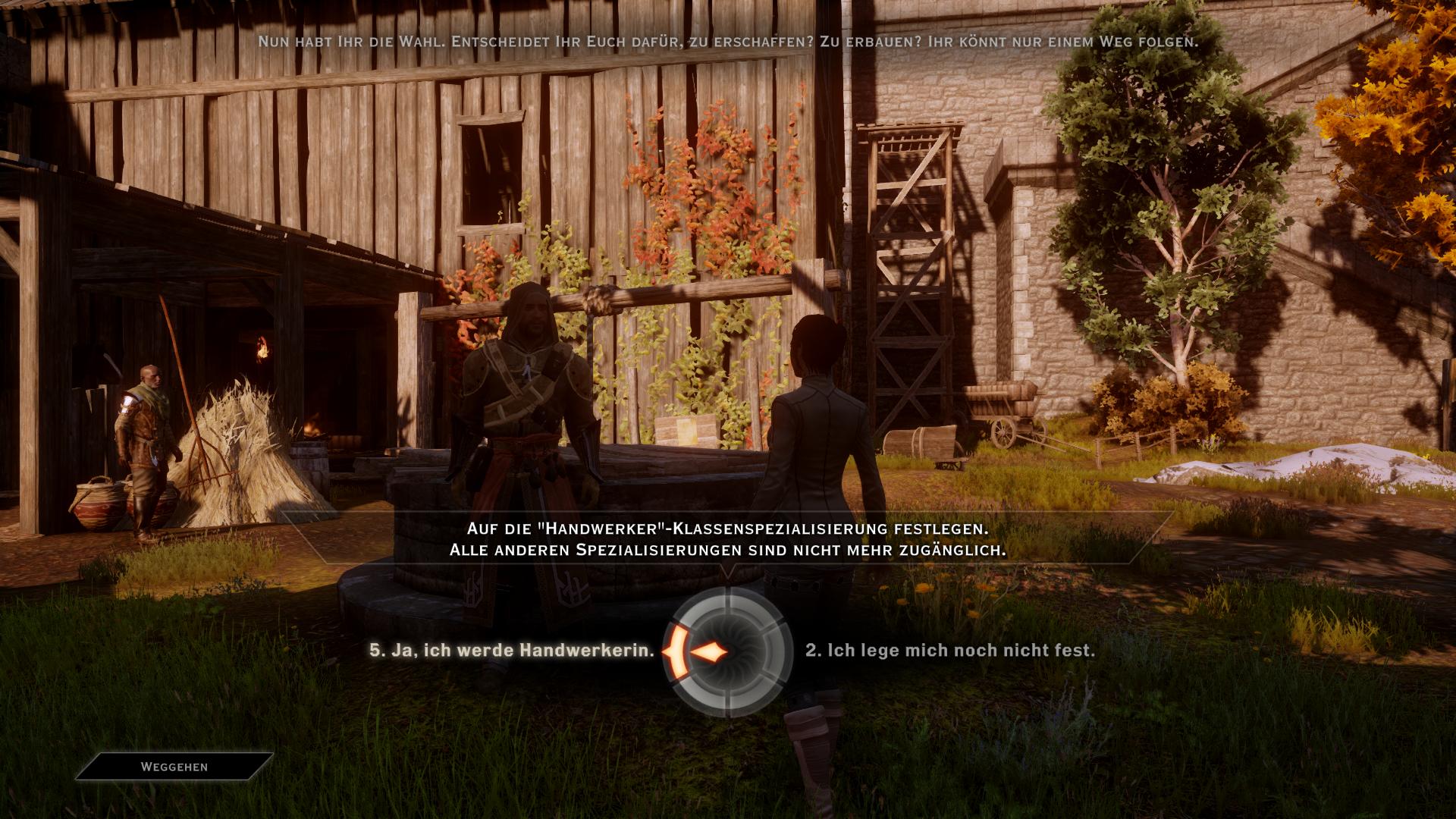 Zu diesen Bewohnern zählen im Spielverlauf ebenfalls drei Trainer für Klassenspezialisierungen. Durch deren Klassen-Quests kann die Fähigkeitenauswahl des eigenen Charakters um einen Baum erweitert werden. Denn jede der drei Klassen, verfügt standardmäßig über vier verschiedene Fähigkeitenbäume. Schurken besitzen z.B. einen "Bogen" Baum, um den Charakter eher in die Jäger Kategorie zu lenken, oder einen "Doppeldolche" Baum, damit er zum heimtückischen Nahkämpfer wird. Passend dazu gibt es einen "Sabotage" Baum für Gifte auf Dolchen oder Pfeilen und zu guter Letzt "Täuschung", um unsichtbar zu werden und weniger bedrohlich zu erscheinen. Mit den Spezialisierungen kommen beim Schurken dann noch mehr tödliche Angriffe für Nah- oder Fernkampf hinzu, sowie die Handhabung von Tränken. Wohingegen normale Krieger zu Templern oder Plünderern und Magier zu Nekromanten, Beschützern oder Spezialisten für Rissmagie werden können. Bedauerlicherweise schlägt Dragon Age Inquisition an dem Punkt den Massenmarktweg ein und beendet die Gestaltung des eigenen Charakters. Selbstverständlich kann dieser extrem detailliert optisch definiert werden und steht der "The Elder Scrolls" Konkurrenz in nichts nach, aber das Festlegen von Attributen o.ä. gibt es nicht. Die Wahl der Klasse bestimmt die Attribute und die werden nur durch passive Fähigkeiten oder die Ausrüstung im Laufe des Spiels verändert.