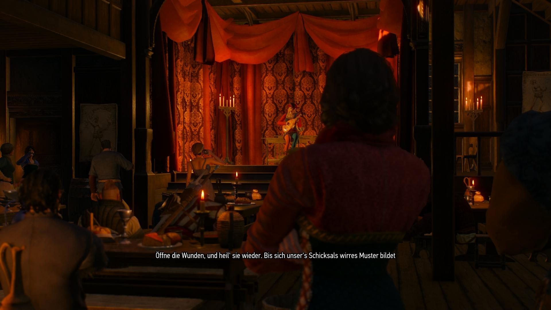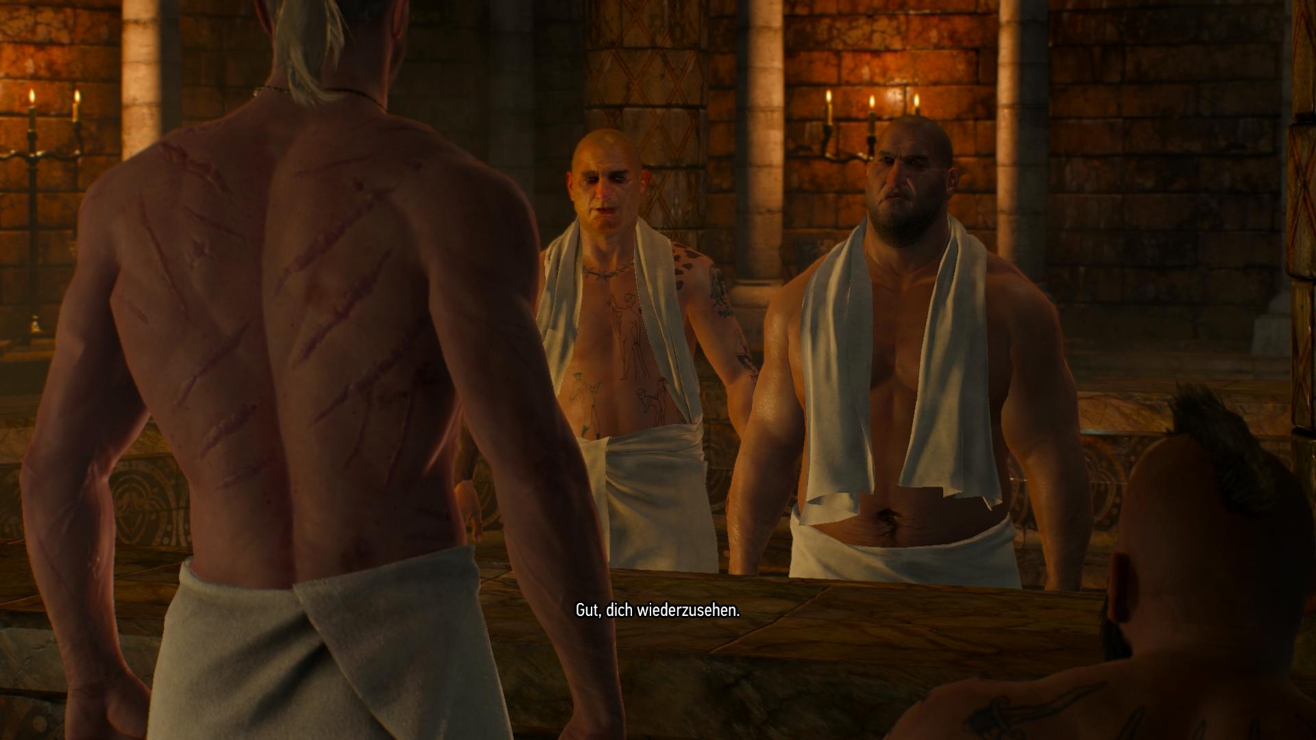 Neben den Hexersinnen zum Erfüllen der Quests, ist die eindeutige Stärke von Witcher 3 jedoch die Inszenierung. Textfenster, in denen ihr von einer unwichtigen Textwand erschlagen werden, gibt es in Witcher 3 gar nicht! Stattdessen wird jede noch so kleine Quest in einer gut dargebrachten, geskripteten Einführungs- und Abschlusssequenz von den beteiligten Charakteren erzählt. Einzige Ausnahme sind die Hexeraufträge, zum Monstertöten, welche tatsächlich nur aus "Hallo, ich habe deinen Aushang gesehen. Wo geht's denn zum Problem?" bestehen. Jede andere Quest bietet mehrminütige Einführungen und Enden und jede Hauptquest drei bis fünf Unteraufgaben mit zusätzlichen Szenen. Dabei sind nicht etwas Erzählungen gemeint, bei denen die bekannten Charaktere um einen Kartentisch stehen, sich jedes mal gleich bewegen und nur etwas anderes erzählen. Nein! In Witcher 3 findet jede Unterhaltung vor einer anderen Kulisse statt, die nur dafür gemacht zu sein scheint. Wenn der Barde Rittersporn gefunden werden muss, dann sucht Geralt eine Taverne auf, in der eine Sängerin zunächst auf der Bühne ein Lied trällert und das gesamte Publikum mitgerissen ist. Stürzt Cirilla ins eisig kalte Meer, dann findet die nächste Unterhaltung in einer Sauna statt, damit sie sich wieder aufwärmt. Die Entwickler haben unglaublich viel Arbeit in jedes noch so kleine Detail gesteckt und dabei unzählige Szenen eingebaut, die große Publisher aus Kostengründen liebend gerne weggestrichen hätten. Dadurch entstehen Dinge wie Schneeballschlachten zwischen Papa Geralt und Tochter Ciri, oder Geralt besäuft sich mit seinen Hexer-Kameraden, muss sich besoffenen Zustand - für den Spieler total verschwommenen - den im Hof eigeschlafenen Eskel wiederfinden und anschließend ziehen sich die drei Frauenkleider an und machen einen Spaßanruf bei der Magierloge mit dem Megaskop.