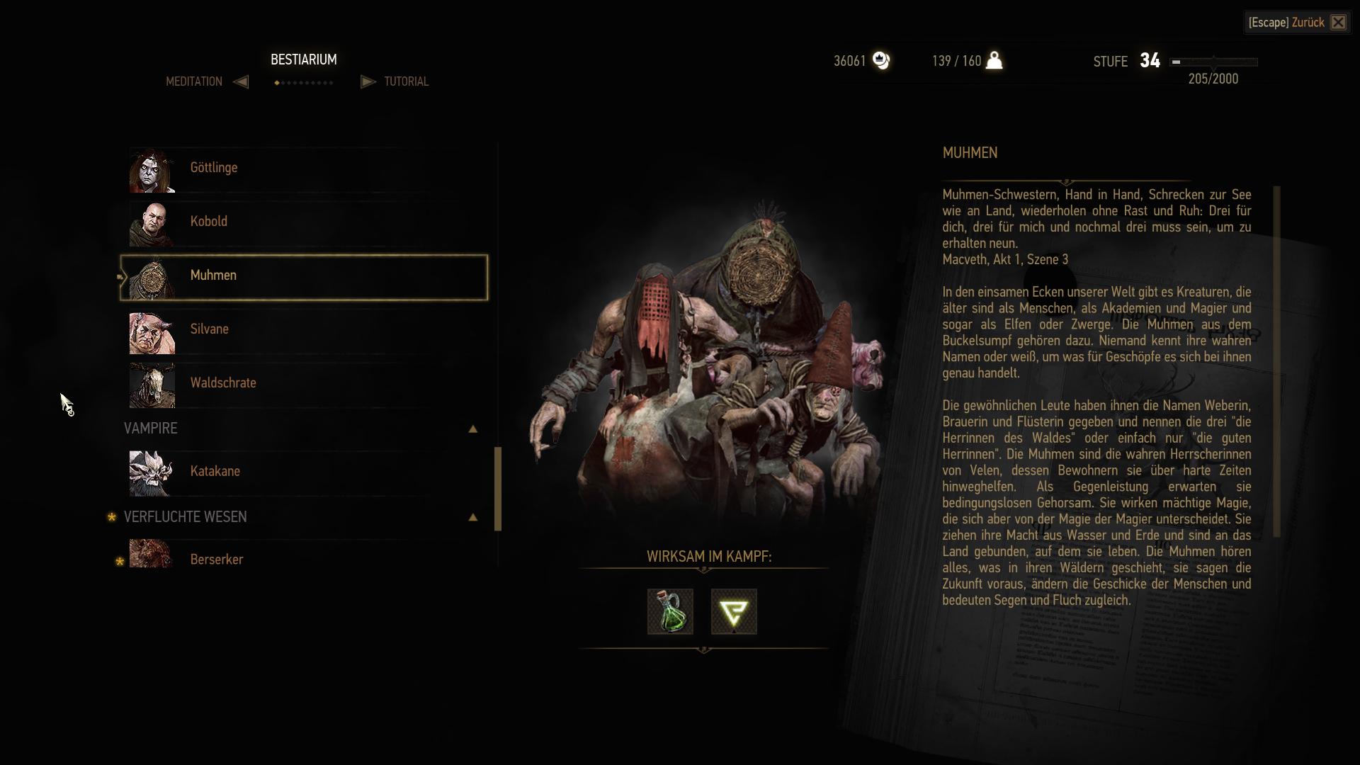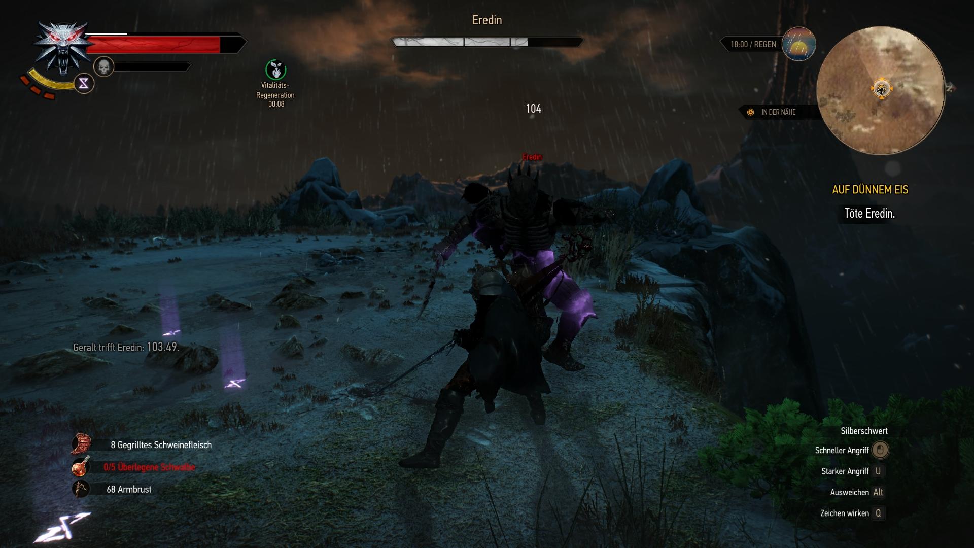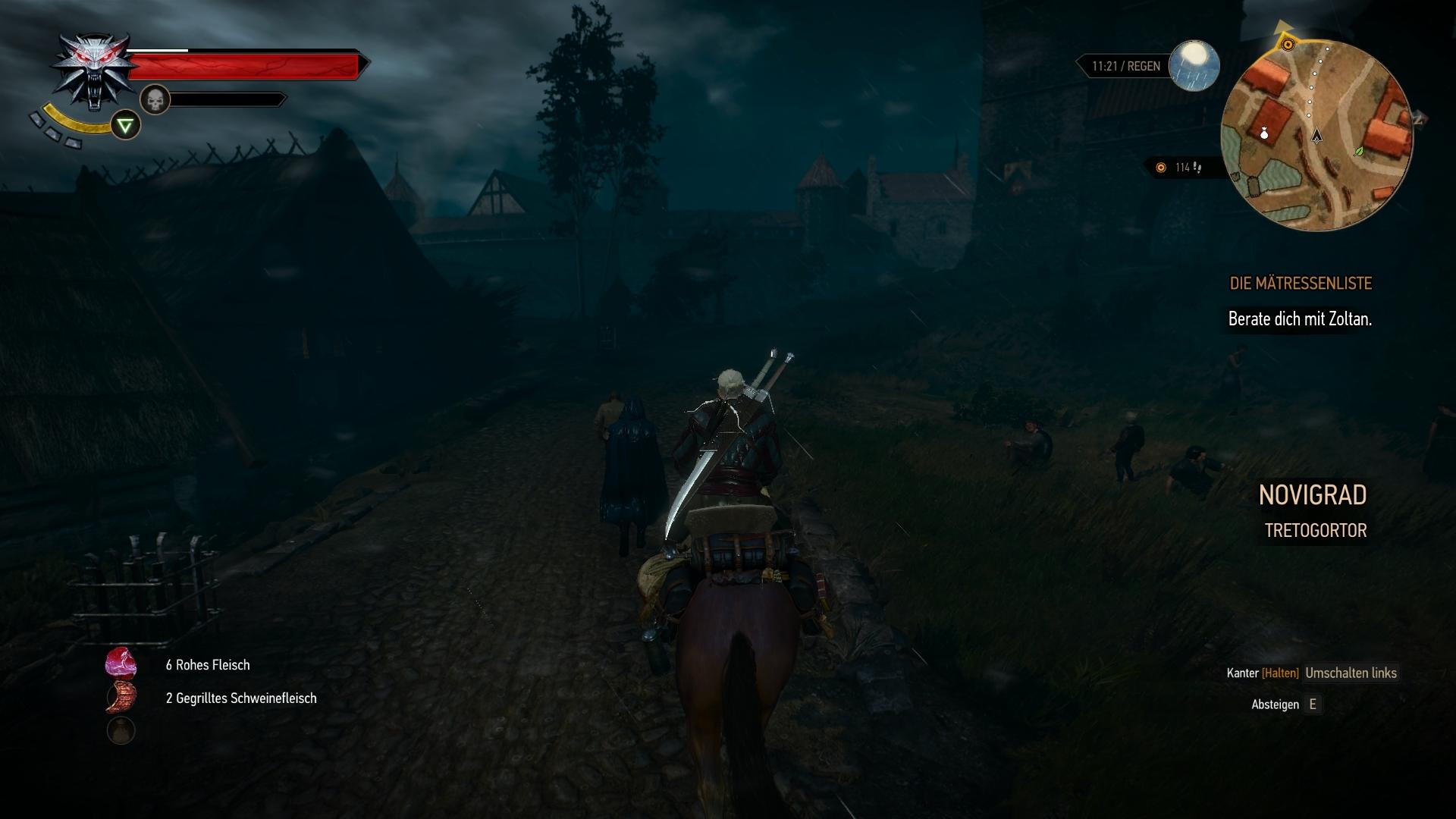 Neben den häufig leichten Standardkämpfen der Haupthandlung, werden Geralt vom Fußvolk auch die typischen Hexeraufträge angeboten, bei denen er "Flüche" brechen und somit bestimmte Monster im Zweikampf eliminieren muss. Für diese gesteigerten Herausforderungen hält das Bestarium des Spiels Tipps parat, wie z.B. welche Magie, Bombe oder welches Waffenöl besonders effizient sind. Solltet ihr gar nicht zurecht kommen, oder einfach nur die wunderbare Geschichte des Spiels erleben wollen, könnt ihr den Schwierigkeitsgrad auch ganz niedrig einstellen, wodurch alle Feinde beim ersten oder spätestens dritten Treffer automatisch sterben. Gesundheit gewinnt Geralt im oder außerhalb von Kämpfen durch Essen oder selbstgebraute Tränke zurück. Außerhalb von Kämpfen kann er zudem Meditieren, was das Schlafen-Prinzip aus vergleichbaren Rollenspielen ersetzt und automatisch sämtliche Tränke und Bomben wieder auffüllt.