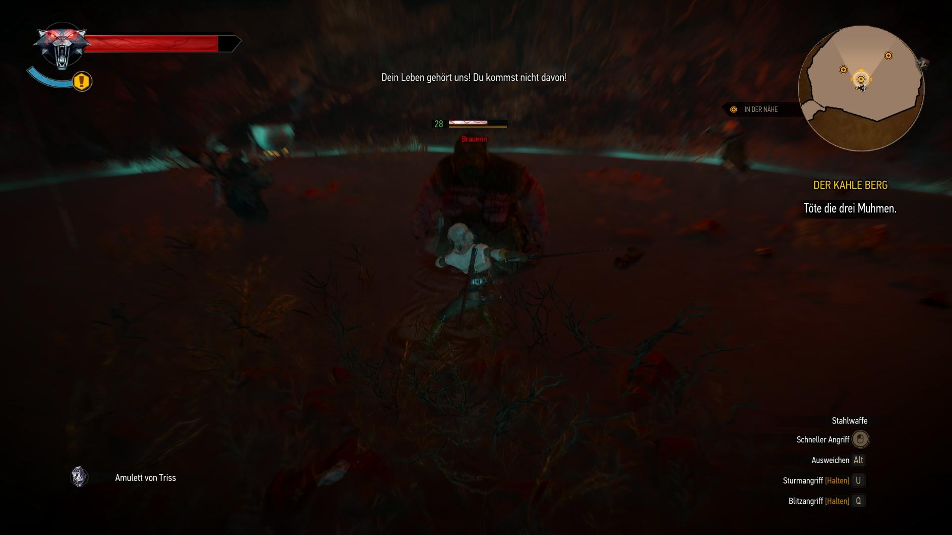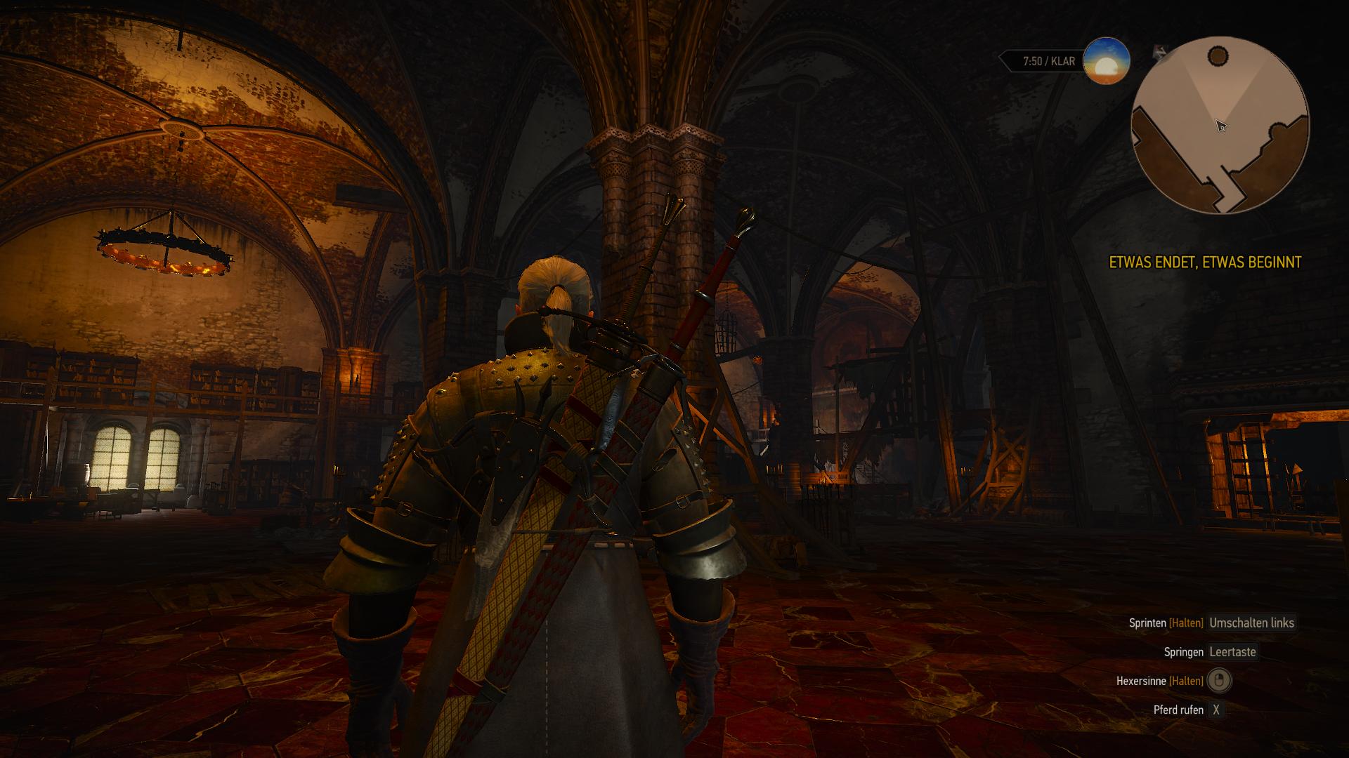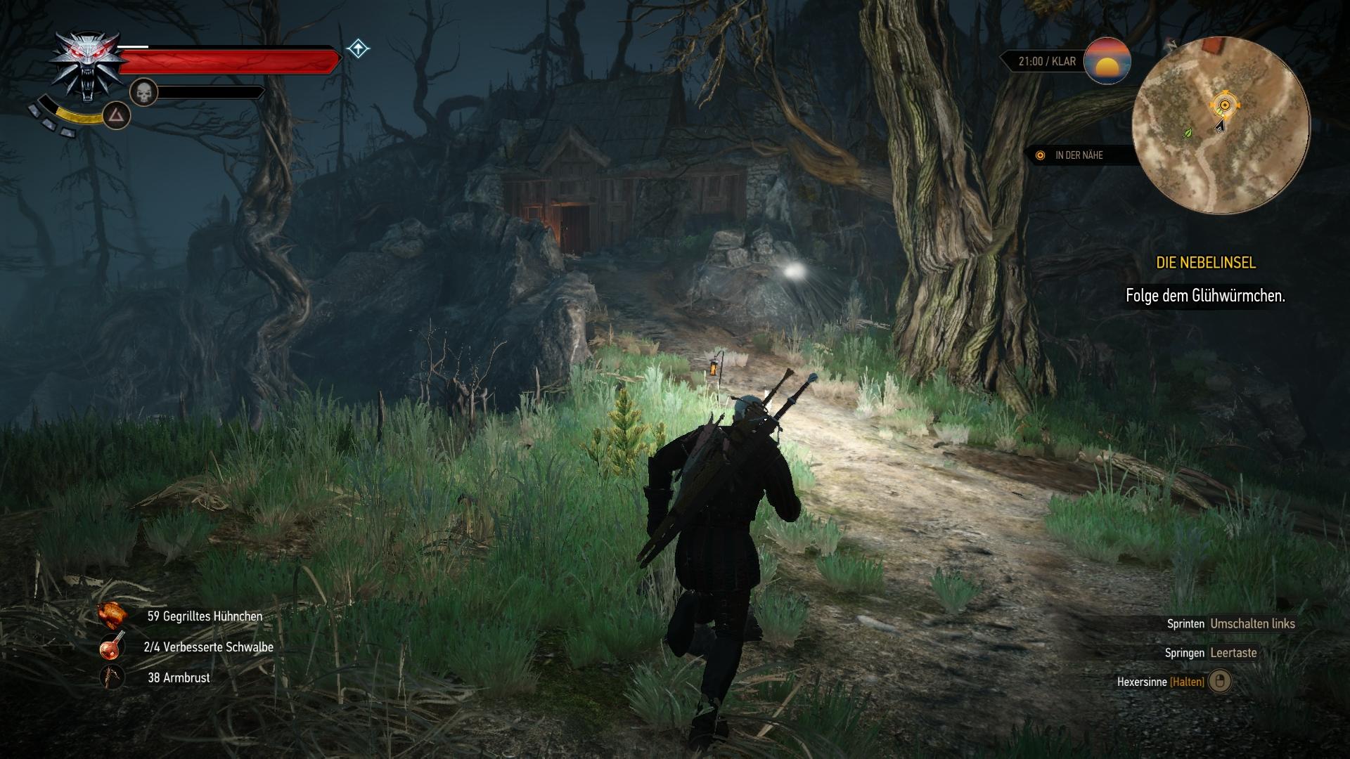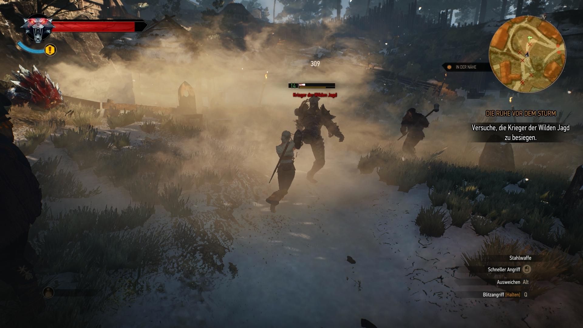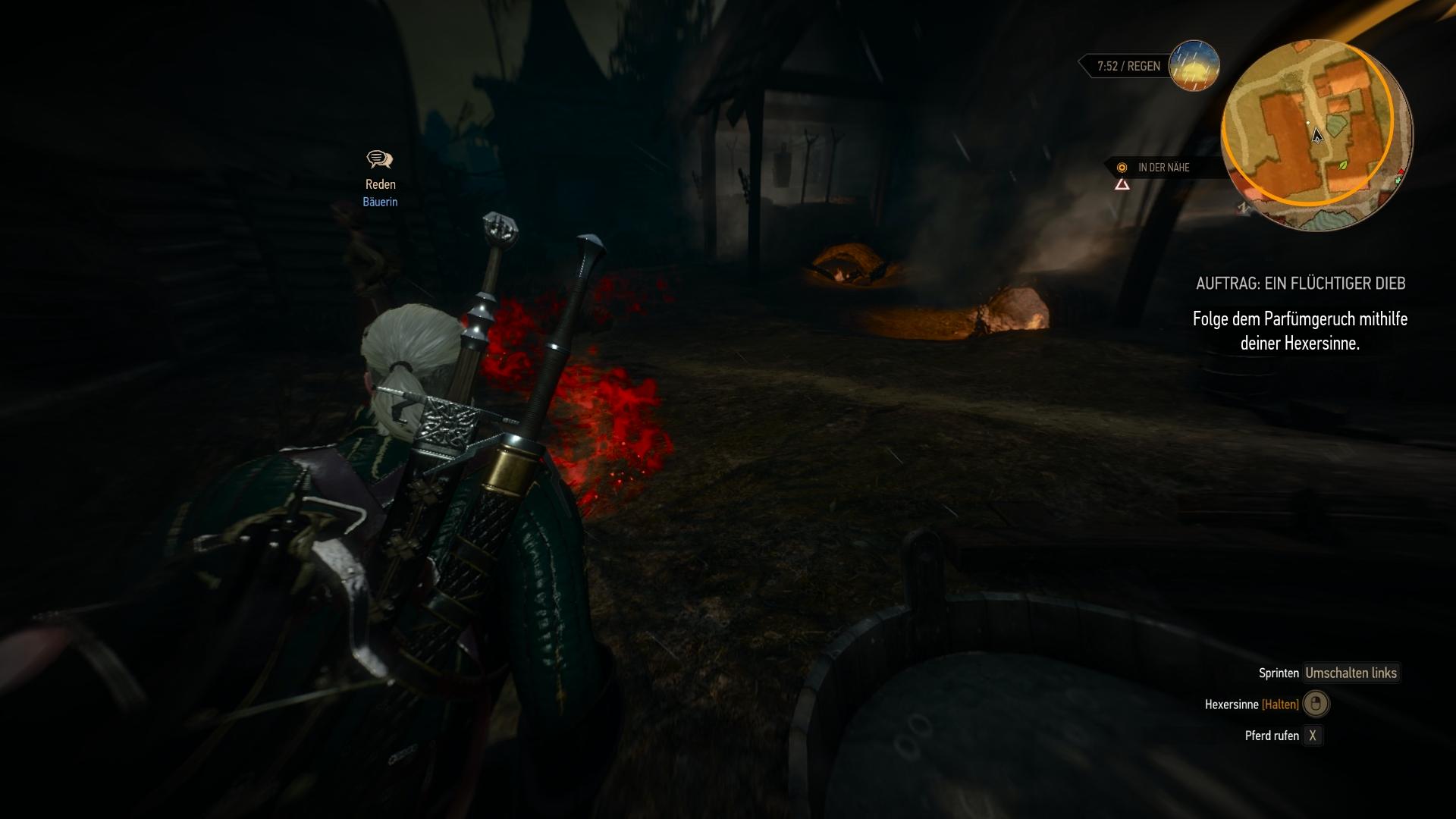 In der offenen Welt können Quests nach belieben gewählt und erledigt werden. Besonders durch MMORPGs wie World of WarCraft ist das Ausrufezeichen-System und das direkte Markieren der Questziele auf der Karte kaum noch weg zu denken. Aber auch in dieser Beziehung hat sich das CD Project Red Team eine sehr gute Lösung einfallen lassen. Die Aktivierung der gewünschten Quest, zeichnet zwar meistens das nächste Ziel auf der Karte ein und deutet sogar den optimalen Weg durch eine punktierte Linie auf der Karte an, wenn es jedoch um das Verfolgen von Spuren geht, greift das System nicht. In dem Moment muss Geralt seine Hexersinne einsetzen, welche die Welt gräulich verwaschen und besondere Objekte farblich hervorheben. Alles benutzbare wird gelb und besondere Questobjekte rot. Das gilt ebenfalls für Duftspuren in der Luft oder Fußabdrücke am Boden, die sich erst abzeichnen, wenn Geralt diese direkt vor sich wahrnimmt. Auf diese Weise müsst ihr tatsächlich noch etwas suchen und nicht für jede Quest einfach den von Punkt A nach B auf der Karte rennen.