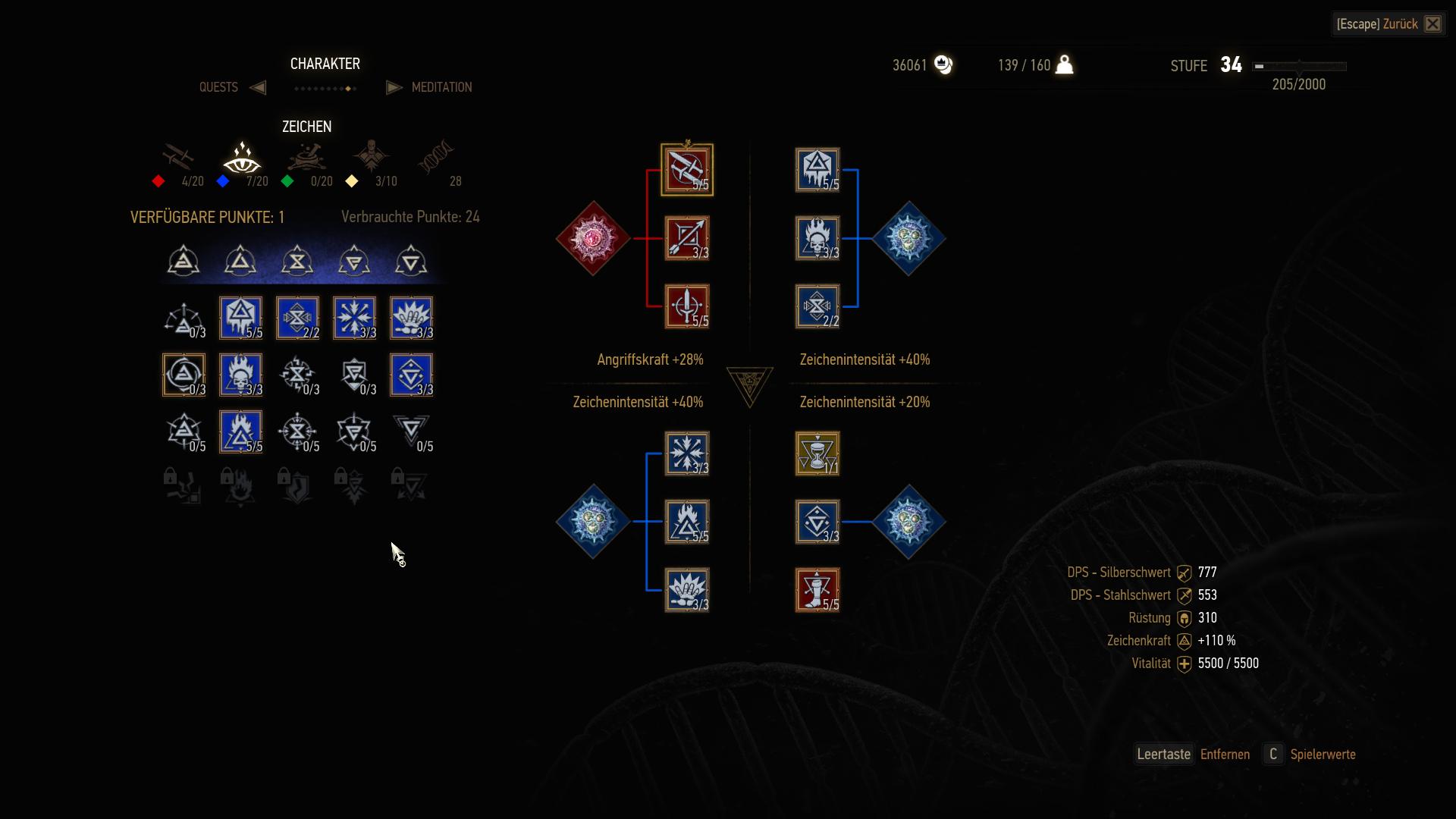 Während sich von vielen Aspekten des Spiels nur schwärmen lässt, ist eines der wenigen Mankos leider das Charaktersystem. Bei jedem Stufenaufstieg erhält Geralt mindestens einen Fertigkeitenpunkt und kann weitere optional durch "Orte der Macht" erlangen. Diese Punkte lassen sich auf insgesamt vier Feritkeitenarten (Kampf, Zeichen, Alchemie und Allgemein) und darin wiederum je fünf Sparten mit jeweils vier Ausbaustufen verteilen. Von denen bis zum Spielende effektiv drei oder vier genutzt werden können. Die dadurch erlernten Fertigkeiten müssen wiederum in einem zweiten System platziert und durch Mutagene verstärkt werden. Während das System selbst gut durchdacht ist, ist der Nutzen davon leider relativ gering. Jeder Punkt verbessert die Fertigkeit leider nur um 1% - 2% und somit ist es fasst egal, ob ihr euch mit der Planung der Fertigkeiten befasst oder nicht. Der Hexer kämpft am Ende fasst genauso wie in den Anfängerschlachten.