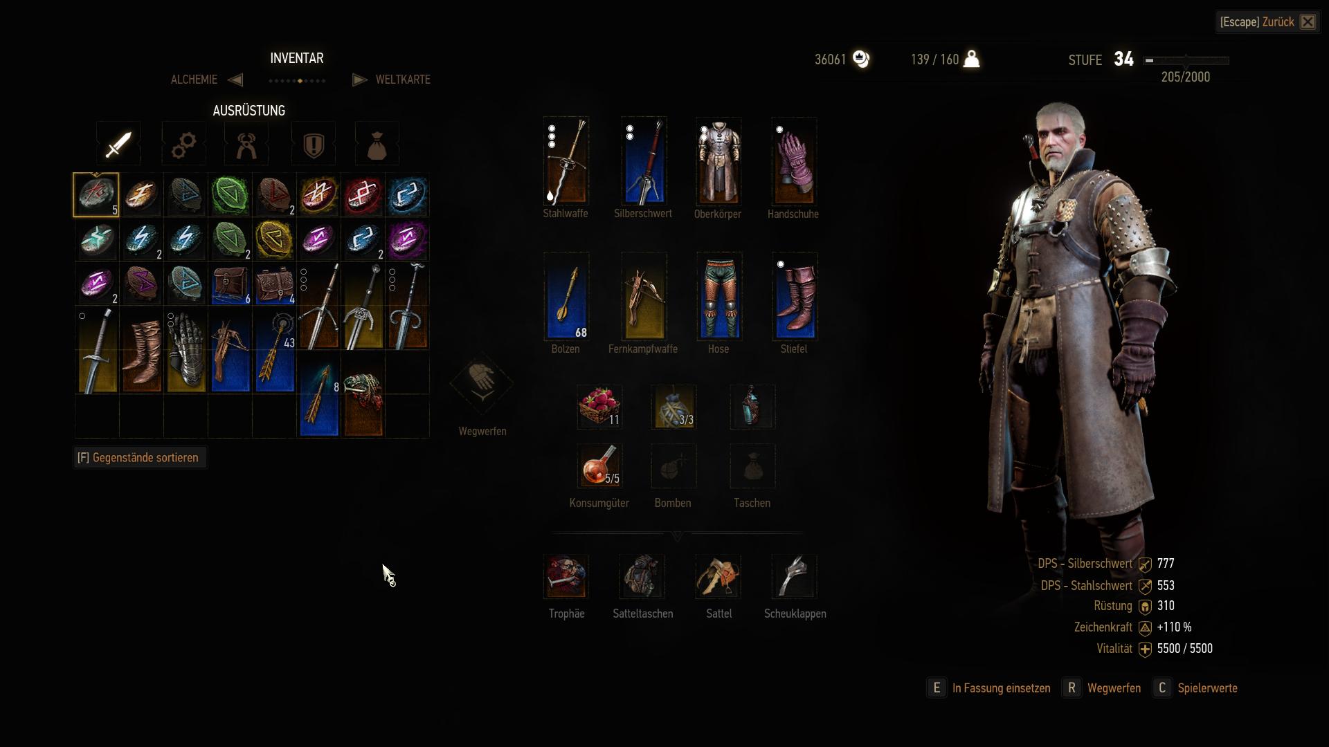 Ausschlaggebend ist in Punkto Schaden lediglich die Ausrüstung bzw. richtige Waffe. Diese steigern sich in Witcher 3 ähnlich wie in vielen MMORPGs. Ausrüstung lässt sich durch Quests gewinnen, bei Händlern kaufen oder per Handwerk anfertigen. Alle drei Wege führen zum selben Ergebnis. Mit den aktuell gefundenen Plänen, könnt ihr genau so starke Waffen anfertigen, wie der Händler sie fertig zum Kauf anbietet, oder die gleichstufige Quest verspricht. Ihr dürft somit stets wählen, was euch am besten zusagt und seid nicht gezwungen euch mit dem Handwerkssystem zu beschäftigen, wenn ihr es nicht wollt. Obendrein bieten hochstufige Gegenstände das übliche Aufwertungssystem, über das sich Glyphen in Waffen und Rüstungen einsetzen lassen, die eigene Angriffe verstärken und feindliche abschwächen.