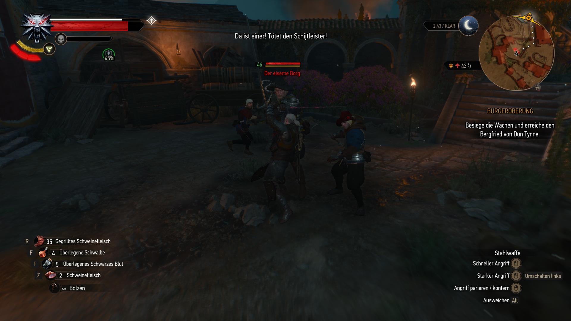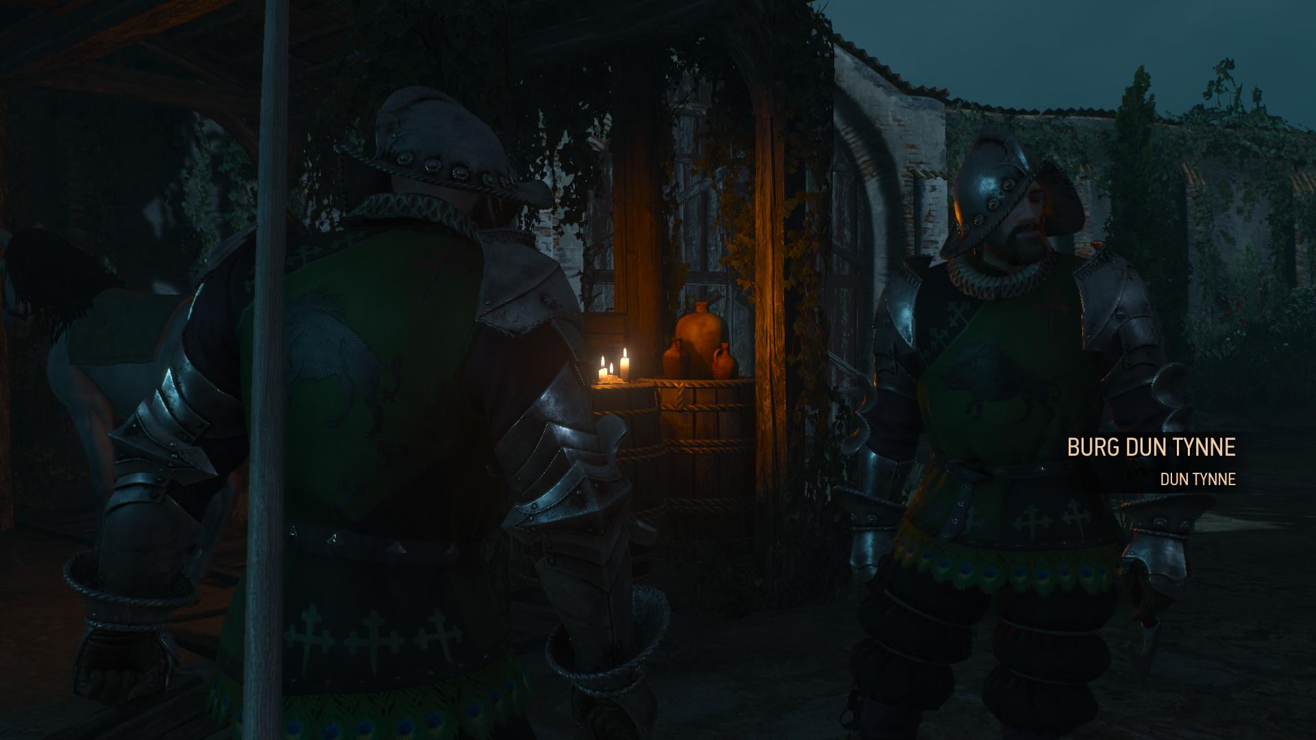 Seid ihr so weit? Dann reitet zur Mühle des Grafen de la Croix am Fluss östlich des Turniergeländes. Damien und Geralt besprechen den Angriffsplan und als nächstes findet ihr euch im Hof der Burg Dun Tynne bei vier Wachen wieder. Nun setzt eine lange Reihe von Kämpfen ein, die nur kurz durch Unterhaltungen unterbrochen wird. In der vierten Gruppe beim Wagen verwundet ihr u.a. den Burgbesitzer Roderick. Sobald alle seine Männer tot sind, bettelt er um Gnade. "Nicht mein Problem" überlässt ihn seinem Schicksal und mit "Ich helfe dir" verbindet Geralt Roderick. Diese Geste bringt euch die "Mitgefühl" (Compassion) Rittertugend für den "Embodiment of the Five Virtues" Erfolg und die "Es kann nur einen geben" Quest ein. Rodericks Antworten auf Geralts Fragen machen wenig Sinn. Es hört sich nicht an, als ob Syanna eine Gefangene wäre.