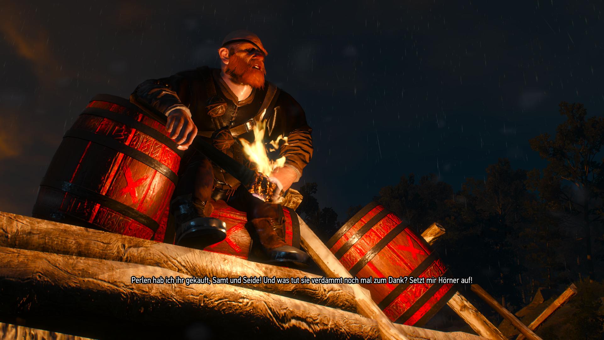 Die erste Aussage "Es tut mir wirklich leid", oder "Tu die Fackel weg. Reden wir drüber" und dann gefolgt von "Du findest eine andere." oder "Vergiss die Sache. Ich hab Arbeit für dich." lassen Casimir ein paar hässliche Worte fluchen, bevor er den Sprengstoff entzündet. - Geralt besiegt Casimir im Kampf