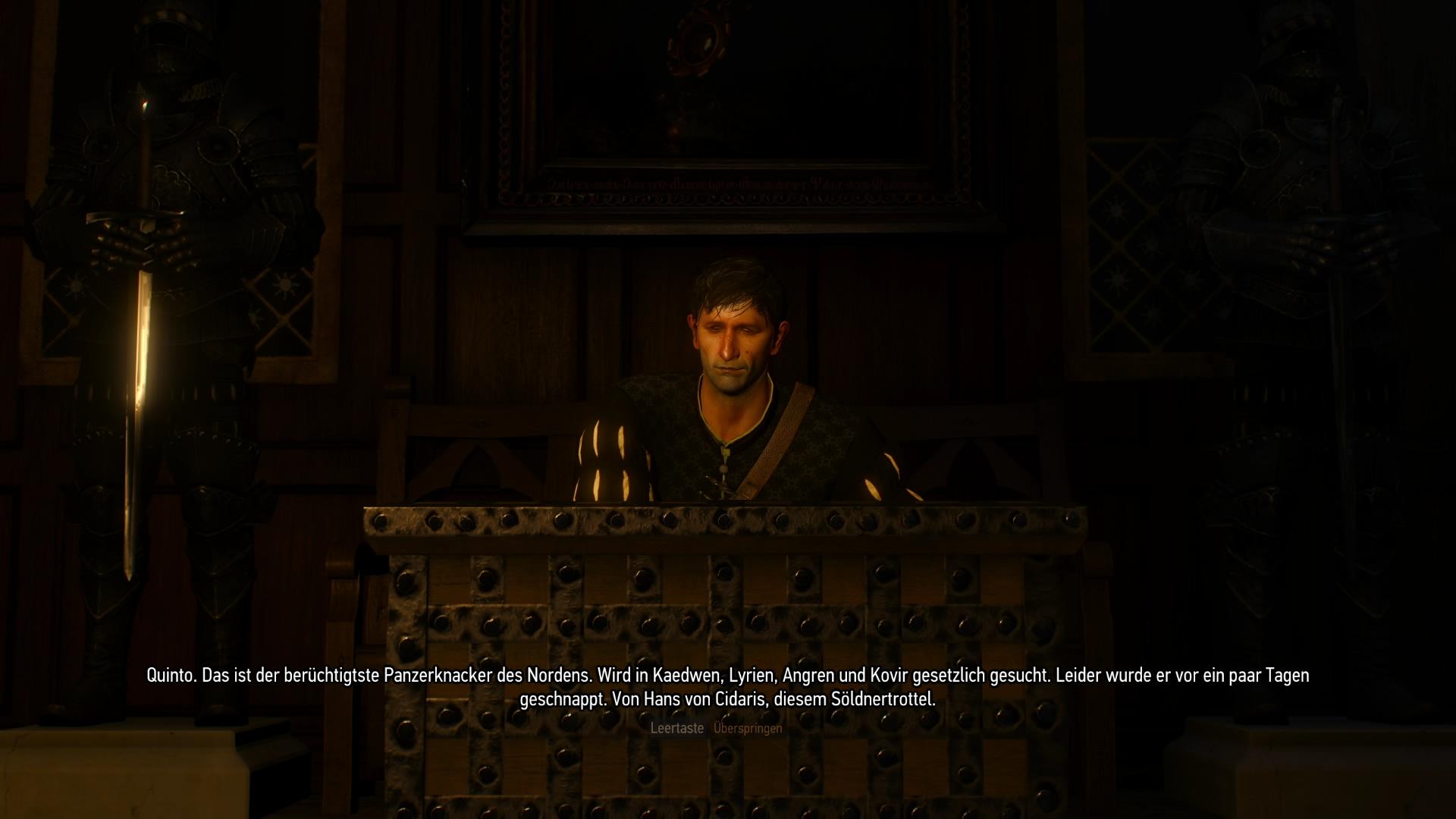 Einbruchskünster Quinto sitzt in einem Käfig im Söldnerlager südöstlich von der Kräuterkundlerhütte, wo ihr den "Die Kreatur aus dem Wald von Oxenfurt" Hexerauftrag bekommt und ist somit nur wenige Sekunden Ritt entfernt. Eine Option für die Täuschung-Fertigkeit gibt es bei Quinto nicht, dafür aber sämtliche andere Variationen: