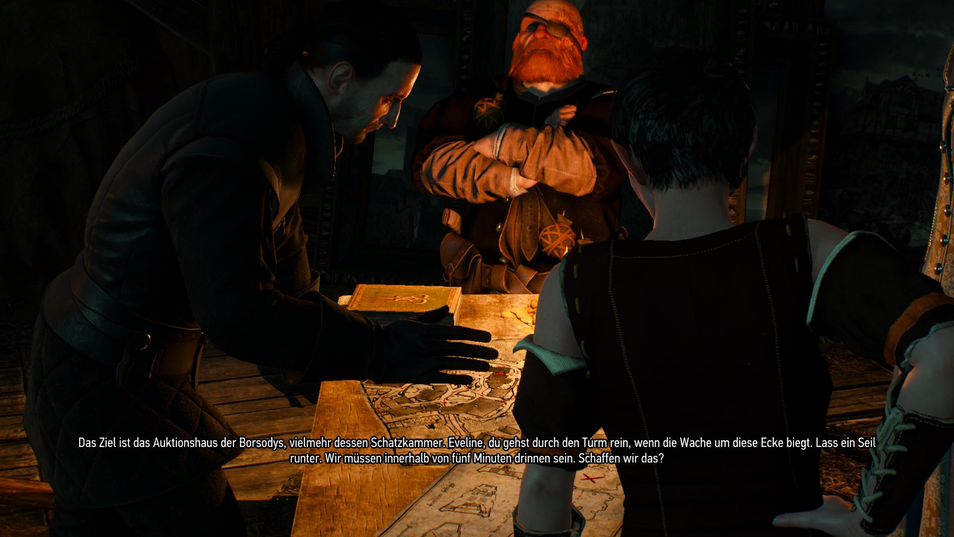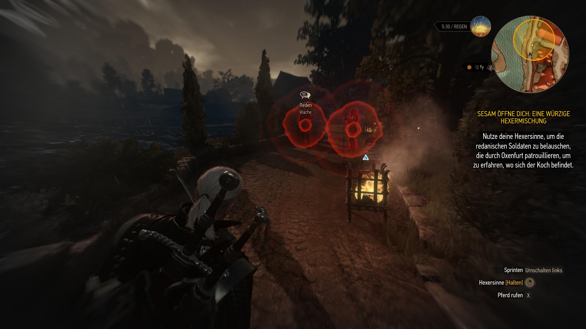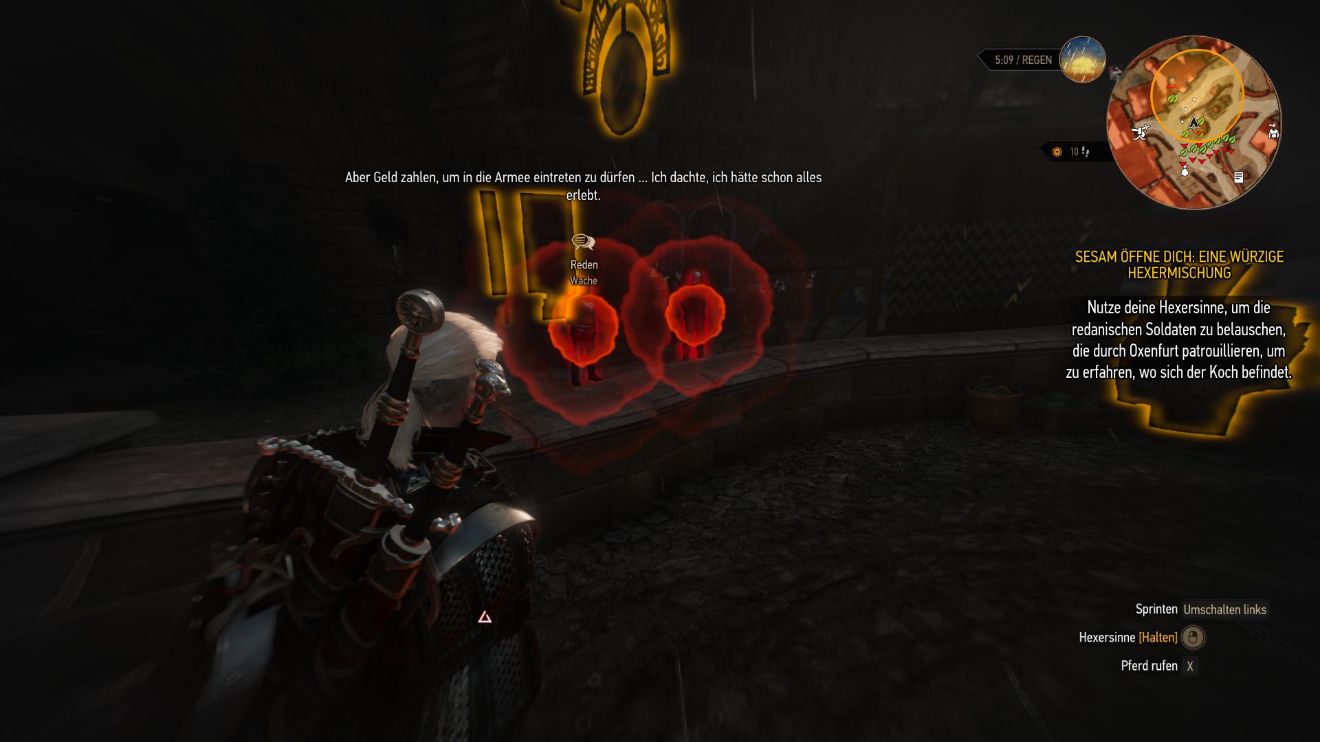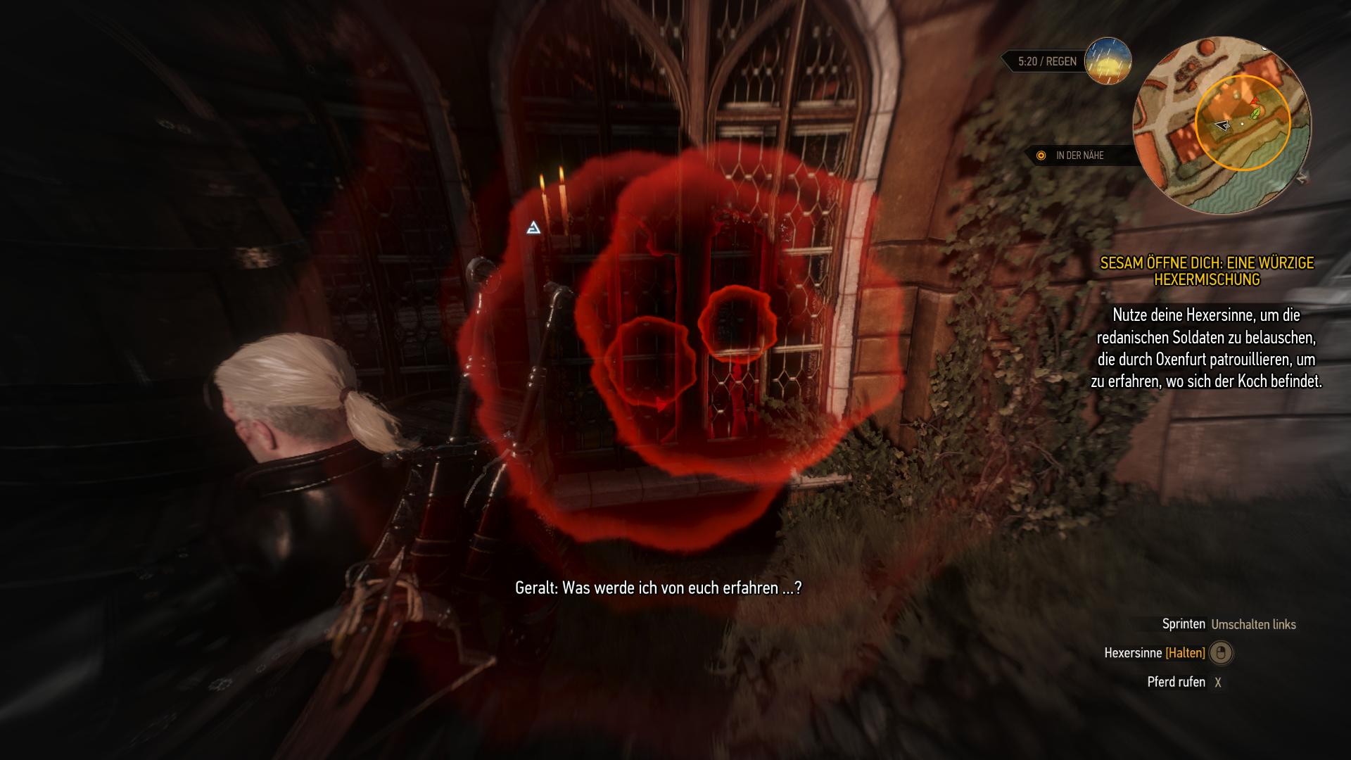Die Reinigungsmixtur fürs Vergiften des Essens, solltet ihr Problemlos im Alchemie Menü herstellen können. Zwergenschnaps, Moderhautblut und Wolfsbann dürftet ihr zu diesem Zeitpunkt des Spiels vermutlich zu Hauf im Inventar haben. Begebt euch damit zurück zum Auktionshaus am Nordende von Oxenfurt und belauscht die Wachen dort. Ihr müsst jeweils an den Rand des markierten Bereichs gehen, eure Hexersinne aktivieren und damit dem Gespräch lauschen. Die ersten Wachen vor dem Auktionshaus reden über andere Dinge, genau wie die zwei Wachen im Haus, die ihr durchs Fenster belauschen könnt. Die Patrouille am Flussufer redet letztlich tatsächlich vom Essen. Am Besten nähert ihr euch dem Paar von Osten, denn das Gespräch bricht ab, wenn ihr zu nah dran seid und sie laufen nach Osten. Sobald sie vom fischenden Koch erzählt haben, könnt ihr den Koch unterhalb der Brücke am Westtor aufsuchen (ist nur tagsüber da). Mit 500 Kronen (50 XP) oder Täuschung (40 XP) lässt er sich überzeugen, die Reinigungsmixtur ins Essen zu mischen. Damit sind alle Vorbereitungen abgeschlossen und ihr könnt zurück zur Hütte des Kräuterkundlers reiten, um den Einbruch durchzuziehen.