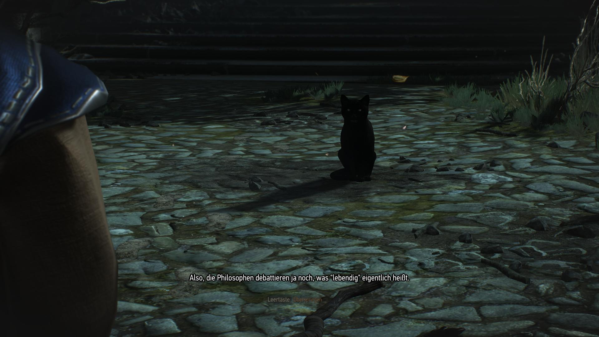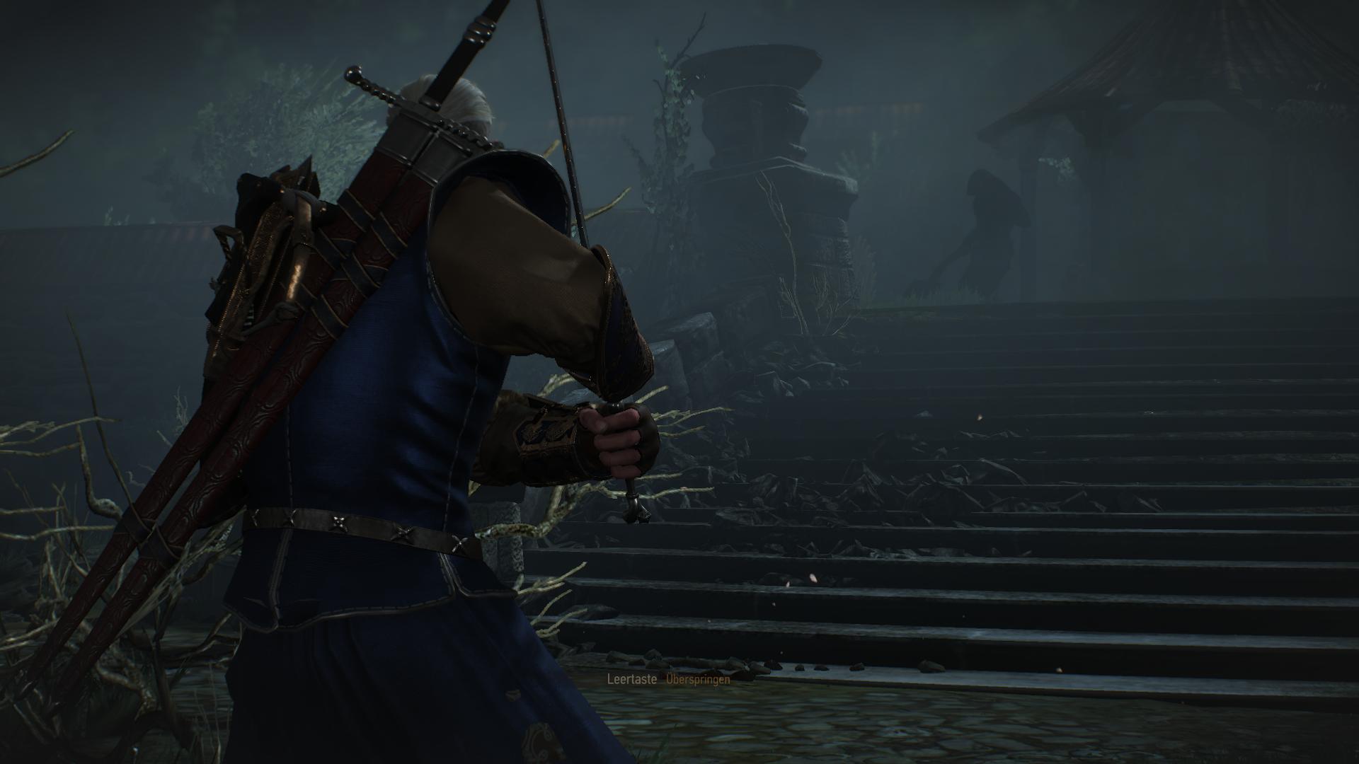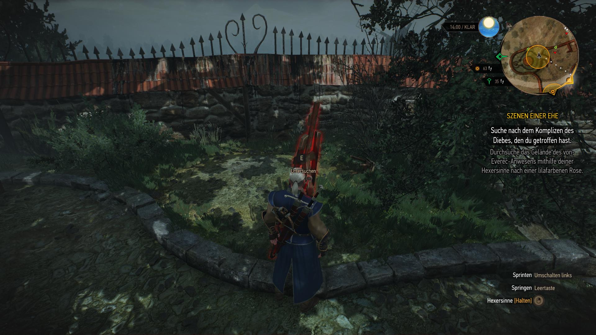 Sobald die seltsame Kreatur dahingeschieden ist, kommen der Schwarze Hund und die Schwarze Katze zu Geralt und erzählen ihm mehr über den Pedell. Sie überreichen euch zudem den Schlüssel zur Hintertür des Anwesens. Schnappt euch nach der Unterhaltung den Spaten des Pedells vom Leichnam und aus dem zerfallenen südöstlichen Pavillon die "verzierte Bürste".