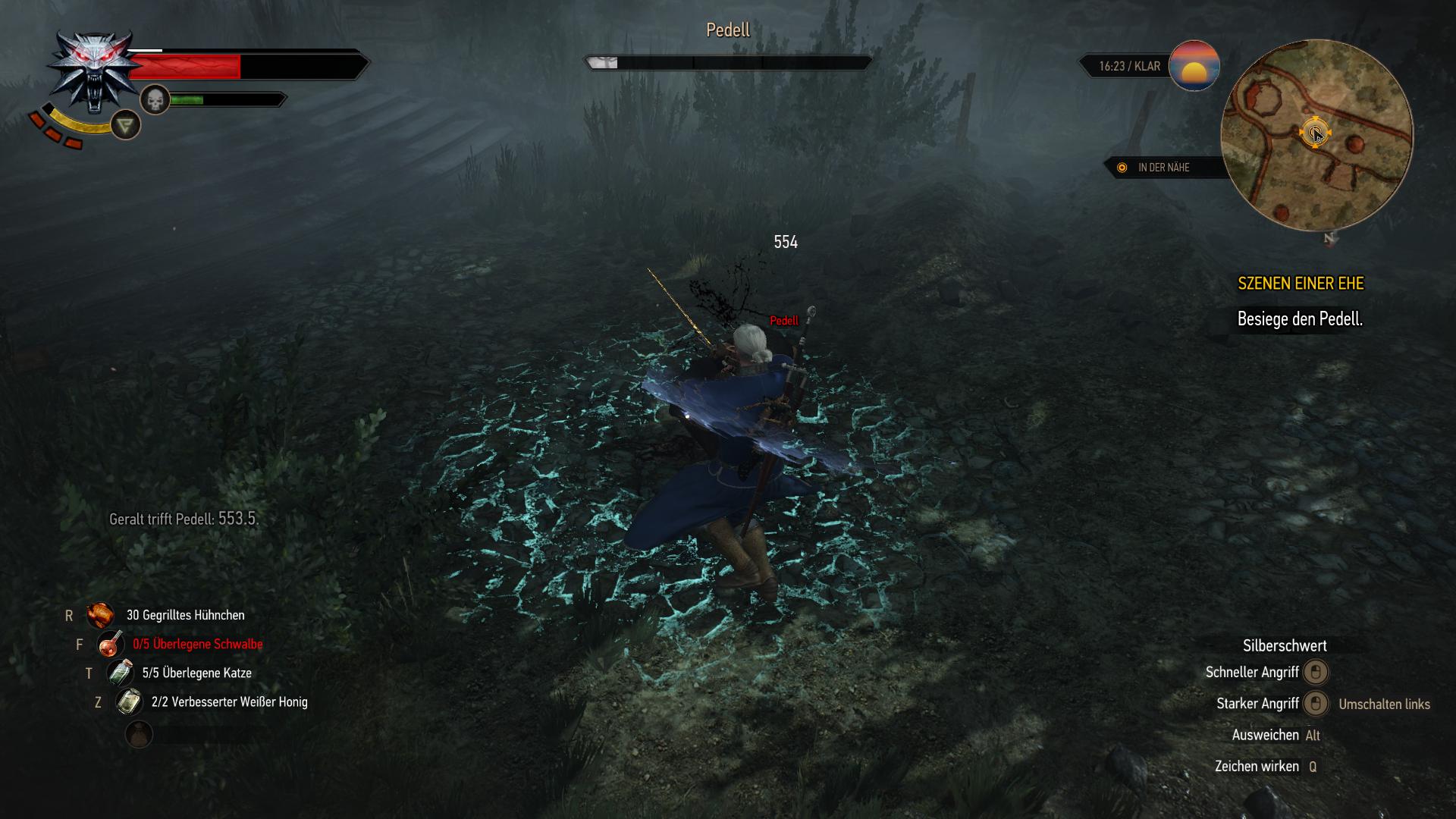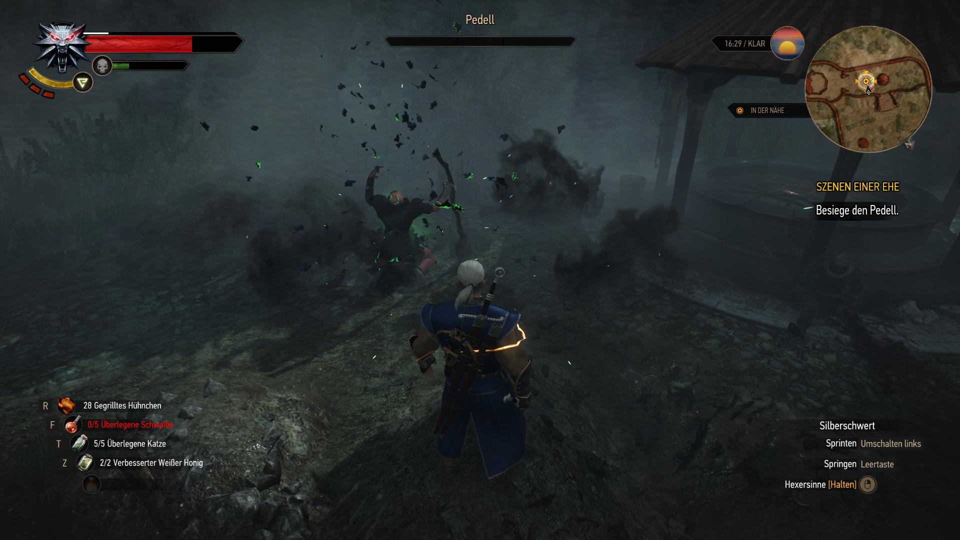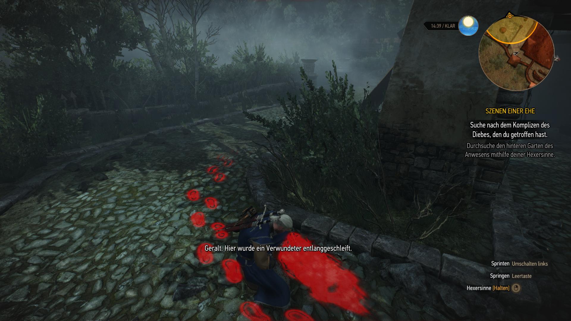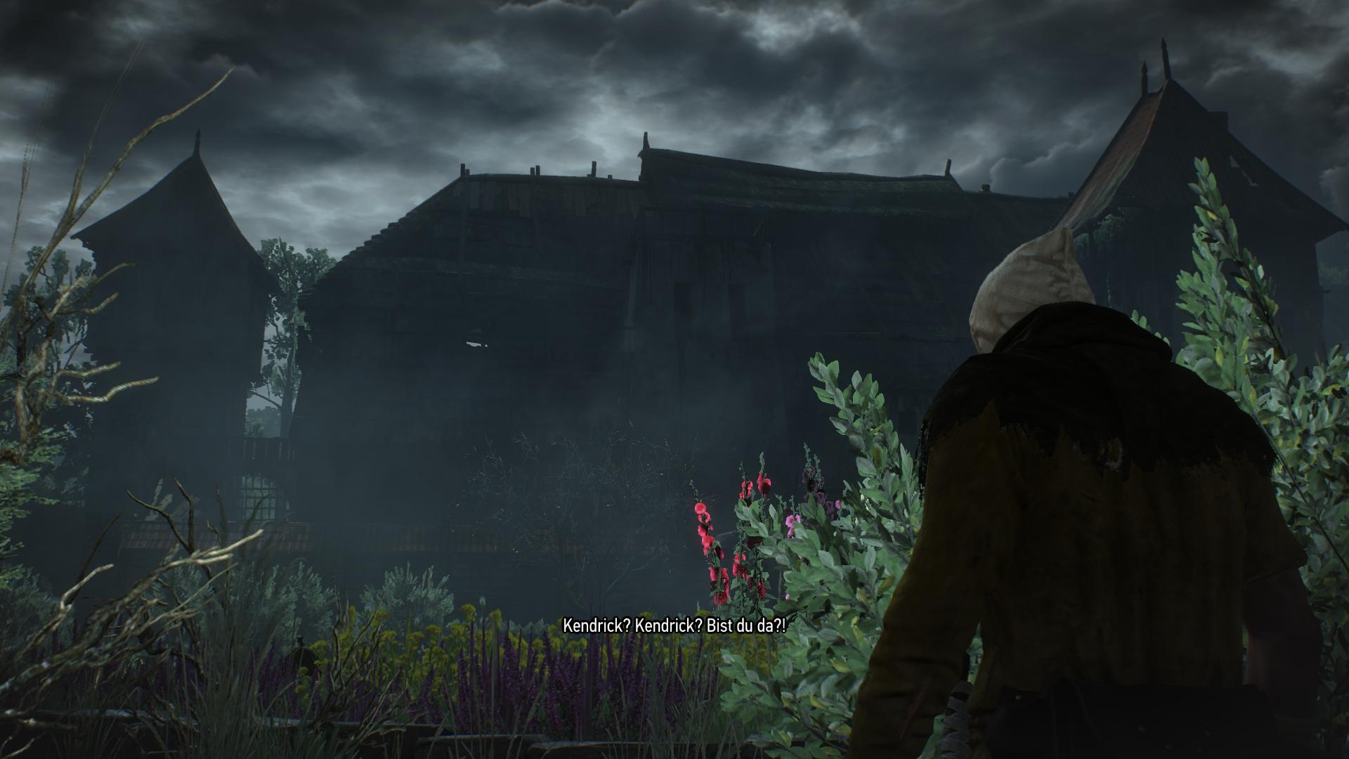 Sobald die seltsame Kreatur dahingeschieden ist, kommen der Schwarze Hund und die Schwarze Katze zu Geralt und erzählen ihm mehr über den Pedell. Sie überreichen euch zudem den Schlüssel zur Hintertür des Anwesens. Schnappt euch nach der Unterhaltung den Spaten des Pedells vom Leichnam und aus dem zerfallenen südöstlichen Pavillon die "verzierte Bürste".