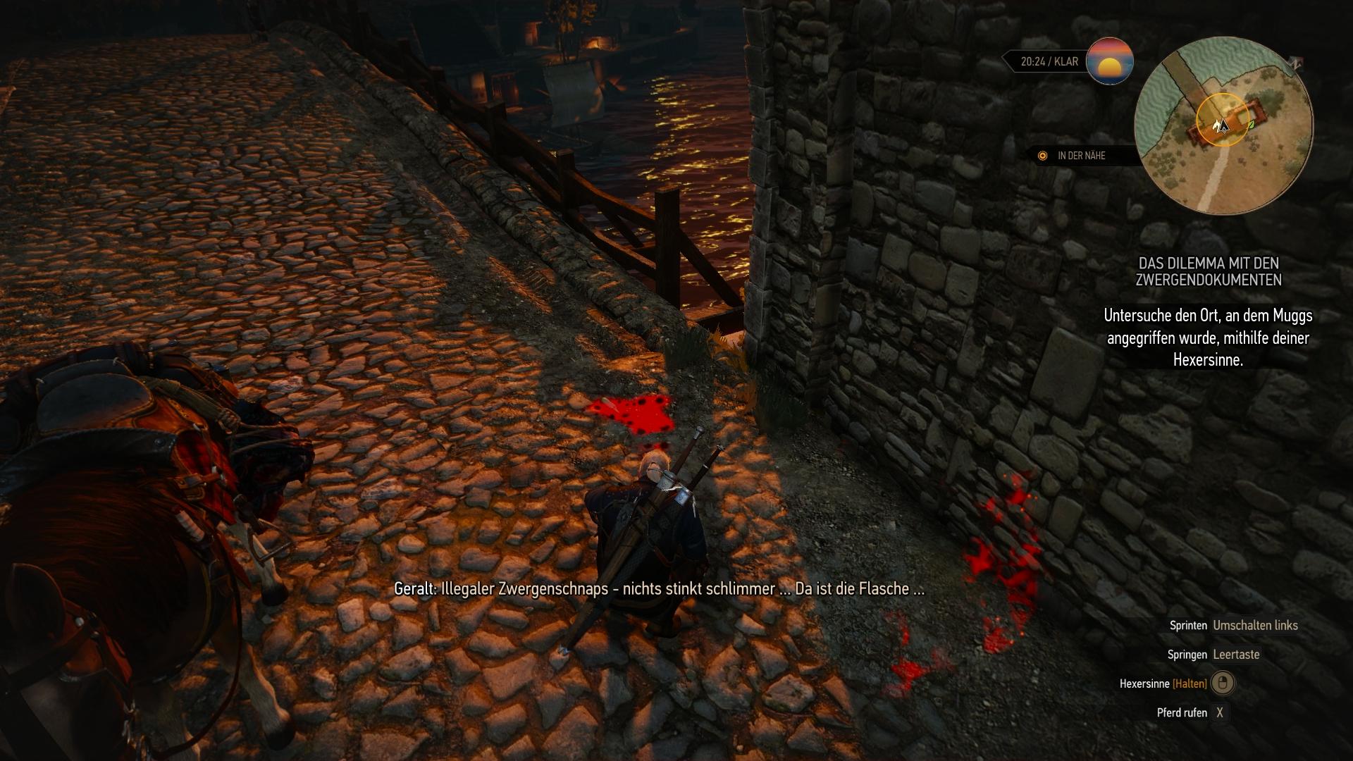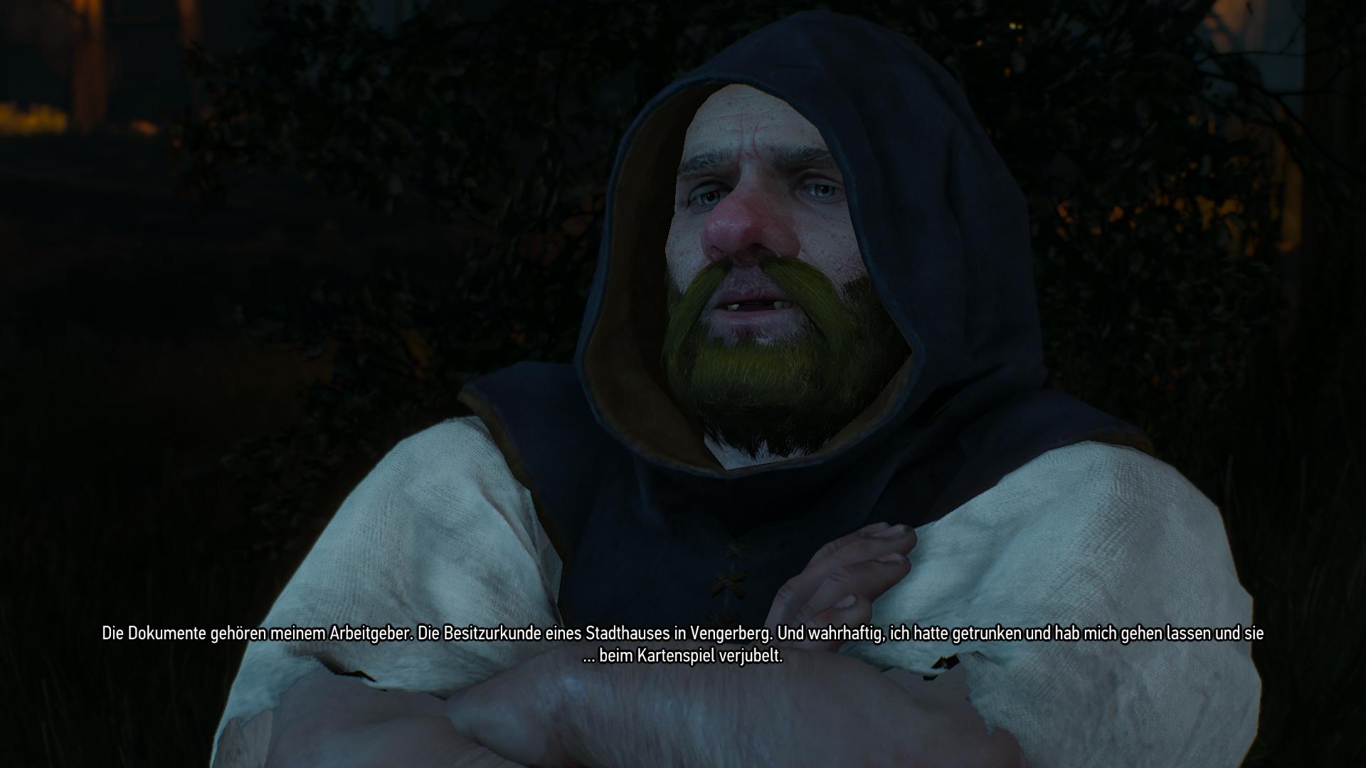 An der Brücke am Nordostrand von Novigrad [19] steht ein Zwerg, der Hilfe in einer ernsten Sache braucht. Rostan Muggs wurde angeblich am anderen Flussufer überfallen. Jemand hat ihm eine Flasche Zwergenschnaps über den Schädel gezogen und sich dann mit wichtigen Dokumenten aus dem Staub gemacht. Nehmt ihr den Auftrag an, müsst ihr rüber zum anderen Ende der Brücke laufen. Dort, unter der Unterführung bei den Wachen, findet ihr die erwähnte zerbrochene Flasche und eine intensive Duftspur. Sie führt euch südlich zu Axel vor der Sieben Katzen Taverne. Als ihr ihn einen Dieb nennt, erzählt er eine ganz andere Geschichte. Laut seiner Aussage, hat er die Dokumente beim Kartenspiel gewonnen. Es bieten sich euch drei Möglichkeiten, die Dokumente trotzdem zurück zu bekommen: