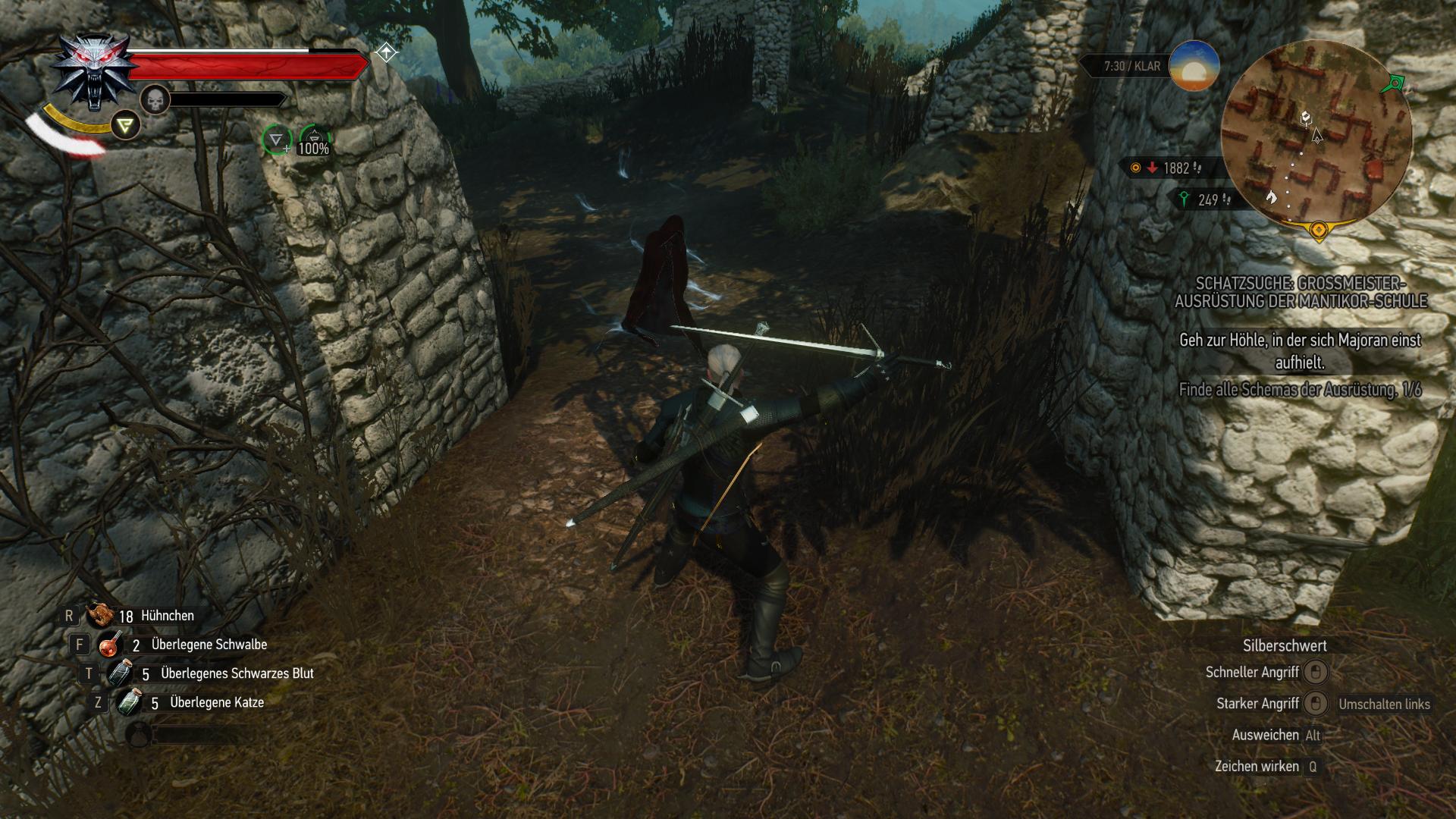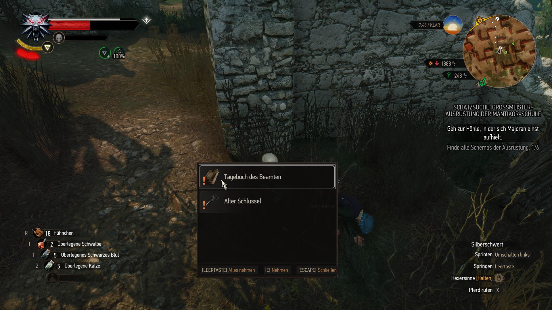 Am Fuße der Gorgo stieß Geralt auf düstere, unheilverkündende Ruinen. Die gedachte er zu erkunden. Nicht lange, und er stolperte über eine Leich. Wie üblich durchsuchte er den Leichnam auf irgendwelche Schriftstücke, die Licht auf die Todesumstände werfen konnten. Auch diesmal zahlte sich diese Gewohnheit aus. Er fand ein Tagebuch und einen Schlüssel ...